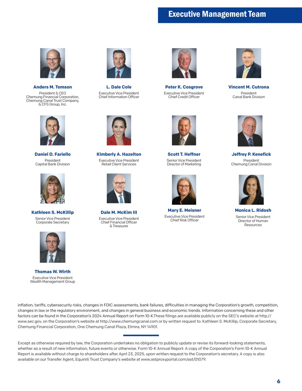 通货膨胀、关税、网络安全风险、FDIC评估的变化、银行倒闭、管理公司增长的困难、竞争、法律或监管环境的变化,以及一般商业和经济趋势的变化。有关这些因素和其他因素的信息可在公司2024年年度报告的10-K表格中找到。这些文件可在SEC网站http://www.sec.gov、公司网站http://www.chemungcanal.com上公开查阅,或通过书面请求向:Kathleen S. McKillip,公司秘书,Chemung Financial Corporation,One Chemung Canal Plaza,Elmira,NY 14901。除法律另有要求外,公司不承担因新信息、未来事件或其他原因而公开更新或修改其前瞻性陈述的义务。10-K表格年度报告:公司的10-K表格年度报告副本可在2025年4月23日之后免费提供给股东,应向公司秘书提出书面要求。我们的转让代理Equiniti Trust Company的网站www.astproxyportal.com/ast/01079上也提供了一份副本。6 Dale M. McKim III执行副总裁首席财务官兼财务主管Kathleen S. McKillip高级副总裁公司秘书执行管理团队Anders M. Tomson总裁兼首席执行官Chemung Financial Corporation、Chemung Canal Trust Company和CFS Group,Inc. Peter K. Cosgrove执行副总裁首席信贷官Vincent M. Cutrona Canal Bank Division总裁Daniel D. Fariello Capital银行 Division执行副总裁丨Kimberly A. Hazelton 丨Kimberly A. Hazelton零售客户服务执行副总裁Scott T. Heffner高级副总裁营销总监丨Jeffrey P. Kenefick Jeffrey P. Kenefick总裁Chemung Canal Division Mary E. Meisner执行副总裁首席风险官Monica L. Ridosh人力资源高级副总裁总监Thomas W. Wirth Wealth Management Group执行副总裁L. Dale Cole执行副总裁首席信息官