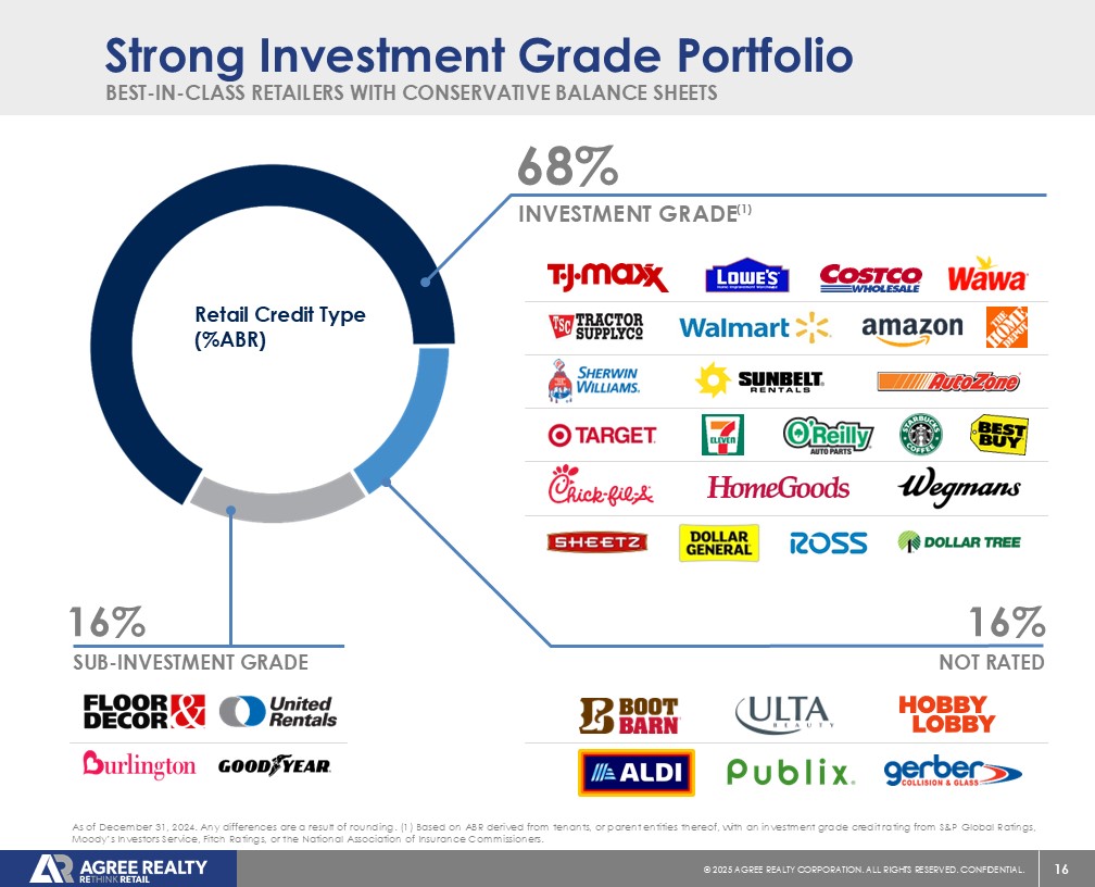 15©2025同意房地产公司。保留所有权利。机密。占年化基本租金租户总数的百分比/概念6.3% $ 37.7 4.7% 28.24.6% 27.6 3.4% 20.43.2% 19.13.2% 18.8 3.1% 18.2 3.0% 17.9 2.9% 17.1 2.8% 17.0 2.8% 16.4 2.4% 14.2 2.3% 13.8 2.2% 13.4 2.2% 13.1 1.9% 11.6 1.7% 9.9 1.6% 9.645.7% 272.1其他100.0% $ 596.1总的艾格里不动产快照%占年化基本租金租户部门总数的9.4% $ 56.1杂货店9.3% 55.3家装8.3% 49.2轮胎和汽车服务7.7% 46.1便利店7.5% 44.6美元店6.1% 36.6折扣-价格零售5.7%30.0 Farm & Rural Supply 4.0% 23.8 Pharmacy 31.4% 187.2 Other 100.0% $ 596.1 total $ 70.45股价(1)76亿美元股权市值(1)(2)2,370物业count(1)4.9x/3.6x(3)净债务与EBITDA之比68.2%投资级%(1)(4)公司概况截至2024年9月30日的主要租户(百万美元)主要零售部门(百万美元),除非另有说明。任何差异都是四舍五入的结果。(1)截至2024年12月31日止。(2)Ref lects普通股和已发行OP单位乘以截至2024年12月31日的收盘价。(3)截至2024年9月30日公司未偿还远期权益结算的备考。(4)有关公司对投资级别的定义,请参见幻灯片16的脚注1。