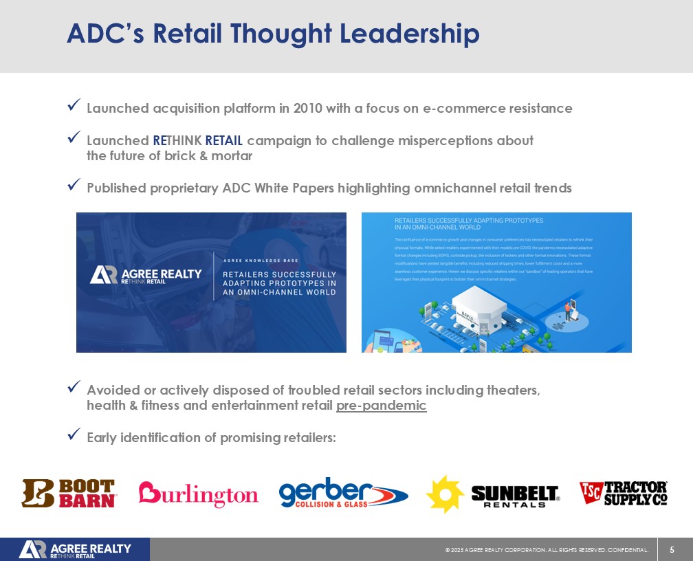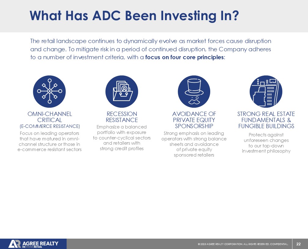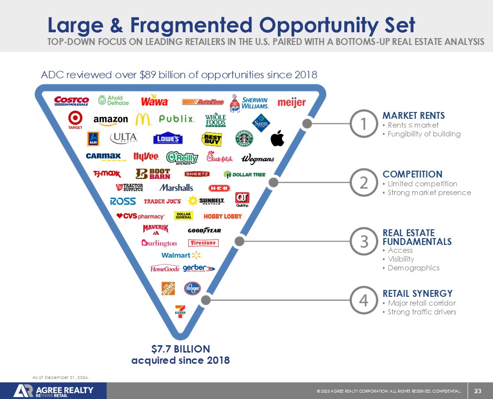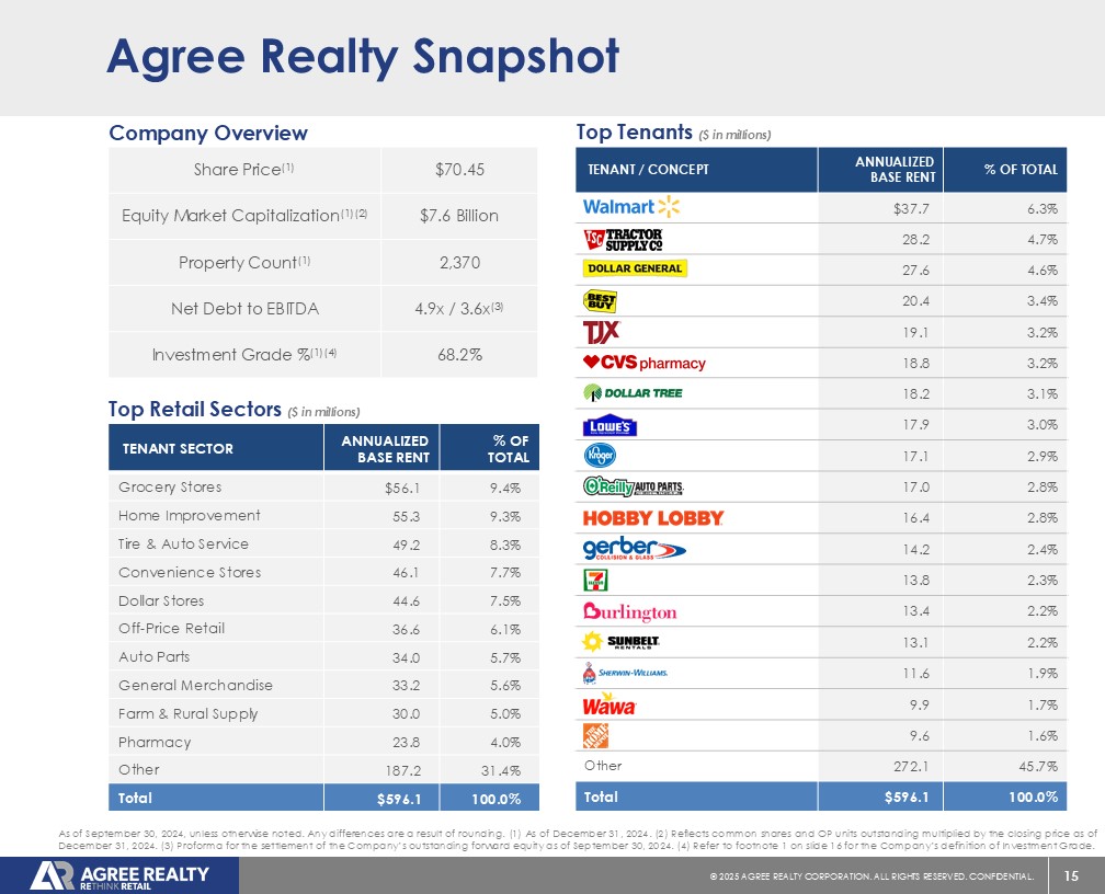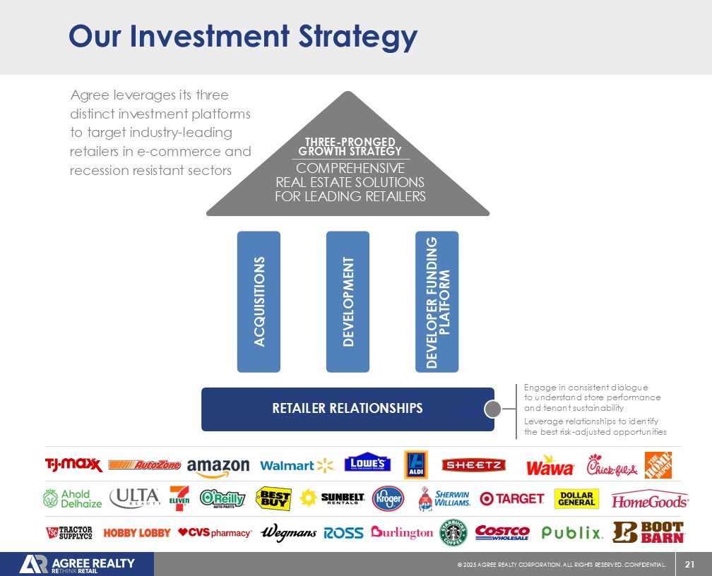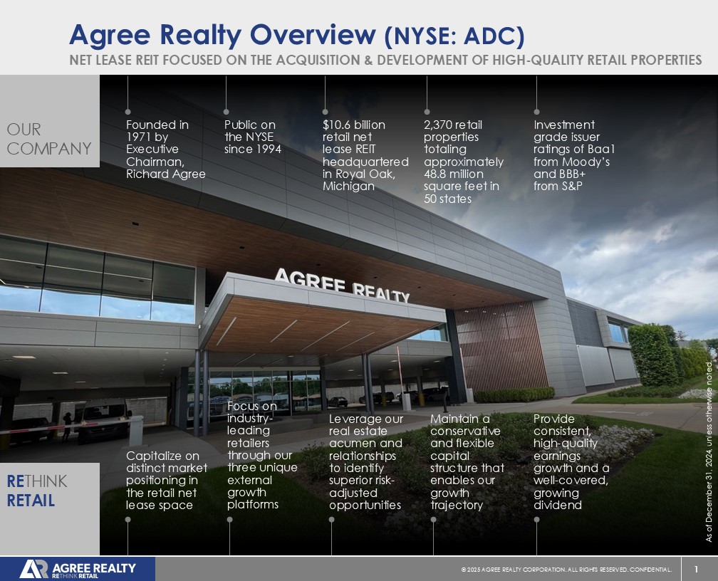 1©2025同意房地产公司。保留所有权利。机密。艾格里不动产概览(纽约证券交易所代码:ADC)我们的公司净租赁REIT专注于收购和开发高质量的零售物业,该公司由执行主席、Richard Agree于1971年创立,自1994年以来在纽约证券交易所上市,总部位于皇家橡树,价值106亿美元的零售净租赁REIT,密歇根州50个州的2,370处零售物业,总面积约4880万平方英尺投资级发行人评级为穆迪的Baa1和标普的BBB + RE THINK RETAIL利用零售净租赁空间中独特的市场定位专注于行业领先的零售商,通过我们三个独特的外部增长平台,利用我们的房地产敏锐度和关系,识别经风险调整后的优越机会。维持保守和灵活的资本结构,使我们的增长轨迹能够提供持续、高质量的盈利增长以及覆盖良好、不断增长的股息,截至2024年12月3日,1,除非另有说明。