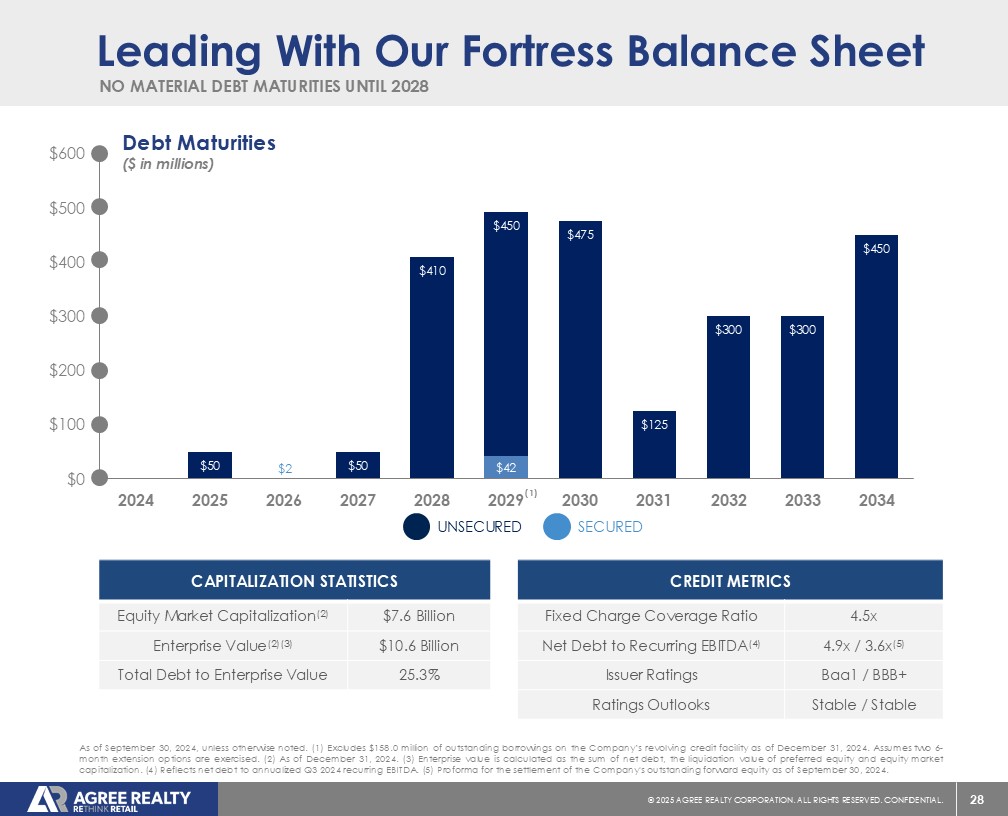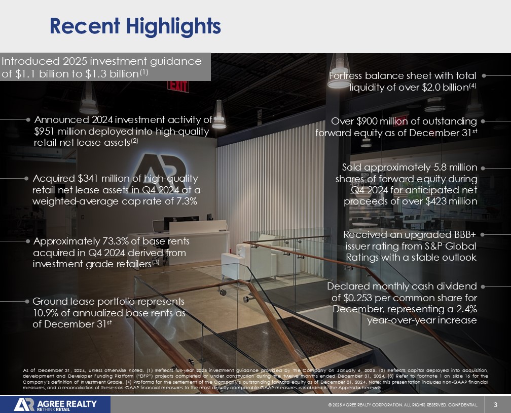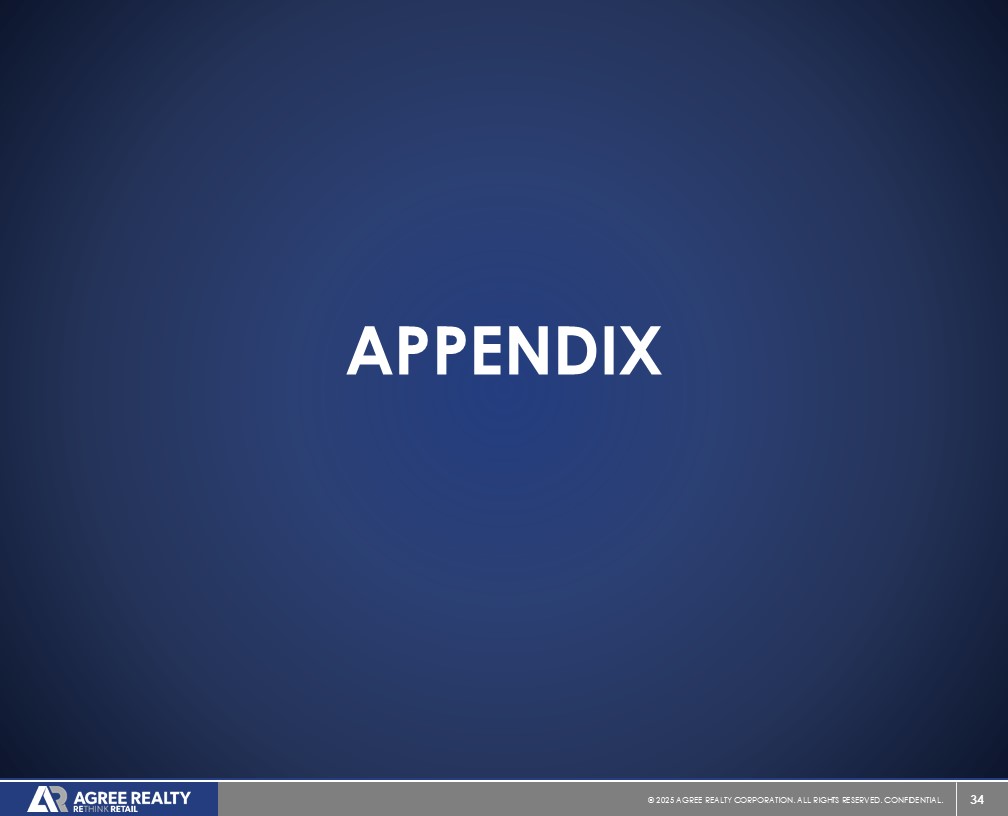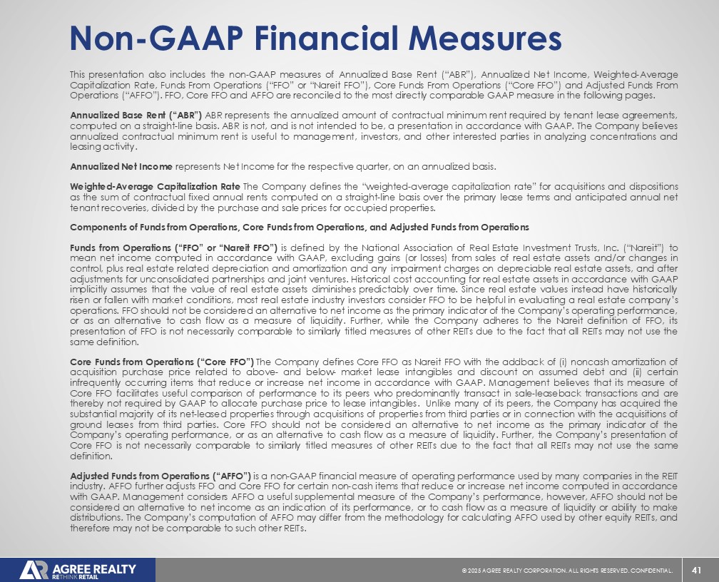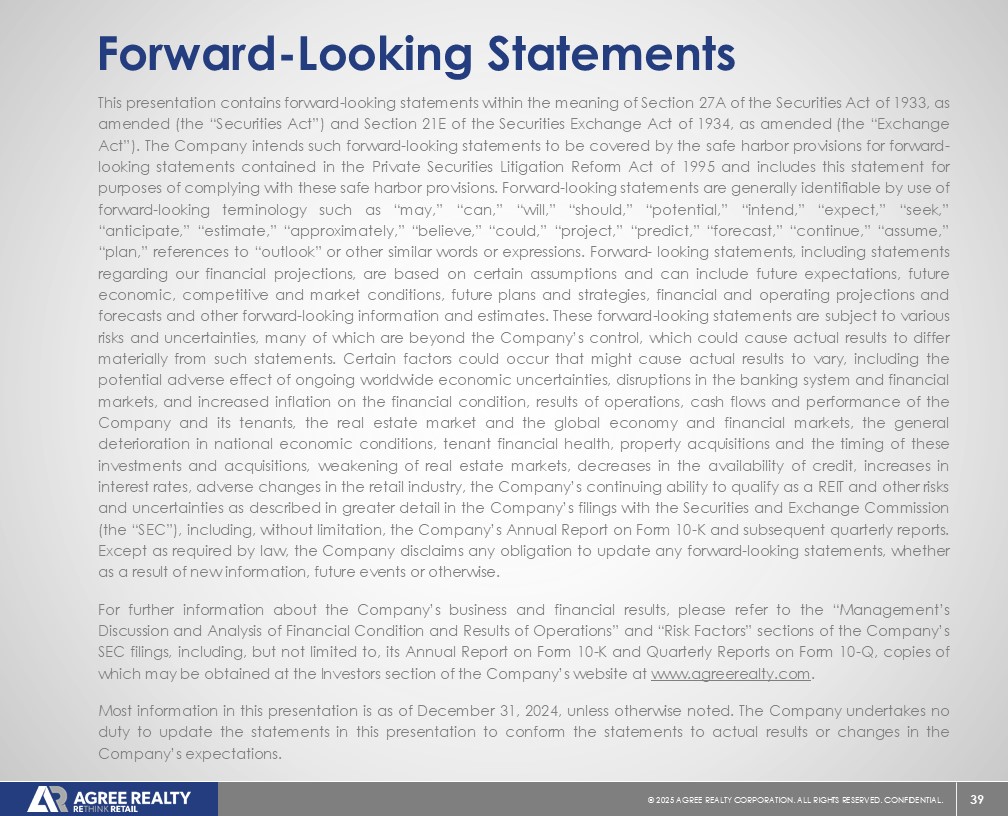 39©2025同意房地产公司。保留所有权利。机密。前瞻性陈述本演示文稿包含经修订的1933年证券法第27A条(“证券法”)和经修订的1934年证券交易法第21E条(“交易法”)含义内的前瞻性陈述。公司打算将此类前瞻性陈述纳入1995年《私人证券诉讼改革法案》所载前瞻性陈述的安全港条款,并将此陈述包括在内,以遵守这些安全港条款。前瞻性陈述通常可以通过使用前瞻性术语来识别,例如“可能”、“可以”、“将”、“应该”、“潜在”、“打算”、“预期”、“寻求”、“预期”、“估计”、“大约”、“相信”、“可能”、“项目”、“预测”、“预测”、“继续”、“假设”、“计划”、提及“展望”或其他类似的词语或表达方式。前瞻性陈述,包括关于我们财务预测的陈述,是基于某些假设,可以包括未来预期、未来经济、竞争和市场状况、未来计划和战略、财务和运营预测和预测以及其他前瞻性信息和估计。这些前瞻性陈述受到各种风险和不确定性的影响,其中许多风险和不确定性超出了公司的控制范围,这可能导致实际结果与此类陈述存在重大差异。可能会出现某些可能导致实际结果不同的因素,包括持续的全球经济不确定性、银行体系和金融市场的混乱、通货膨胀加剧对公司及其租户的财务状况、经营业绩、现金流和业绩、房地产市场以及全球经济和金融市场的潜在不利影响、国家经济状况普遍恶化、租户财务状况健康、房地产收购以及这些投资和收购的时机、房地产市场疲软、信贷供应减少、利率上升,零售行业的不利变化、公司有资格成为REIT的持续能力以及公司提交给美国证券交易委员会(“SEC”)的文件中更详细描述的其他风险和不确定性,包括但不限于公司的10-K表格年度报告和随后的季度报告。除法律要求外,公司不承担任何更新任何前瞻性陈述的义务,无论是由于新信息、未来事件或其他原因。有关公司业务和财务业绩的进一步信息,请参阅公司提交给美国证券交易委员会的文件中的“管理层对财务状况和经营业绩的讨论和分析”和“风险因素”部分,包括但不限于其关于表格10-K的年度报告和表格10-Q的季度报告,其副本可在公司网站www.agreerealty.com的投资者部分获得。除非另有说明,本演示文稿中的大多数信息截至2024年12月31日。公司不承担更新本演示文稿中的报表以使报表符合实际结果或公司预期变化的义务。