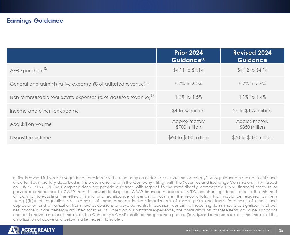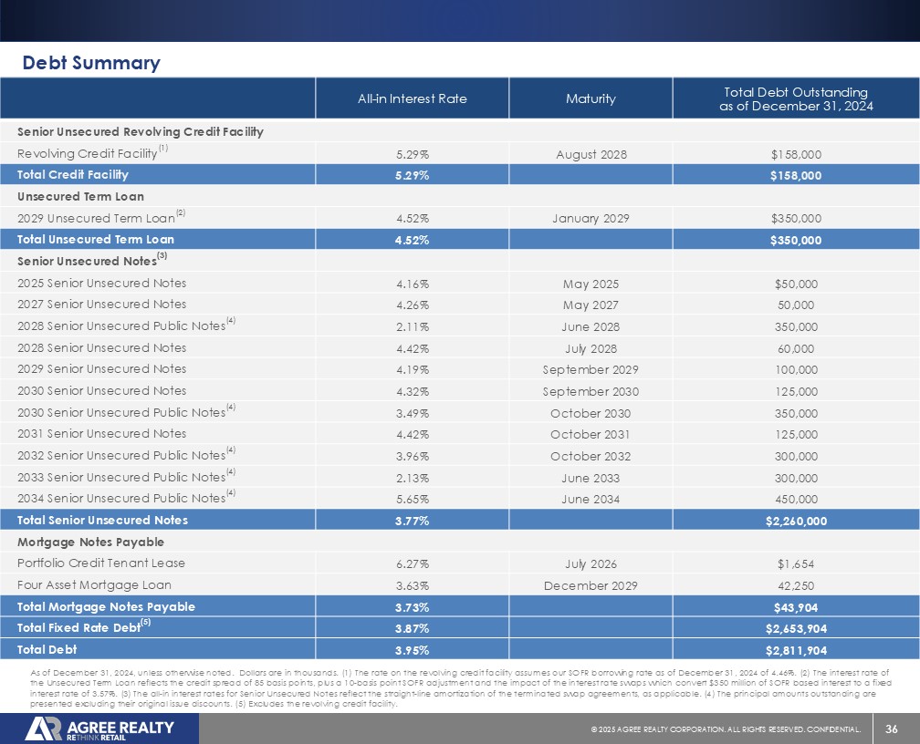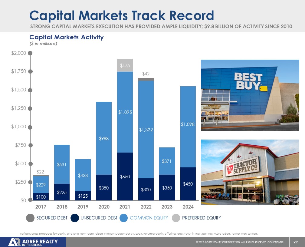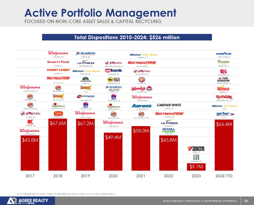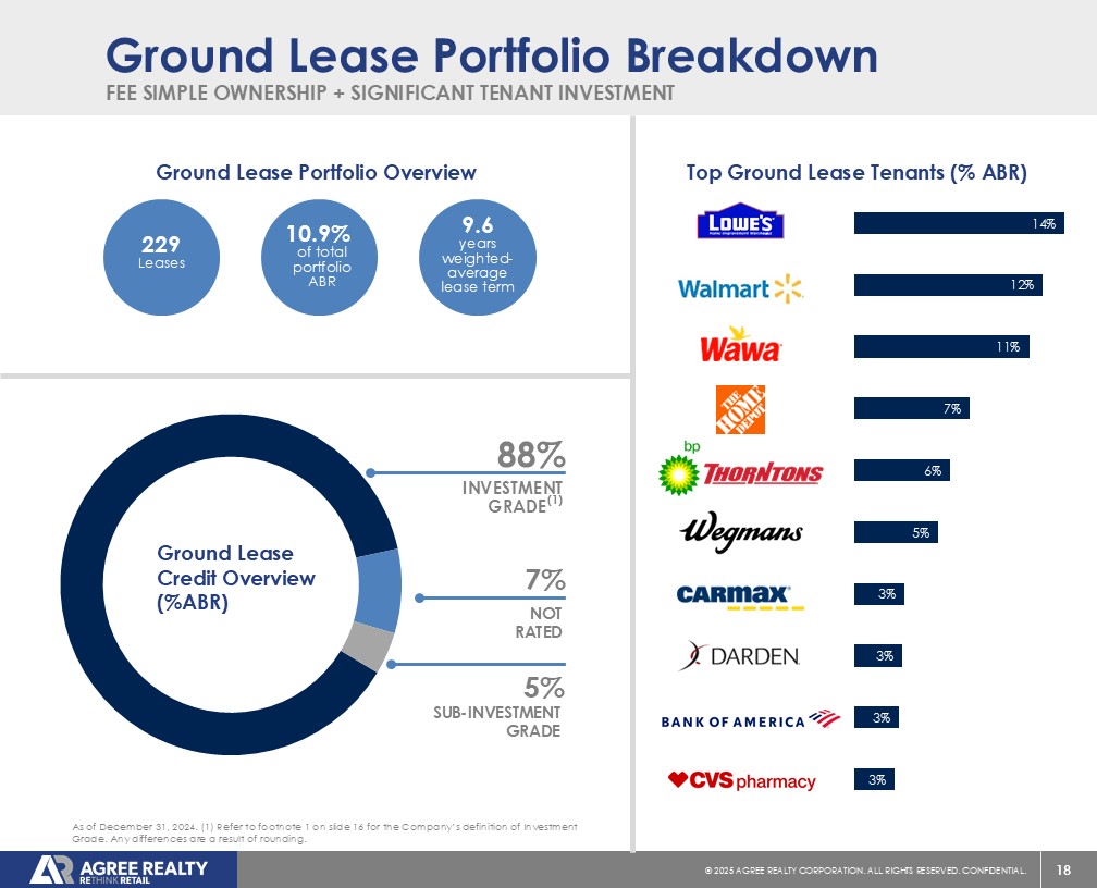 39©2025同意房地产公司。保留所有权利。机密。前瞻性陈述本演示文稿包含经修订的1933年证券法第27A条(“证券法”)和经修订的1934年证券交易法第21E条(“交易法”)含义内的前瞻性陈述。公司打算将此类前瞻性陈述纳入1995年《私人证券诉讼改革法案》所载前瞻性陈述的安全港条款,并将此陈述包括在内,以遵守这些安全港条款。前瞻性陈述通常可以通过使用前瞻性术语来识别,例如“可能”、“可以”、“将”、“应该”、“潜在”、“打算”、“预期”、“寻求”、“预期”、“估计”、“大约”、“相信”、“可能”、“项目”、“预测”、“预测”、“继续”、“假设”、“计划”、提及“展望”或其他类似的词语或表达方式。前瞻性陈述,包括关于我们财务预测的陈述,是基于某些假设,可以包括未来预期、未来经济、竞争和市场状况、未来计划和战略、财务和运营预测和预测以及其他前瞻性信息和估计。这些前瞻性陈述受到各种风险和不确定性的影响,其中许多风险和不确定性超出了公司的控制范围,这可能导致实际结果与此类陈述存在重大差异。可能会出现某些可能导致实际结果不同的因素,包括持续的全球经济不确定性、银行体系和金融市场的混乱、通货膨胀加剧对公司及其租户的财务状况、经营业绩、现金流和业绩、房地产市场以及全球经济和金融市场的潜在不利影响、国家经济状况普遍恶化、租户财务状况健康、房地产收购以及这些投资和收购的时机、房地产市场疲软、信贷供应减少、利率上升,零售行业的不利变化、公司有资格成为REIT的持续能力以及公司提交给美国证券交易委员会(“SEC”)的文件中更详细描述的其他风险和不确定性,包括但不限于公司的10-K表格年度报告和随后的季度报告。除法律要求外,公司不承担任何更新任何前瞻性陈述的义务,无论是由于新信息、未来事件或其他原因。有关公司业务和财务业绩的进一步信息,请参阅公司提交给美国证券交易委员会的文件中的“管理层对财务状况和经营业绩的讨论和分析”和“风险因素”部分,包括但不限于其关于表格10-K的年度报告和表格10-Q的季度报告,其副本可在公司网站www.agreerealty.com的投资者部分获得。除非另有说明,本演示文稿中的大多数信息截至2024年12月31日。公司不承担更新本演示文稿中的报表以使报表符合实际结果或公司预期变化的义务。