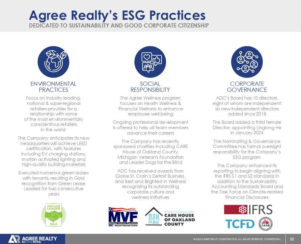 32©2025同意房地产公司。保留所有权利。保密。Agree Wellness计划专注于健康和财务健康,以提高员工的幸福感持续的专业发展旨在帮助所有团队成员提升职业生涯。该公司最近赞助了包括奥克兰县CARE House、密歇根退伍军人基金会和Leader Dogs for the Blind ADC在内的慈善机构,这些慈善机构获得了Crain的底特律业务Globe St和Best and Brightest in Wellness颁发的奖项,以表彰其杰出的企业文化和健康举措致力于可持续性和良好企业公民身份的社会责任艾格里不动产的ESG实践专注于行业领先,国家&超级区域零售商提供与世界上一些最环保的零售商的关系该公司预计其新总部将获得LEED认证,其功能包括电动汽车充电站、运动激活照明和高品质建筑材料与租户执行无数绿色租赁,从而连续两年获得绿色租赁领导者的金牌认可环境实践ADC董事会有10名董事,其中8名是独立董事;自2018年以来新增6名独立董事董事会增加了第三名女性董事,2024年1月任命何玲珑提名与治理委员会对公司的ESG计划负有正式监督责任公司加强了报告工作,以开始与IFRS S1和S2标准保持一致,此外还有可持续发展会计准则委员会和气候相关财务披露工作组公司治理