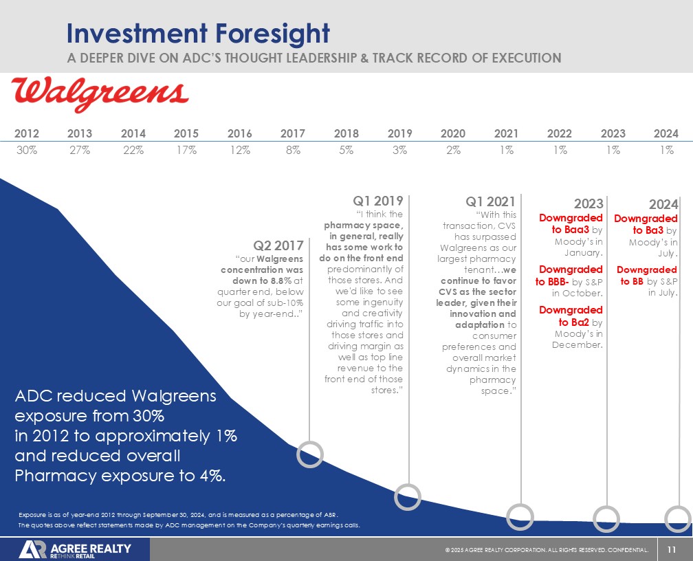 11©2025同意房地产公司。保留所有权利。机密。投资前瞻更深入地探讨ADC的思想领导力和执行业绩记录20242023202220212020202020192019201820172016201520142012012012% 1% 1% 1% 1% 1% 2% 2% 3% 5% 8% 12% 17% 22% 27% 30% Q2 2017“我们的Walgreens集中度在季度末降至8.8%,低于我们年底低于10%的目标……”2021年第一季度“通过此次交易,CVS已超过Walgreens,成为我们最大的药房租户……我们继续看好CVS作为行业龙头,因为它们具有创新性,能够适应消费者的偏好以及药房空间的整体市场动态。”2019年第一季度“我认为药店领域,总的来说,在主要是那些门店的前端确实有一些工作要做。我们希望看到一些独创性和创造力推动这些门店的客流量,并将利润率和顶线收入推向这些门店的前端。”ADC将Walgreens的曝光率从2012年的30%降至约1%,并将整体药房曝光率降至4%。风险敞口截至2012年底至2024年9月30日,以ABR百分比衡量。上述报价反映了ADC管理层在公司季度财报电话会议上所做的陈述。2023年1月被穆迪下调评级至Baa3。10月被标普下调评级至BBB-。12月被穆迪下调评级至Ba2。2024年7月被穆迪下调评级至Ba3。7月被标普下调评级至BB。
