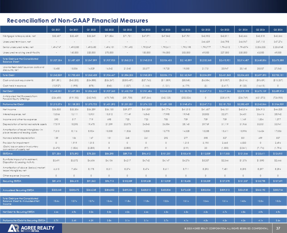 40©2025同意房地产公司。保留所有权利。机密。非GAAP财务指标本演示文稿包括一项非GAAP财务指标,即净债务与经常性EBITDA之比,这是在实际和形式基础上呈现的。该非GAAP财务指标与最直接可比的GAAP指标的对账包含在以下几页中。该比率的组成部分及其用途和对管理的效用将在下一节中进一步描述。净债务与经常性EBITDA EBITDA的组成部分由Nareit定义为根据GAAP计算的净收入,加上利息费用、所得税费用、折旧和摊销、出售房地产资产和/或控制权变更的任何收益(或损失)、可折旧房地产资产的任何减值费用,以及对未合并的合伙企业和合资企业进行调整后的净收入。公司认为EBITDA的非GAAP衡量标准是衡量公司业绩的关键补充衡量标准,应与净收入或亏损一起考虑,但不能作为衡量公司经营业绩的替代措施。公司认为EBITDA是衡量公司经营业绩的关键补充衡量标准,因为它提供了行业分析师、贷方和投资者广泛了解的公司业绩和经营现金流的额外补充衡量标准。公司对EBITDA的计算可能无法与其他对Nareit定义的解释与公司不同的REITs报告的EBITDA进行比较。经常性EBITDA公司将经常性EBITDA定义为EBITDA加上高于和低于市场租赁无形资产的非现金摊销,并在对所示期间公司投资和处置活动的运行率影响进行调整后,以及对非经常性福利或费用进行调整后。公司认为经常性EBITDA的非GAAP衡量标准是衡量公司业绩的关键补充衡量标准,应与净收入或亏损一起考虑,但不能作为衡量公司经营业绩的替代措施。公司认为经常性EBITDA是衡量公司经营业绩的一个关键补充指标,因为它代表了公司在所述期间的盈利运行率,并且因为它受到行业分析师、贷方和投资者的广泛关注。我们的经常性EBITDA可能无法与对经常性EBITDA定义有不同解释的其他公司报告的经常性EBITDA进行比较。我们的净债务与经常性EBITDA的比率被管理层用作衡量杠杆的指标,可能有助于投资者了解公司偿还债务的能力,以及评估公司的借贷能力。我们的净债务与经常性EBITDA的比率是通过采用年化的经常性EBITDA并将其除以我们的合并资产负债表的净债务来计算的。总债务和净债务公司将总债务定义为根据合并资产负债表的债务,不包括未摊销的债务发行成本、原始发行折扣和债务折扣。净债务定义为总债务减去现金、现金等价物和托管现金。公司认为总债务和净债务的非GAAP衡量标准是公司整体流动性、资本结构和杠杆率的关键补充衡量标准,因为它们为行业分析师、贷方和投资者了解我们的财务状况提供了有用的信息。公司对总债务和净债务的计算可能无法与其他对定义的解释与公司不同的REITs报告的总债务和净债务进行比较。假设远期发行的净收益(见下文)用于偿还首期债务,公司将在实际和形式基础上呈现净债务。公司认为,该备考措施可能有助于投资者了解远期发行对公司资本结构、未来借贷能力及其偿债能力的潜在影响。预期未偿还远期收益净额自2018年第一季度以来,该公司利用远期销售协议出售普通股。通过远期销售协议出售普通股,使公司能够在发行定价时确定此类股份的价格(可能会进行某些调整),同时推迟此类股份的发行和公司收到净收益。鉴于公司频繁使用远期销售协议,公司认为未偿远期预期净收益的非GAAP衡量标准是公司整体流动性的关键补充衡量标准, 资本结构和杠杆。该公司将未偿还远期的预期净收益定义为每个季度末远期销售协议下的已发行股票数量,分别乘以每个协议的适用远期销售价格。