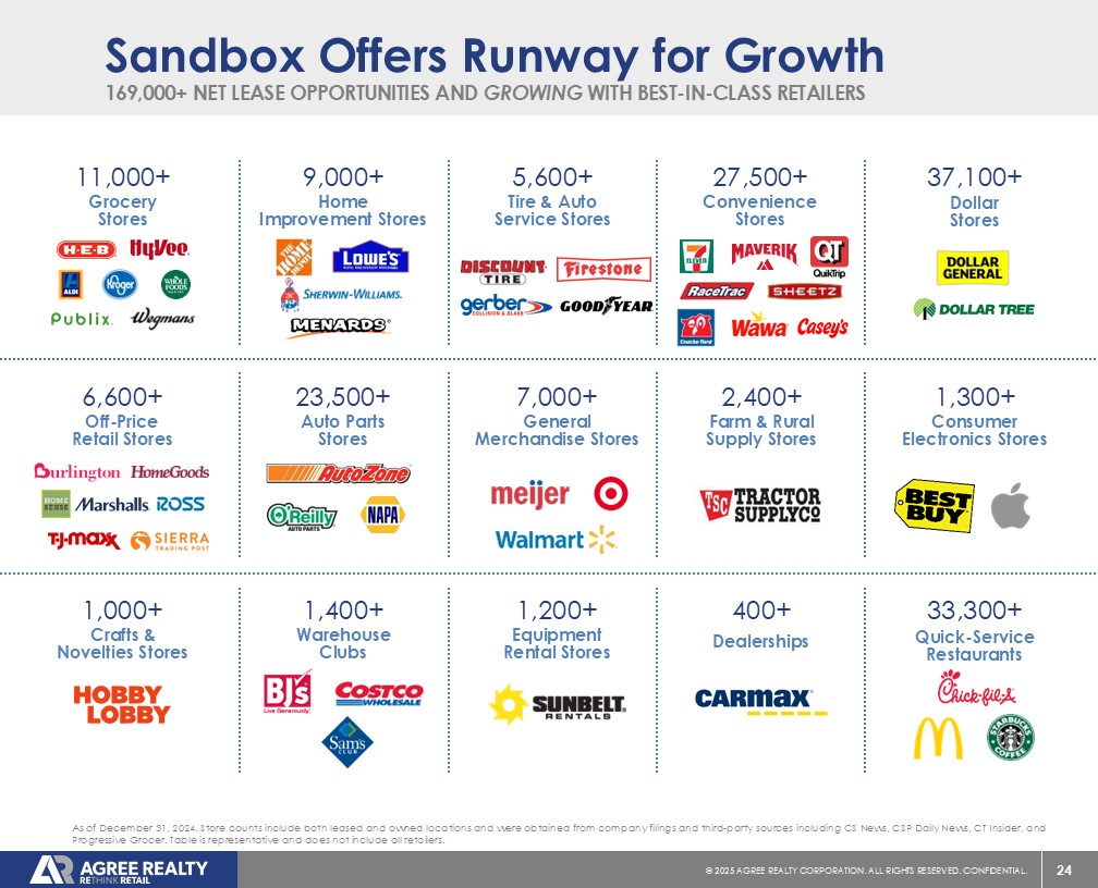 24©2025同意房地产公司。保留所有权利。机密。截至2024年12月31日。商店数量包括租赁和自有地点,是从公司文件和他们的d-p艺术来源获得的,包括CS News、CSP Daily News、CT Insider和Progressive Grocer。Table具有代表性,并不包括所有零售商。净租赁机会16.9万+与最佳一流零售商共同成长沙盒为成长提供跑道汽配店23,500 +农乡用品店2,400 +工艺品和新奇用品店1,000 +快餐店33,300 +设备租赁店1,200 +仓储俱乐部1,400 +家装店9,000 +消费电子店1,300 +杂货店11,000 +经销商400 +便利店27,500 +折扣价格零售店6,600 +轮胎汽车服务店5,600 +美元店37,100 +日用百货店7,000 +