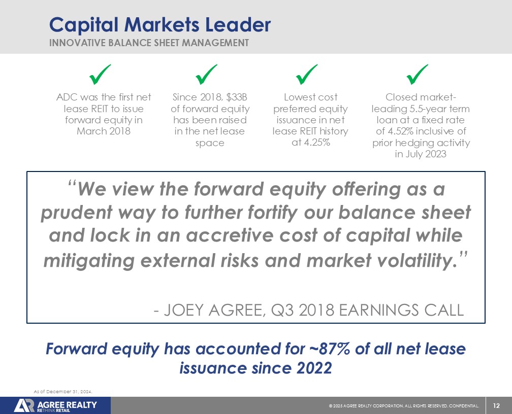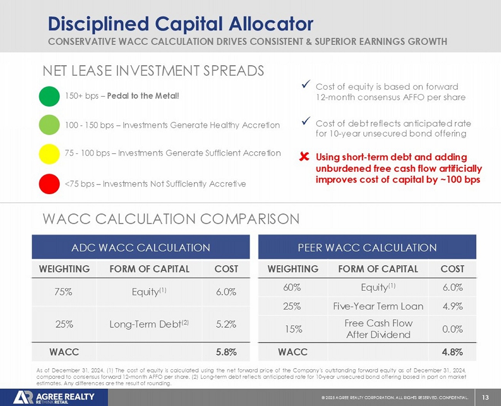 12©2025同意房地产公司。保留所有权利。机密。资本市场领导者Innovative Balance Sheet Management“我们认为,远期股票发行是一种审慎的方式,可以进一步加强我们的资产负债表,锁定资本的增值成本,同时减轻外部风险和市场波动。”-JOEY同意,2018年第三季度收益调用x A ADC是2018年3月首个发行远期股权的净租赁REIT x A自2018年以来,在净租赁空间中筹集了33B美元的远期股权x净租赁REIT历史上成本最低的优先股发行,为4.25% x封闭式市场-领先的5.5年定期贷款,固定利率为4.52%,包括2023年7月的先前对冲活动,截至2024年12月31日,远期股权占2022年以来所有净租赁发行的约87%。