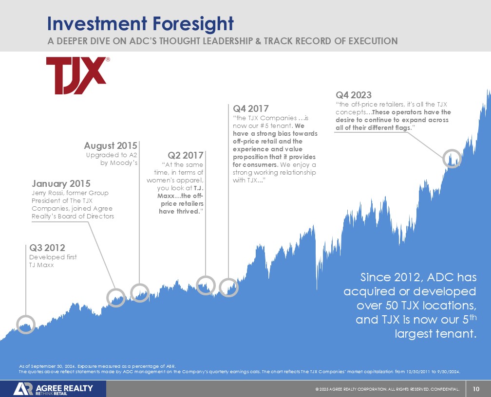10©2025同意房地产公司。保留所有权利。机密。Investment Foresight A Deeper DIVE on ADC的思想领导力和执行记录自2012年以来,ADC已经收购或开发了超过50个TJX地点,TJX现在是我们的第5大租户。截至2024年9月30日。以ABR百分比测量的暴露量。上述报价反映了ADC管理层在公司季度财报电话会议上所做的陈述。该图表反映了TJX公司在12/30/2011至9/30/2024期间的市值。2012年第3季度开发出首款TJ Maxx 2023年第4季度“折扣零售商,这一切都是TJX概念……这些运营商有继续扩张的愿望,跨越他们所有不同的旗帜。”2015年8月被穆迪上调至A2评级2017年Q2“与此同时,在女装方面,你看看T.J. Maxx……平价零售商一枝独秀。”2017年第四季度“TJX公司……现在是我们的# 5租户。我们对平价零售以及它为消费者提供的体验和价值主张有着强烈的偏见。我们与TJX享有牢固的工作关系……。”2015年1月TJX公司前集团总裁Jerry Rossi加入艾格里不动产董事会