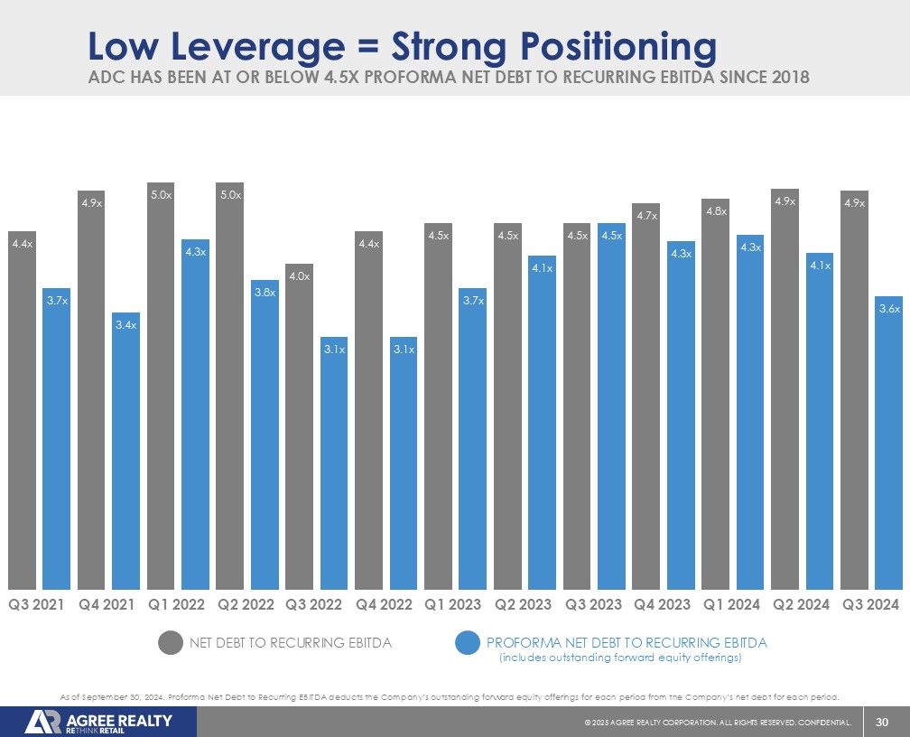 30©2025同意房地产公司。保留所有权利。机密。(包括未完成的远期股票发行)ADC自2018年以来一直处于或低于4.5倍的备考净债务与经常性EBITDA之比低杠杆=截至2024年9月30日的强劲头寸。备考净债务与经常性EBITDA之比从公司每一期的净债务中扣除公司每一期未偿还的远期股票发行。备考净债务与经常性EBITDA的净债务与经常性EBITDA的净债务2024 Q1 Q2 2024 Q3 2024 Q4 2021 Q1 2022 Q2 2022 Q3 2022 Q4 2022 Q1 2023 Q2 2023 Q3 2022 Q4 2022 Q1 2023 Q2 2023 Q3 2023 Q3 2021 4.4x 3.7x 4.9x 3.4x 5.0x 4.3x 5.0x 3.8x 4.0x 3.1x 4.4x 3.1x 4.5x 3.7x 4.5x 4.1x 4.5x 4.7x 4.3x 4.8x 4.3x 4.9x 4.1x 4.9x 3.6x