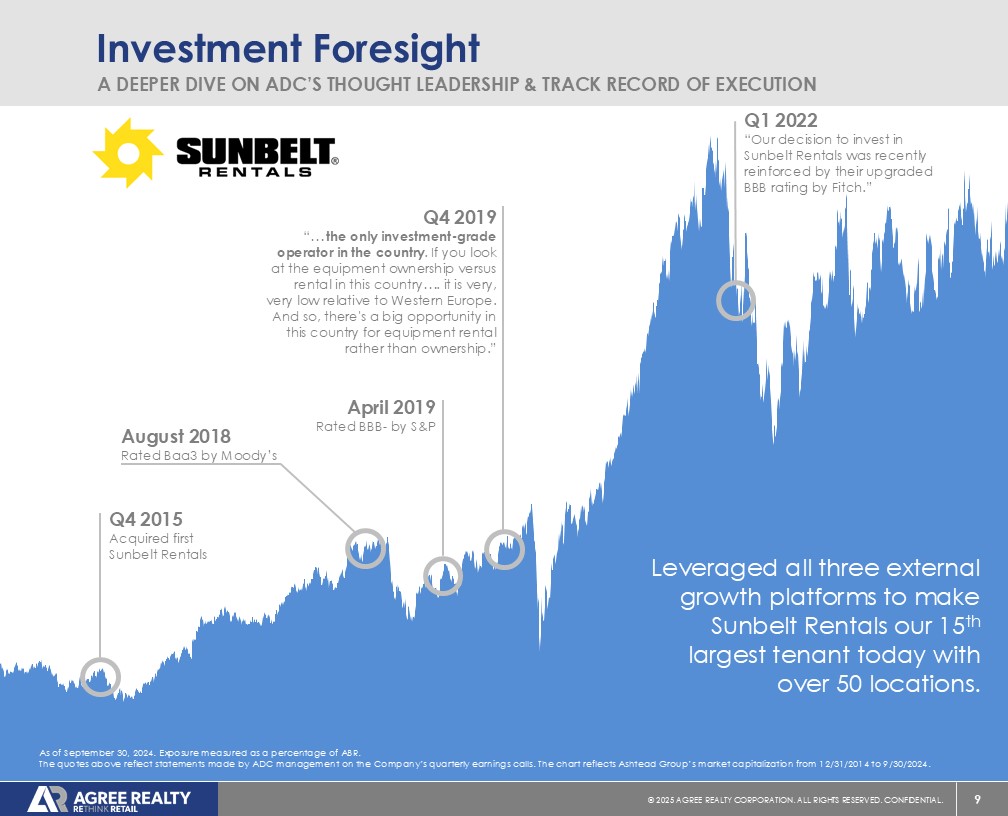 9©2025同意房地产公司。保留所有权利。机密。Investment Foresight A Deeper DIVE on ADC的思想领导力& Track Record of Execution Leveraged all three external growth platforms to make Sunbelt Rentals our 15th largest tenant today with over 50 locations。截至2024年9月30日。以ABR百分比测量的暴露量。上述报价反映了ADC管理层在公司季度财报电话会议上所做的陈述。该图表反映了Asht Ead Group在12/31/2014至9/30/2024期间的市值。2015年Q4收购First Sunbelt Rentals 2019年Q4“…全国唯一投资级运营商。如果你看看这个国家的设备拥有量与租金…。相对于西欧来说,这是非常非常低的。因此,在这个国家,设备租赁而不是所有权的机会很大。”2019年4月获标普评级BBB-2018年8月获穆迪2022年第一季度评级Baa3“我们投资Sunbelt Rentals的决定最近得到了惠誉上调的BBB评级的加强。”