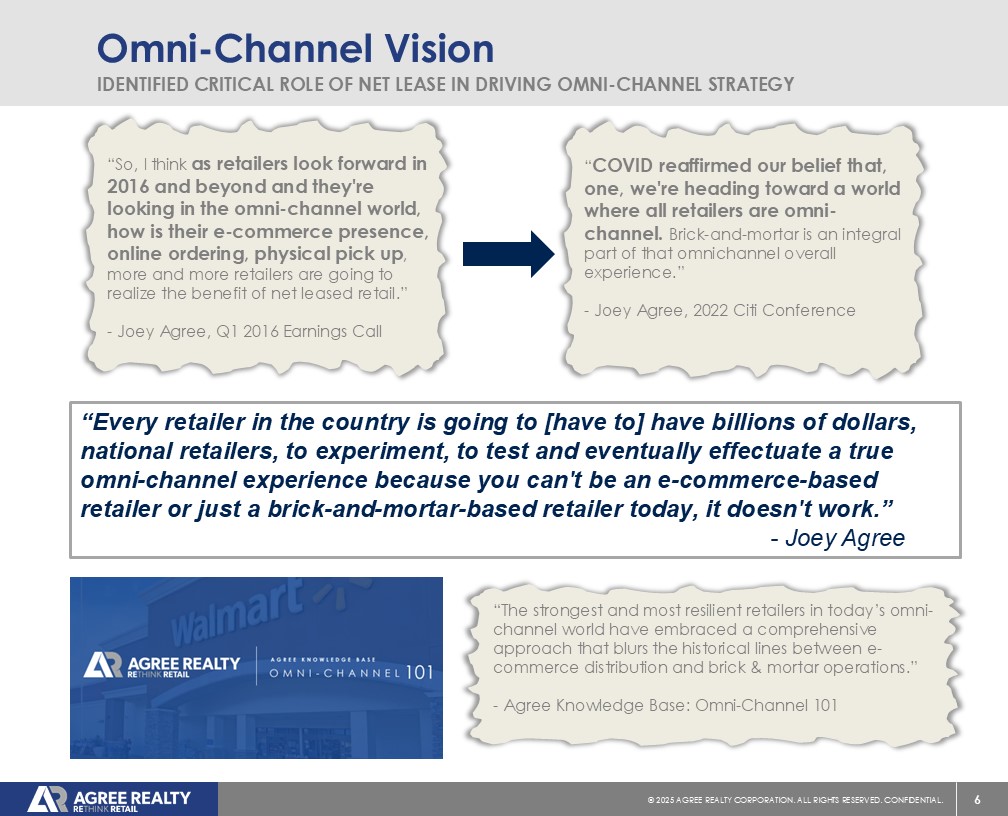 6©2025同意房地产公司。保留所有权利。机密。Omni-渠道愿景确定了净租赁在推动OMNI-渠道战略方面的关键作用“当今全渠道世界最强大、最具弹性的零售商已经采用了一种全面的方法,模糊了电子商务分销和实体经营之间的历史界限。”-Agree知识库:Omni-Channel 101“E very retailer in the country is going to [ have ] have hundreds of dollars,national retailers,to experiment,to test and eventually effect a true omni-channel experience,because you can't be a e-commerce based retailer or just a bull--based retailer in today,it does not work。”-Joey Agree“所以,我认为随着零售商们展望2016年及以后,以及他们在全渠道世界中的展望,他们的电子商务存在情况如何,在线下单、实物提货,越来越多的零售商将意识到净租赁零售的好处。”-Joey Agree,2016年第一季度财报电话会议“新冠疫情再次证实了我们的信念,第一,我们正朝着一个所有零售商都是全渠道的世界前进。实体店是该全渠道整体体验中不可或缺的一部分。”-Joey Agree,2022花旗大会