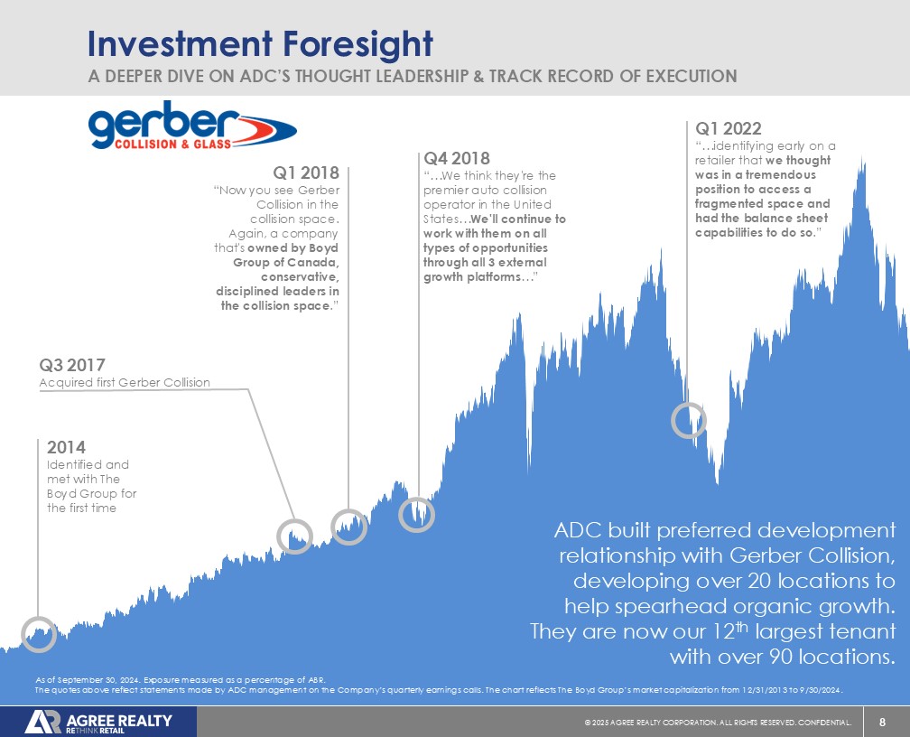 8©2025同意房地产公司。保留所有权利。机密。Investment Foresight A Deeper DIVE on ADC’s Thought Leadership & Track Record of Execution Q3 2017 acquired first Gerber Collision Q4 2018“……我们认为他们是美国首屈一指的汽车碰撞运营商……我们将继续通过所有3个外部增长平台与他们就所有类型的机会开展合作……”2022年第一季度“……在一家零售商的早期发现,我们认为它处于进入一个分散空间的巨大位置,并且拥有这样做的资产负债表能力。”ADC与Gerber Collision建立了优选开发关系,开发了20多个地点,以帮助引领有机增长。他们现在是我们的第12大租户,拥有超过90个地点。截至2024年9月30日。以ABR百分比测量的暴露量。上述报价反映了ADC管理层在公司季度财报电话会议上所做的陈述。该图表反映了Boy D Group在12/31/2013至9/30/2024期间的市值。2018年第一季度“现在你可以在碰撞空间看到Gerber Collision。再次,一家由加拿大博伊德集团拥有的公司,在碰撞领域保守、纪律严明的领导者。”2014确定并与博伊德集团首次会晤