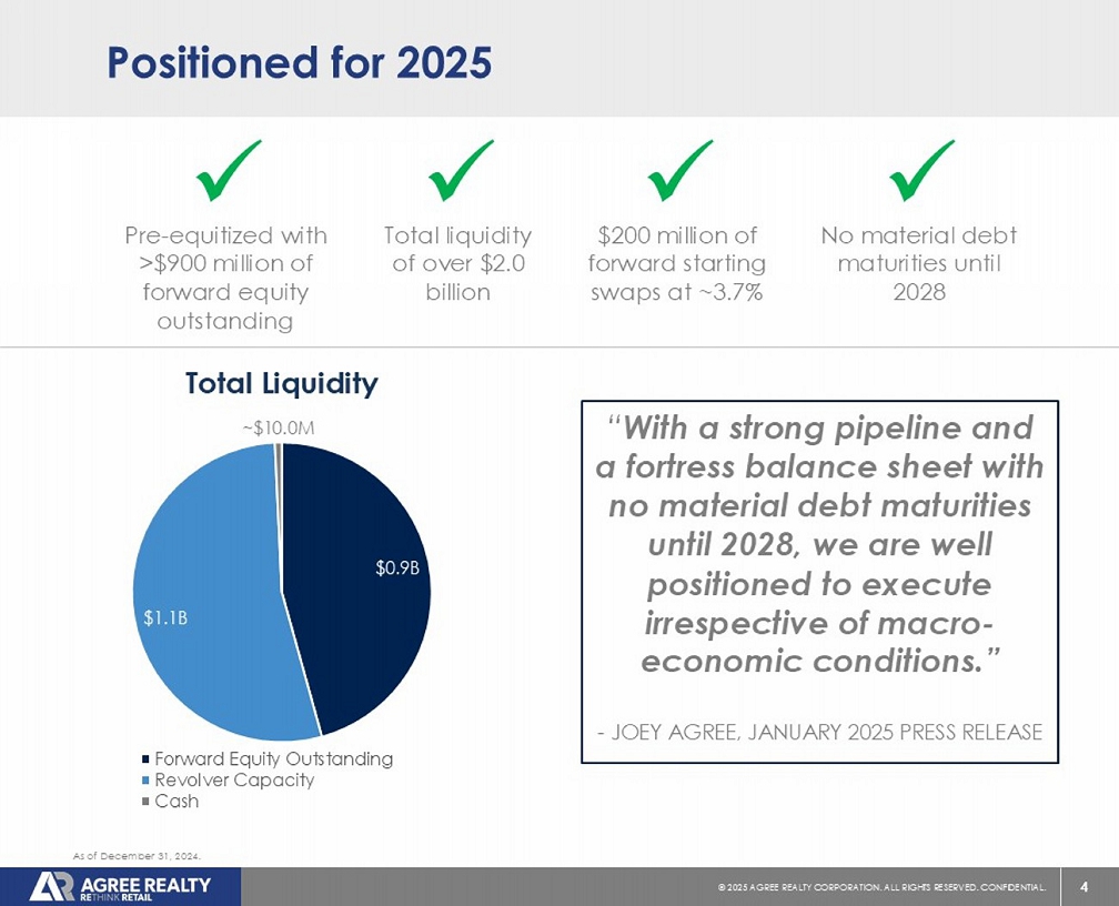 3©2025同意房地产公司。保留所有权利。机密。截至2024年12月31日,除非另有说明。(1)反映公司于2025年1月6日提供的2025年全年投资指导意见。(2)反映截至2024年12月31日止十二个月内已完成或在建的收购、开发及开发商融资平台(“DFP”)项目所部署的资本。(3)有关公司对投资级别的定义,请参见幻灯片16的脚注1。(4)截至2024年12月31日公司未偿还远期权益结算的备考。注:本演示文稿包含非GAAP财务指标,这些非GAAP财务指标与最直接可比的GAAP指标的对账包含在附录中。近期亮点介绍了11亿至13亿美元的2025年投资指导(1)在2024年第四季度以7.3%的加权平均上限率获得了3.41亿美元的高质量零售净租赁资产,约73.3%的2024年第四季度获得的基本租金来自投资级零售商(3)总流动性超过20亿美元的Fortress资产负债表(4)宣布2024年投资活动为9.51亿美元,部署在高质量零售净租赁资产中(2)宣布12月每月现金股息为每股普通股0.253美元,同比增长2.4%地面租赁投资组合占截至12月31日年化基本租金的10.9%截至12月31日,ST在2024年第四季度出售了约580万股远期股权,预计净收益超过4.23亿美元,截至12月31日的已发行远期股权超过9亿美元,获得了标普全球评级上调的BBB +发行人评级,前景稳定
