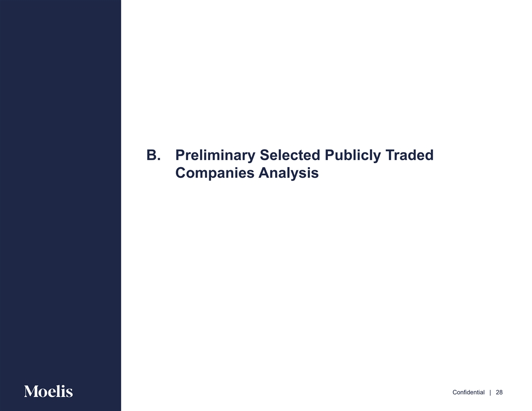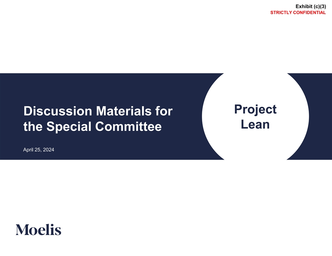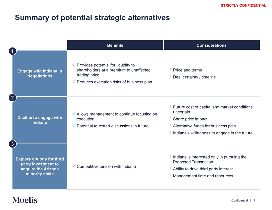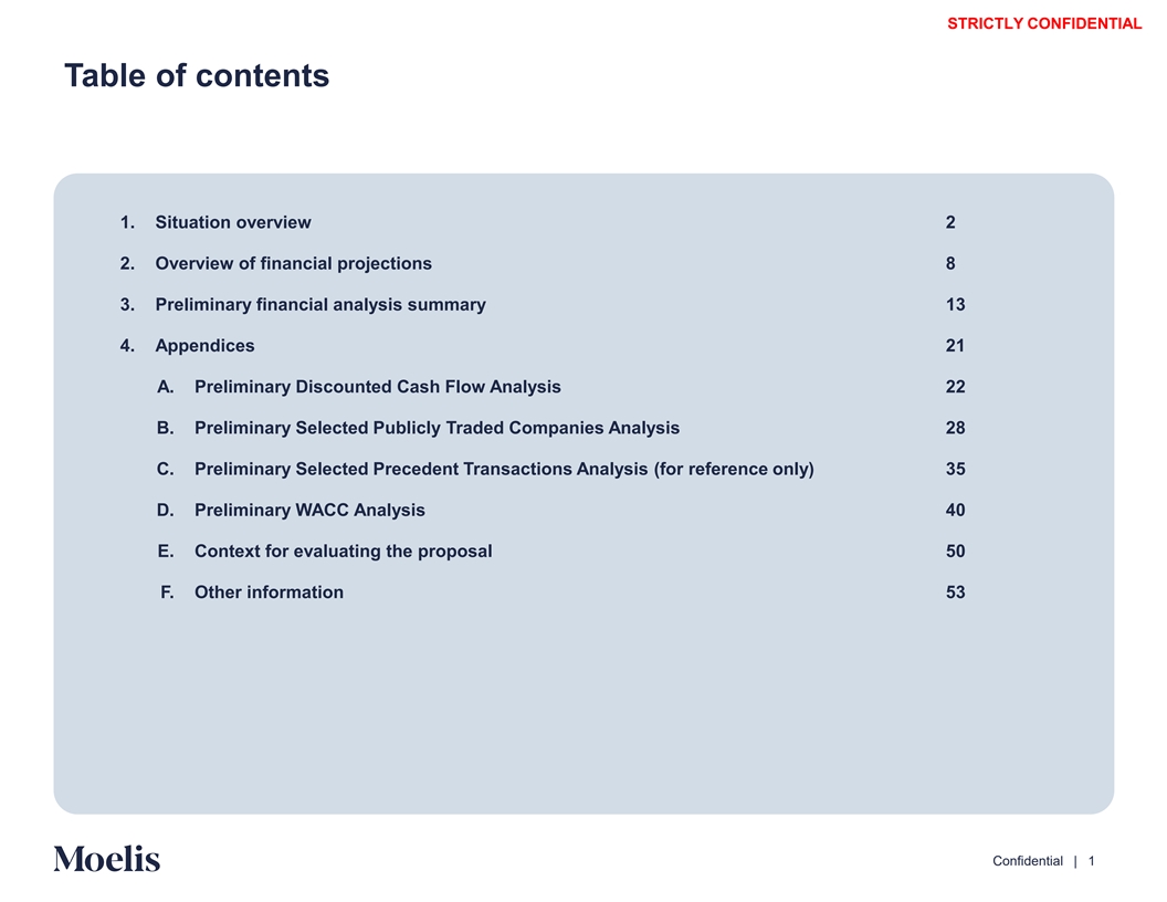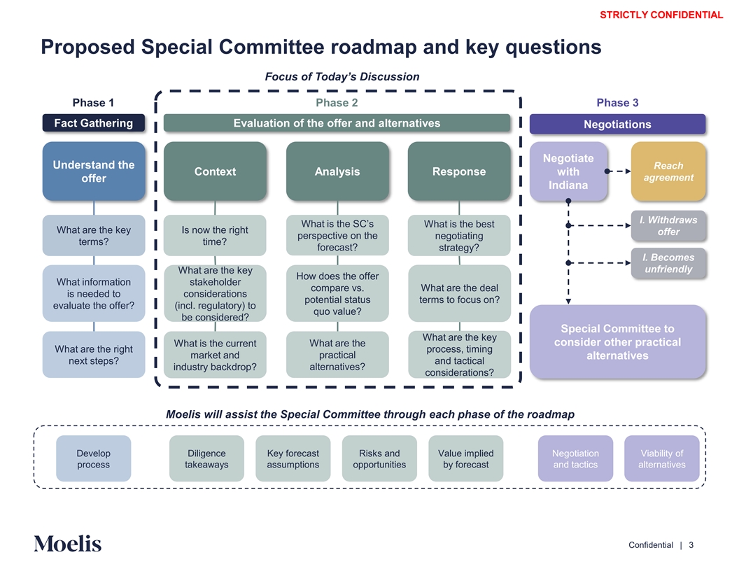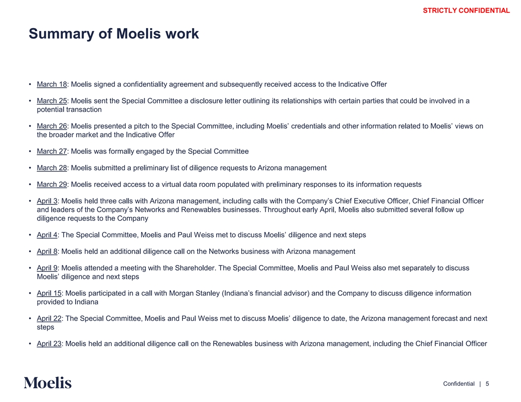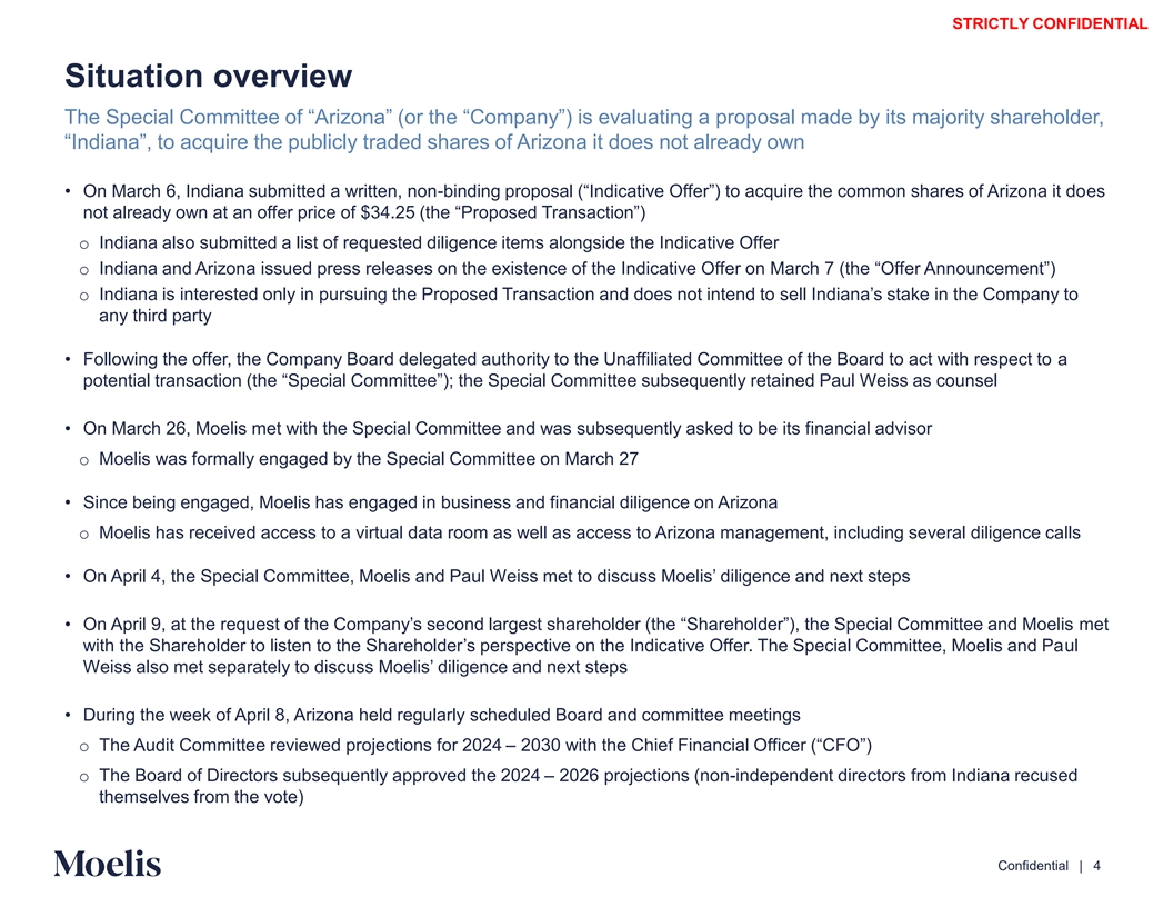 严格保密的情况概述“亚利桑那州”(或“公司”)特别委员会正在评估其大股东“印第安纳州”提出的收购其尚未拥有的亚利桑那州公开交易股票的提议• 3月6日,印第安纳州提交了一份书面,以34.25美元的要约价格收购Arizeos na尚未拥有的普通股的非约束性提议(“指示性要约”)(“拟议交易”)o Indiana还在指示性要约旁边提交了一份要求的调查项目清单o Indiana和Arizona于3月7日就指示性要约的存在发布了新闻稿(“要约公告”)o Indiana仅有兴趣进行拟议交易,不打算将Indiana在公司的股份出售给任何第三方•在要约之后,公司董事会授权董事会非关联委员会(“特别委员会”)就潜在交易采取行动;特别委员会随后聘请Paul Weiss为法律顾问• 3月26日,Moelis与特别委员会会面,随后被要求担任其财务顾问o Moelis于3月27日被特别委员会正式聘用•自受聘以来,Moelis一直在亚利桑那州从事商业和财务调查o Moelis已获得对虚拟数据室的访问权限以及对亚利桑那州管理层的访问权限,包括多次勤勉电话• 4月4日,特别委员会、Moelis和Paul Weiss开会讨论了Moelis的勤勉尽责和下一步行动• 4月9日,应公司第二大股东(“股东”)的要求,特别委员会与该股东就提示性要约听取了该股东的意见。特别委员会、M ul oelis和PA Weiss也分别开会,讨论Moelis的勤勉尽责和下一步行动•在4月8日这一周,亚利桑那州定期举行董事会和委员会会议o审计委员会与首席财务官(“CFO”)一起审查了2024 – 2030年的预测o董事会随后批准了2024 – 2026年的预测(来自印第安纳州的非独立董事回避了投票),内容不得低于此行机密| 4