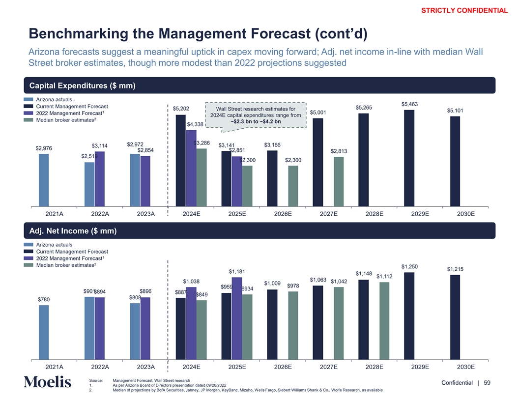 对管理层预测(续)的严格保密基准亚利桑那州的预测表明,未来资本支出将显着上升;调整后的净收入与华尔街经纪人的预期中值一致,尽管比2022年的预测更温和,这表明资本支出($ mm)亚利桑那州实际为5,43美元当前管理层预测为5,25美元5,202美元华尔街研究估计为5美元,0 1美元5,002022年管理层预测2024年资本支出范围从2经纪人估计中值~23亿美元到~42亿美元4,33美元3,2,972美元3,3美元3,4美元3,4美元2,97美元2,54美元2,5美元2,3 $ 2,59 $ 2,300 $ 2,300202 A 2022A 2023A 2024E 2025E 202 E 2027E 202 E 2029E 2030E Adj. Net income($ mm)Arizona actuals current management forecast 12022 management forecast 2 median broker estimates $,250 $,25 $,$,4 $,2 $,0 3 $,03 $,042 $,009 $ 97 $ 959 $ 934 $ 90 $ 9 $ 94 $ 7 $ 49 $ 0 $ 70202 A 2022A 2023A 2023A 2024E 2025E 202 E 2027E 202 E 2029E 2030E content must not go below this line source:Management forecast,华尔街研究机密| 591。根据亚利桑那州董事会日期为2022年9月20日的介绍2。美国银行证券、Janney、JP Morgan、KeyBanc、瑞穗、富国银行、Siebert 威廉姆斯 Shank & Co.、Wolfe Research的预测中值,如可用