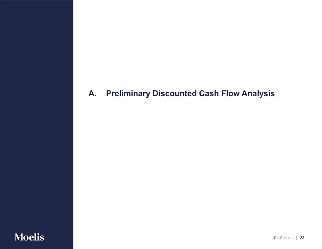 严格保密的初步财务分析– SOTP(选定的公开交易公司分析)– 2024年倍数交易多个企业价值段2024年指标低-高-低-高EBITDA $ 1,899 9.50x 11.50x $ 18,038 $ 21,836网络净收入$ 835 13.50x 16.50x 20,02122,526范围$ 18,038 $ 22,5261可再生能源EBITDA $ 743 10.00x 12.00x $ 7,434 $ 8,921公司(基于DCF分析)($ 581)($ 555)企业总价值$ 24,891 $ 30,892减:净债务(含NCI)(13,936)(13,936)总股本价值$ 10,955 $ 16,955(/)全面摊薄已发行股份388.146388.146隐含每股权益价值$ 28.22 $ 43.68资料来源:管理层预测,截至2024年4月24日的标普 Capital IQ内容不得注明:选定的公开交易公司分析假设截至2024年6月30日的预测可再生能源和企业2024年净债务为3,993美元毫米,非控股权益为1,197美元毫米;截至2024年6月30日的全面摊薄流通股为3.88 146亿股,管理层预测不假设在低于这一行预测期的全面摊薄流通股有任何变化机密| 181。可再生能源部门产生的2024E税收抵免(PTC和留存ITC)为300毫米,适用适用的EV/EBITDA倍数将添加到每个r e esp BIT ecti DAve b eye fora rer