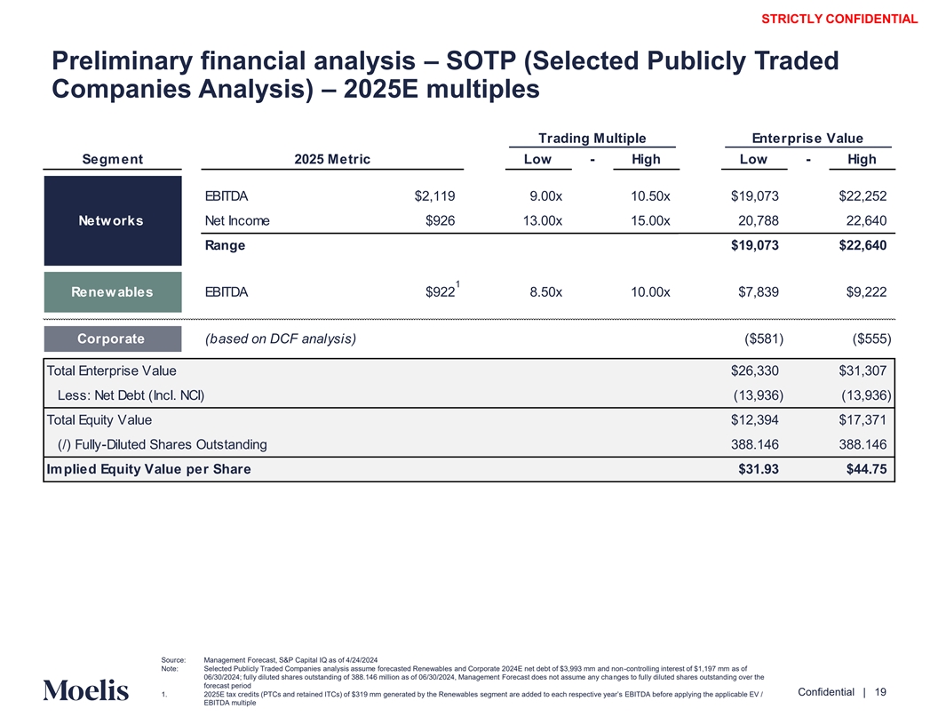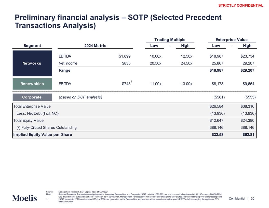 严格保密的初步财务分析– SOTP(选定的先例交易分析)交易多个企业价值段2024年指标低-高-高EBITDA $ 1,899 10.00x 12.50x $ 18,987 $ 23,734网络净收入$ 835 20.50x 24.50x 25,86729,207范围$ 18,987 $ 29,2071可再生能源EBITDA $ 743 11.00x 13.00x $ 8,178 $ 9,664公司(基于DCF分析)($ 581)($ 555)企业总价值$ 26,584 $ 38,316减:净债务(含NCI)(13,936)(13,936)总股权价值$ 12,647 $ 24,380(/)全面摊薄已发行股份388.146388.146隐含每股股权价值$ 32.58 $ 62.81内容不得来源:管理层预测,截至2024年4月24日的标普 Capital IQ注:选定的先例交易分析假设截至2024年6月30日的预测可再生能源和企业2024年净债务为3,993美元毫米,非控股权益为1,197美元毫米;低于这一线截至2024年6月30日的完全摊薄流通股为3.88 146亿股,管理层预测不假设在预测期内全面摊薄已发行股份有任何变化机密| 201。由可再生能源部门产生的300毫米的2024年税收抵免(PTC和留存ITC)被添加到每个应用适用的EV/EBITDA倍数的R e ESP BIT ecti DAve b eye fora rer