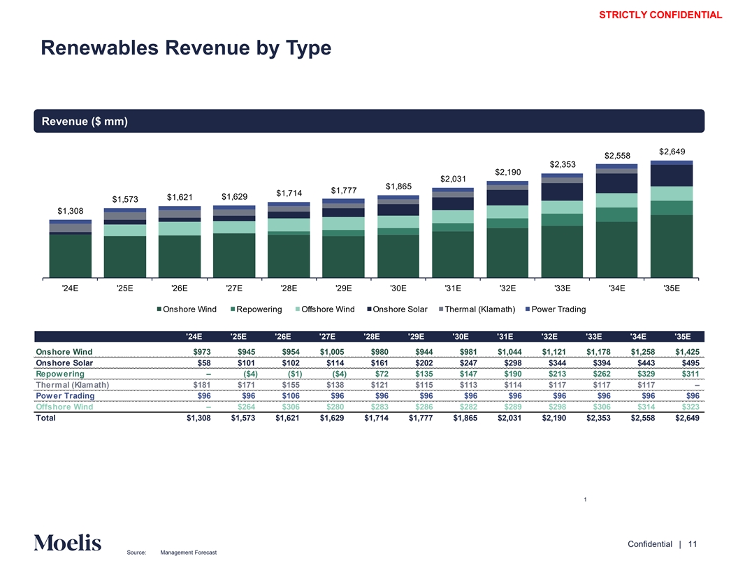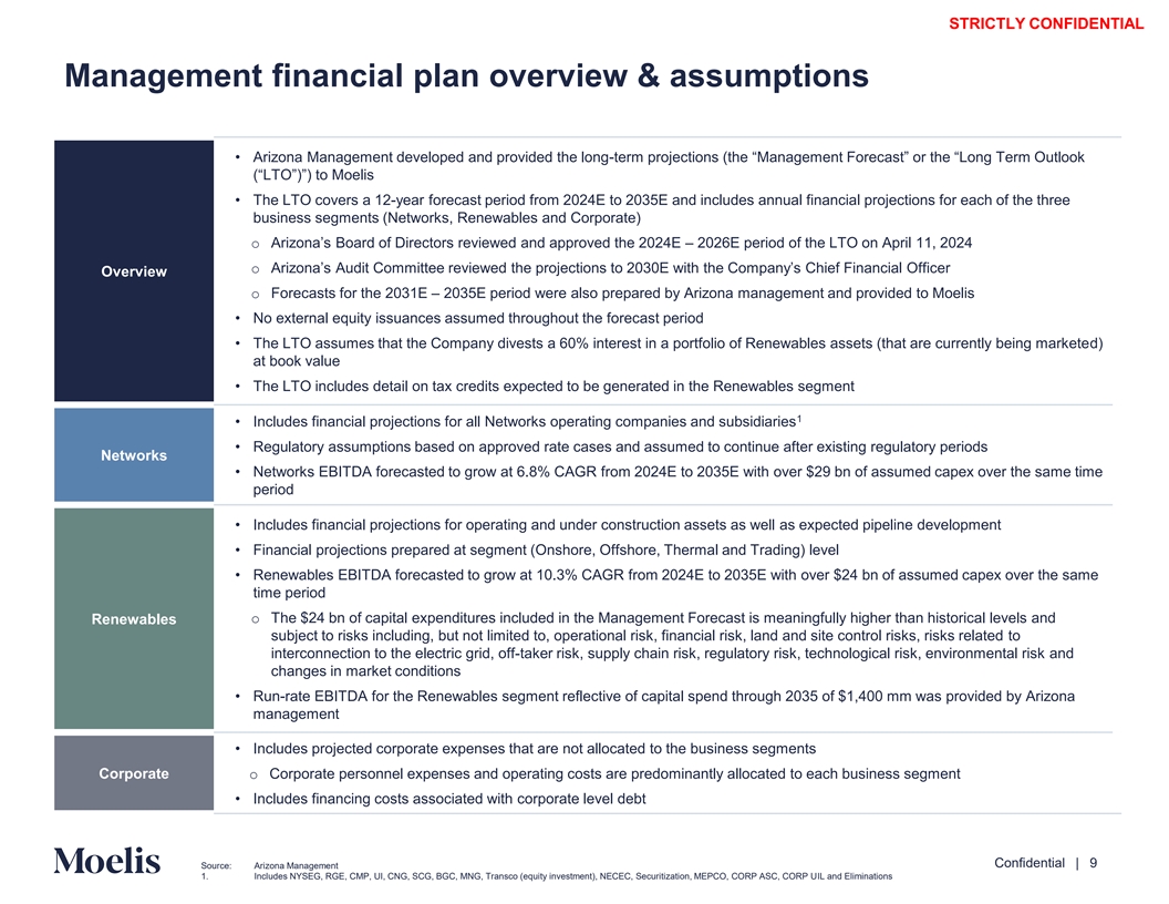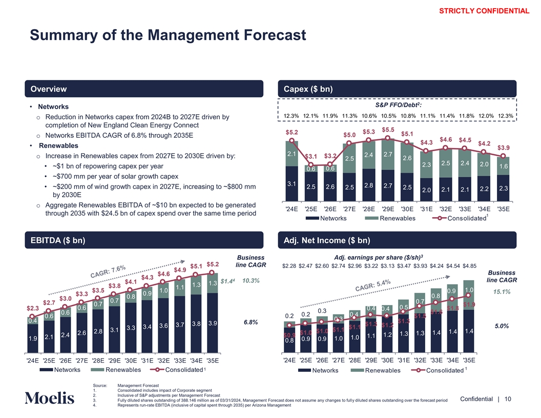 严格保密的管理层财务计划概览和假设• Arizona Management制定并向Moelis提供了长期预测(“管理层预测”或“长期展望(“LTO”)”)• LTO涵盖从2024年到2035年的12年预测期,其中包括三个业务部门(网络、可再生能源和企业)中每个部门的年度财务预测o Arizona董事会于4月11日审查并批准了LTO的20 – 202426 E E期间,2024 o亚利桑那州审计委员会与公司的首席财务官概览一起审查了对2030年的预测o对2031年至2035年期间的预测也由亚利桑那州管理层编制并提供给Moelis •假设在整个预测期内没有外部股权发行• LTO假设公司以账面价值剥离可再生能源资产组合(目前正在营销)的60%权益•长期协议包括可再生能源部门预计将产生的税收抵免的详细信息1 •包括对所有网络运营公司和子公司的财务预测•基于已批准的费率案例并假设在现有监管期后继续的监管假设网络•网络EBITDA预测从2024年到2035年以6.8%的复合年增长率增长,同期假设资本支出超过290亿美元•包括对运营的财务预测和在建资产以及预期的管道开发•在分部(陆上、海上、热力和贸易)层面编制的财务预测•可再生能源EBITDA预测将从2024年到2035年以10.3%的复合年增长率增长,同期假设的资本支出超过240亿美元o管理层预测中包含的240亿美元资本支出显着高于历史水平,可再生能源面临的风险包括但不限于运营风险、财务风险、土地和场地控制风险、与电网互联相关的风险、承购商风险、供应链风险、监管风险,技术风险、环境风险和市场条件变化•反映到2035年资本支出的可再生能源部门的运行率EBITDA为1400毫米,由亚利桑那州管理层提供•包括未分配给业务部门的预计公司费用公司o公司人事费用和运营成本主要分配给每个业务部门•包括与公司一级债务相关的融资成本内容不得低于此线机密| 9资料来源:亚利桑那州管理层1。包括NYSEG、RGE、CMP、UI、CNG、SCG、BGC、MNG、Transco(股权投资)、NECEC、证券化、MEPCO、CORP ASC、CORP UIL和消除