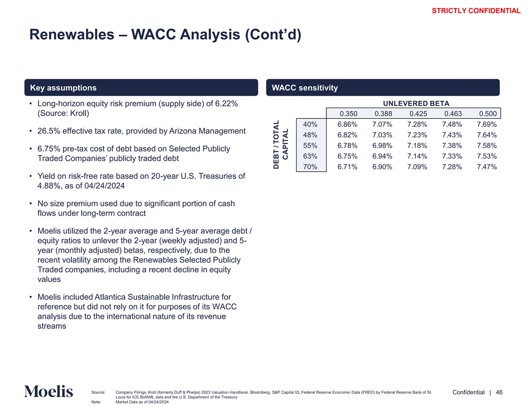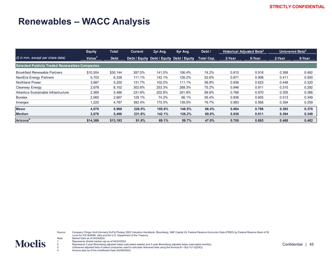 严格保密的可再生能源– WACC分析23权益总额当前2年平均。5年平均债务/历史调整Beta无杠杆Beta 1($ in mm,每股数据除外)价值债务债务/股权债务/股权债务/股权总上限。2年期5年期2年期5年期精选公开交易可再生能源公司布鲁克菲尔德可再生合作伙伴$ 10,504 $ 30,144287.0% 141.0% 106.4% 74.2% 0.8 100.91 80.36 80.48 2 NextEra Energy Partners 5,7036,338111.1% 142.1% 126.2% 52.6% 0.87 10.99 80.41 10.500 Northland Power 3,9875,250131.7% 102.0% 111.1% 56.8% 0.83 60.62 30.44 80.320 Clearway Energy 2,6788,102302.6% 253.3% 268.3% 75.2% 0.94 60.91 10.31 50.292丨Atlantica可持续基础设施亚特兰大持续基础设施,3695,486231.6% 202.8% 201.8% 69.8% 0.76 80.9700.30 50.386 Boralex 2,0652,667129.1% 74.2% 86.1%148.5% 66.4% 0.86 40.7 980.39 30.370中值2,6785,486231.6% 142.1% 126.2% 69.8% 0.83 60.91 10.39 40.34 94亚利桑那州$ 14,369 $ 13,19391.8% 69.1% 59.7% 47.9% 0.70 50.69 30.46 80.482资料来源:Company Filings,Kroll(前身为达夫菲尔普斯)2023 Valuation Handbook,Bloomberg,标普 Capital IQ,Federal Reserve Economic Data(FRED)by Federal Reserve Bank of St. Louis for ICE BoFAML data and US Department of the Treasury Content must not Note:Market Data as of 04/242024 go below this line 1。代表截至2024年4月24日的稀释后市值2。代表2年期彭博调整后贝塔(按周计算)和5年期彭博调整后贝塔(按月计算)机密| 453。使用公式B = Bu(1 +(1-t)(D/E))4计算相关beta的精选公司的无杠杆调整beta。亚利桑那州数据截至未受影响日期(03/06/2024)
