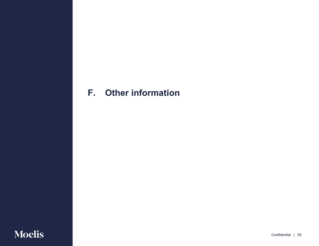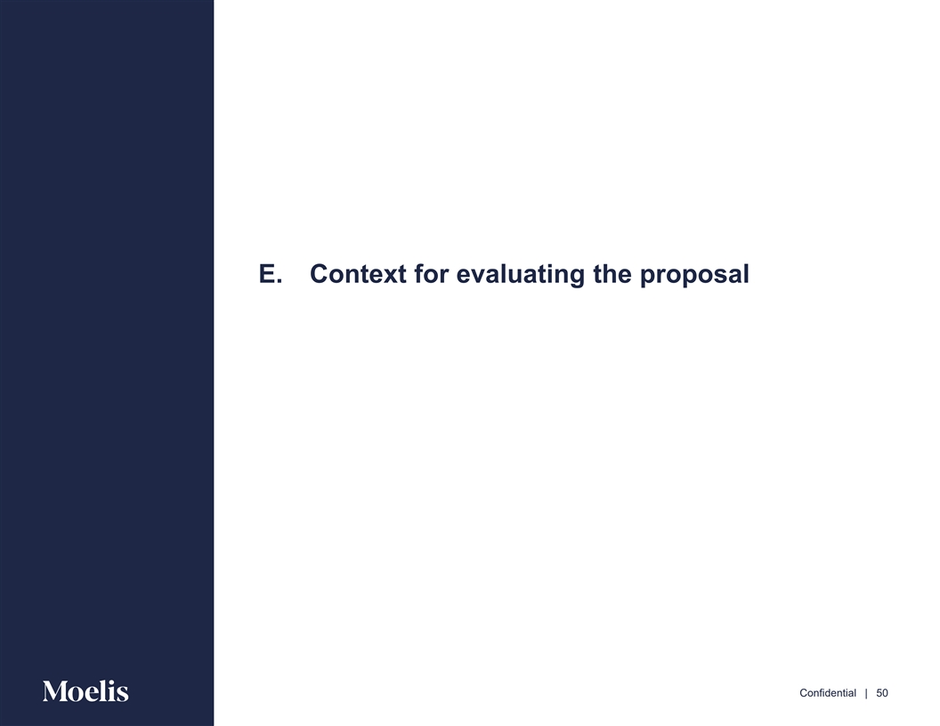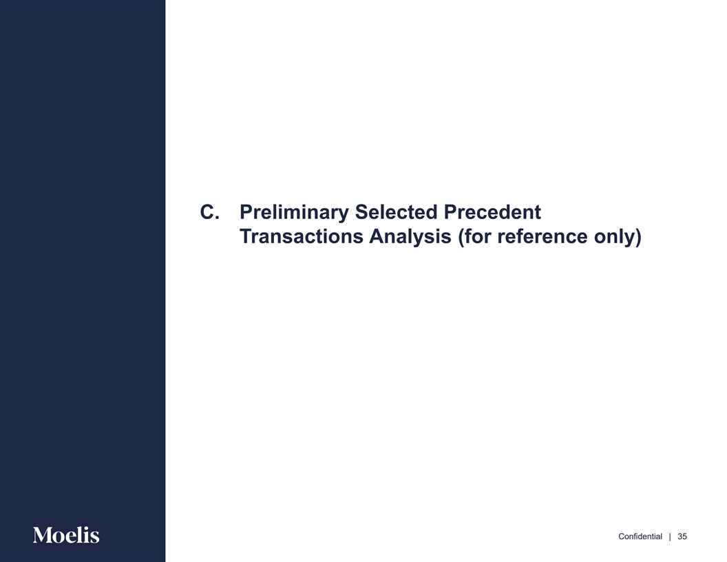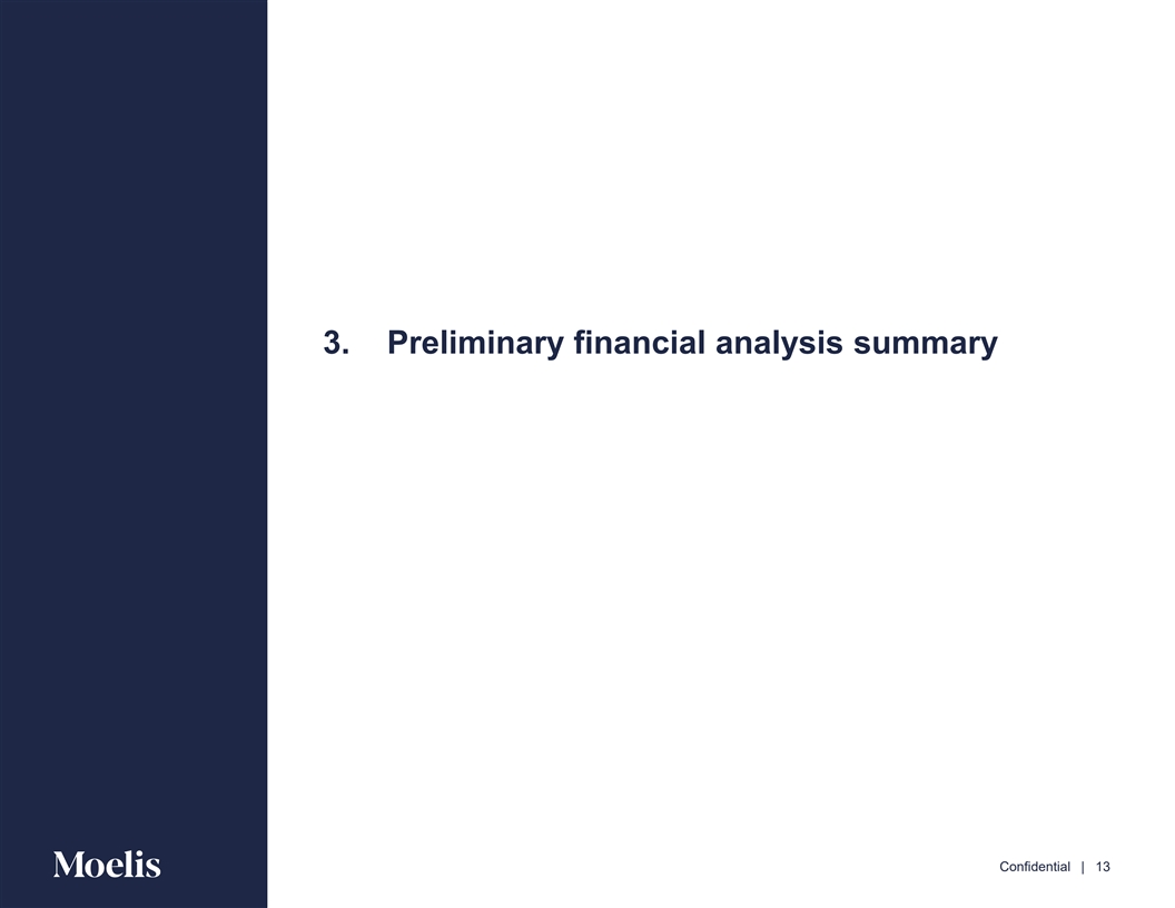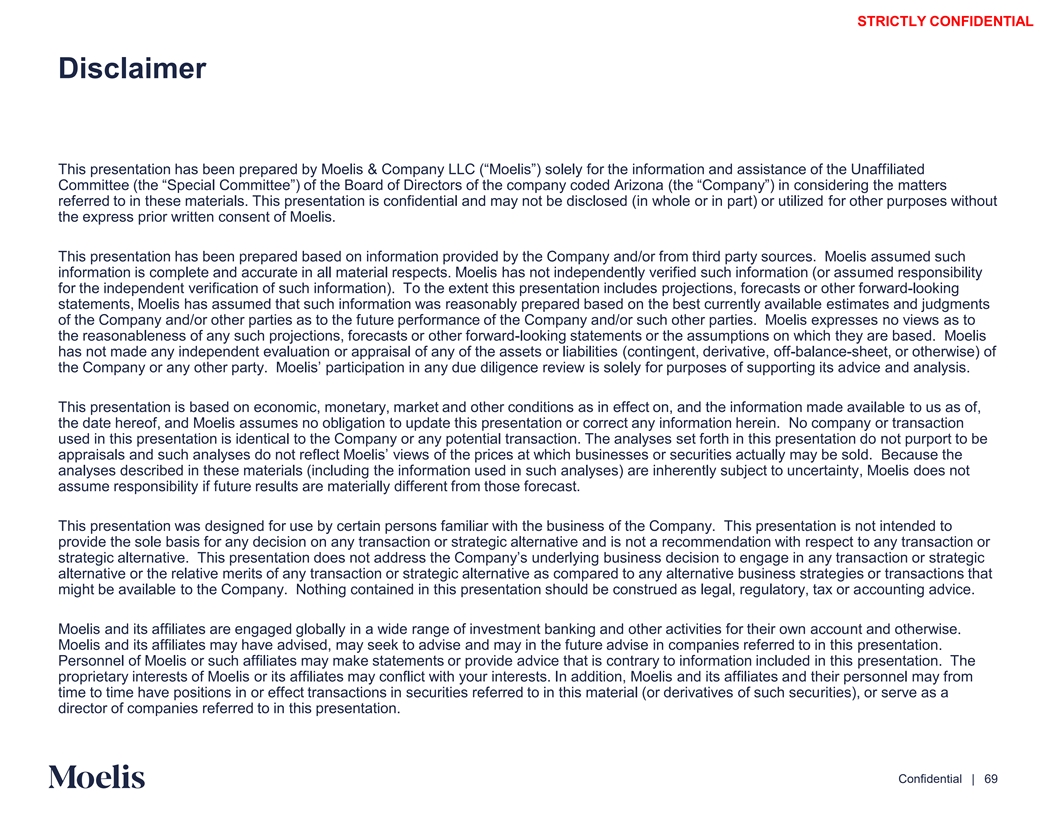 严格保密的免责声明本演示文稿由Moelis & Company LLC(“Moelis”)编制,仅供代码为Arizona(“公司”)的公司董事会的UNAFF委员会(“特别委员会”)参考和协助,用于这些材料中提及的consi mattde ers ring。本演示文稿属于保密内容,未经Moelis事先明确书面同意,不得披露(全部或部分)或用于其他目的。本演示文稿是根据公司提供的信息和/或来自第三方来源的信息编制的。Moelis假设该等资料在所有重大方面均完整及准确。Moelis未对该等信息进行独立核实(或承担对该等信息进行独立核实的责任)。如果本演示文稿包括预测、预测或其他前瞻性陈述,Moelis假设此类信息是根据公司和/或其他方对公司和/或此类其他方未来业绩的当前可获得的最佳估计和判断合理编制的。对于任何此类预测、预测或其他前瞻性陈述或其所依据的假设的合理性,Moelis不发表任何意见。Moelis未对公司或其他任何一方的任何资产或负债(或有、衍生、表外或其他)进行过独立评估或评估。Moelis参与任何尽职调查审查仅出于dvsup ice po anrtd ing an alits ysia s的目的。本演示文稿基于截至本协议发布之日有效的经济、货币、市场和其他条件以及我们获得的信息,并且Moelis不承担更新本演示文稿或更正此处任何信息的义务。本演示文稿中使用的任何公司或交易均不与公司或任何潜在交易相同。本演示文稿中列出的分析并非旨在进行评估,此类分析并不反映Moelis对企业或证券实际可能使用的价格的看法d.l yB eca可能使用的这些材料中描述的溶胶分析(包括此类分析中使用的信息)本质上具有不确定性,如果未来结果与预测结果存在重大差异,Moelis不承担责任。本演示文稿是为某些熟悉公司业务的人士设计的。本演示文稿无意为任何交易或战略替代方案的任何决定提供唯一基础,也不是关于任何交易或战略替代方案的建议。本演示文稿不涉及公司在任何ion或sttrran ategi sa c替代方案中使用CT的基本业务决策,也不涉及任何交易或战略替代方案与公司可能可用的任何替代业务战略或交易相比的相对优点。本演示文稿中的任何内容均不应被解释为法律、监管、税务或会计建议。Moelis及其附属公司在全球范围内为自己的账户和其他方面从事范围广泛的投资银行业务和其他活动。Moelis及其关联公司可能已经、可能会寻求提供建议,并且将来可能会在本演示文稿中提及的公司中提供建议。Moelis或此类关联公司的人员可能会做出与本演示文稿中包含的信息相反的陈述或提供建议。Moelis或其关联公司的专有利益可能与您的利益发生冲突。此外,Moelis及其关联公司及其人员可能不时在本材料中提及的证券(或此类证券的衍生品)中担任职务或进行交易,或担任本演示文稿中提及的公司的董事。内容不得低于此线机密| 69
