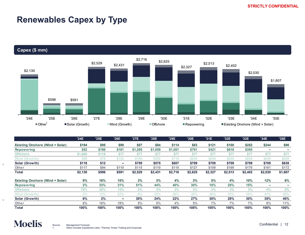 严格保密可再生能源收入按类型收入($ mm)$ 2,49 $ 2,55 $ 2,353 $ 2,90 $ 2,03 $,5 $,777 $,74 $,29 $,2 $,573 $,30 24e 25e 2 e 27e 2 e 29e 30e 3 e 32e 33e 34e 35e陆上风电为海上风电提供动力陆上太阳能热(lamath)电力交易‘24e’25e‘26e’27e‘28e’29e‘30e’31e‘32e’33e‘34e’35e陆上风电$ 973 $ 945 $ 954 $ 1,005 $ 980 $ 944 $ 981 $ 1,044 $ 1,121 $ 1,178 $ 1,258 $ 1,425陆上太阳能$ 58 $ 101 $ 102 $ 114 $ 161 $ 202 $ 247 $ 298 $ 344 $ 394 $ 443 $ 495再发电–($ 4)($ 1)($ 4)$ 72 $ 135 $ 147 $ 190 $ 213 $ 262 $ 329 $ 311 Therm交易$ 96 $ 96 $ 106 $ 96 $ 96 $ 96 $ 96 $ 96 $ 96 $ 96 $ 96 $ 96 Offshore Wind – $ 264 $ 306 $ 280 $ 283 $ 286 $ 282 $ 289 $ 298 $ 306 $ 314 $ 323 Total $ 1,308 $ 1,573 $ 1,621 $ 1,629 $ 1,714 $ 1,777 $ 1,865 $ 2,031 $ 2,190 $ 2,353 $ 2,558 $ 2,6491 Content must not go below this line confidential | 11 Source:Management Forecast