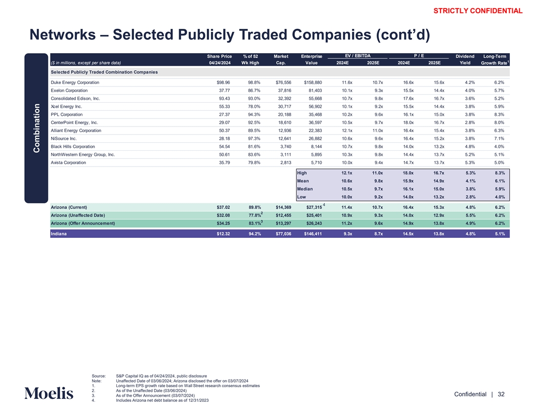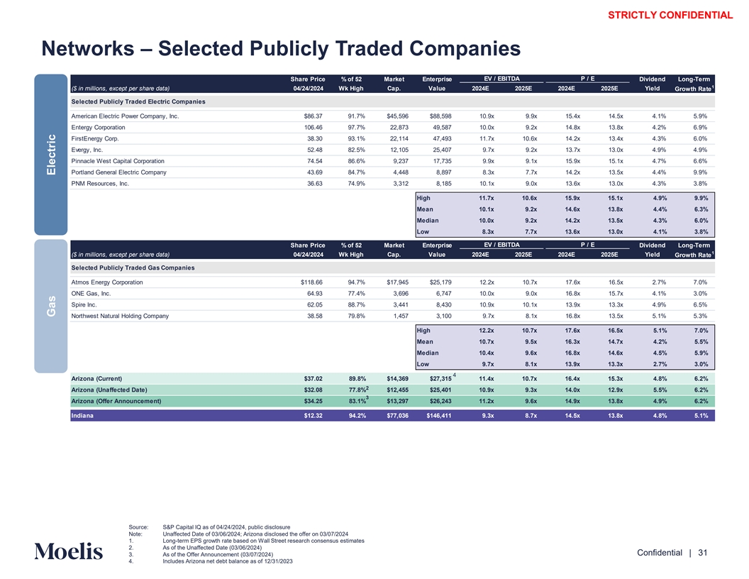 Strictly Confidential Networks – Self Public-Traded Companies Share Price % of 52 Market Enterprise EV/EBITDA P/E Dividend Long-Term 1($ millions,except per share data)04/24/2024 WK High Cap。Value 2024e 2025e 2024e 2025e收益率增长率选定公开交易的电力公司美国电力公司 $ 86.3791.7% $ 45,596 $ 88,598 10.9x 9.9x 15.4x 14.5x 4.1% 5.9% 安特吉公司 106.46 97.7% 22,87349,587 10.0x 9.2x 14.8x 13.8x 4.2% 6.9% FirstEnergy Corp. 38.3093.1% 22,11447,49311.7x 10.6x 14.2x 13.4x 4.3% 6.0% 西帕纳卡资本公司 74.54 86.6% 9,23717,7359.9x 9.1xInc. 36.63 74.9% 3,3128,185 10.1x 9.0x 13.6x 13.0x 4.3% 3.8%高11.7x 10.6x 15.9x 15.1x 4.9% 9.9%均值10.1x 9.2x 14.6x 13.8x 4.4% 6.3%中值10.0x 9.2x 14.2x 13.5x 4.3% 6.0%低8.3x 7.7x 13.6x 4.1% 3.8% EV/EBITDA P/E股价% 52市场企业股息长期1(百万美元,每股数据除外)04/24/2024 WK High Cap。价值2024E 2025E 2024E 2025E收益率增长率精选公开交易的天然气公司ATMOS能源公司 $ 118.66 94.7% $ 17,945 $ 25,17912.2x 10.7x 17.6x 16.5x 2.7% 7.0% ONE Gas,Inc. 64.93 77.4% 3,6966,74710.0x 9.0x 16.8x 15.7x 4.1% 3.0% Spire Inc. 62.05 88.7% 3,4418,430 10.9x 10.1x 13.9x 13.3x 4.9% 6.5% 西北天然气公司 38.58 79.8% 1,4573,100 9.7x 8.1x 16.8x 13.5x 5.1% 5.3%高12.2x 10.7x 17.6x 16.5x 5.1% 7.0%均值10.7x 9.5x 16.3x 14.7x 4.2% 5.5%中值10.4x 9.6x 16.8x 14.6x 4.5% 5.9%低9.7x 8.1x 13.9x 13.3x 2.7% 3.0% 4亚利桑那州(当前)$ 37.0289.8% $ 14,369 $ 27,315 11.4x 10.7x 16.4x 15.3x$ 13,297 $ 26,24311.2x 9.6x 14.9x 13.8x 4.9% 6.2%印第安纳州$ 12.32 94.2% $ 77,036 $ 146,411 9.3x 8.7x 14.5x 13.8x 4.8% 5.1%资料来源:标普 Capital IQ as of 04/24/2024,public disclosure content must not Note:Unaffected date 03/06/2024;Arizona disclosed the offer on 03/07/20241。基于华尔街研究共识估计的长期EPS增长率低于这条线2。截至未受影响日期(03/06/2024)机密| 313。截至要约公告(03/07/2024)4。包括截至2023年12月31日的亚利桑那州净债务余额Gas Electric