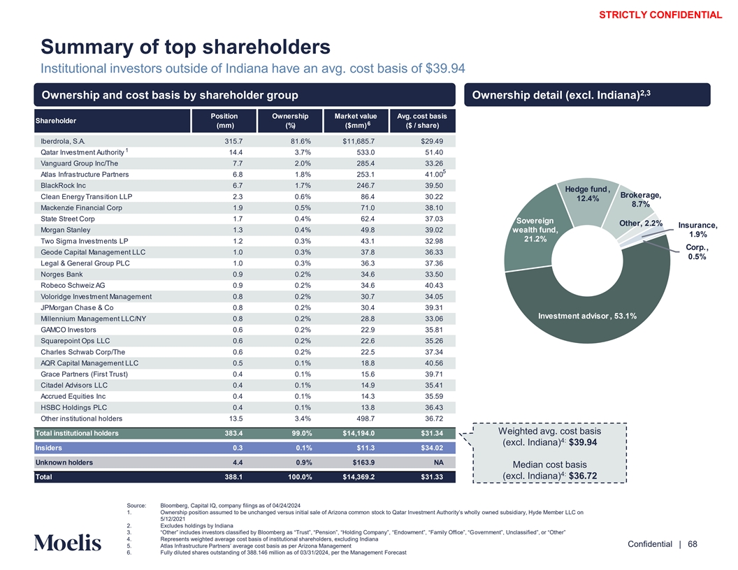 严格保密的大股东摘要印第安纳州以外的机构投资者的平均成本基础为39.94美元2,3所有权和成本基础按股东集团所有权细节(不包括印第安纳州)持仓市值平均成本基础股东6(mm)(%)($ mm)($/股)Iberdrola,S.A. 315.78 1.6% $ 11,685.7 $ 29.49 1卡塔尔投资局14.4 3.7% 533.05 1.40 Vanguard Group Inc/the 7.7 2.0% 285.43 3.265 Atlas Infrastructure Partners 6.8 1.8% 253.14 1.00 贝莱德 Inc 6.7 1.7% 246.73 9.50 edge fund Brokerage Clean Energy Transition LLP 2.3 0.6% 86.43 0.22 Mackenzie Financial Corp 1.9 0.5% 71.03 8.10 道富 Corp 1.7 0.4% 62.437.03 Sovereign Other Insurance 摩根士丹利 1.3 0.4% 49.83 9.02 Wealth fund Two Sigma Investments LP1.2 0.3% 43.13 2.98 Corp Geode Capital Management LLC 1.0 0.3% 37.8 36.33 Legal & General Group PLC 1.0 0.3% 36.33 7.36挪威银行0.9 0.2%34.63 3.50 Robeco Schweiz AG 0.9 0.2% 34.64 0.43 Voloridge Investment Management 0.8 0.2% 30.73 4.05 摩根大通 & Co 0.8 0.2% 30.439.31 Investment advisor Millennium Management LLC/NY 0.8 0.2% 28.83 3.06 GAMCO投资 Squarepoint Ops LLC 0.6 0.2% 22.635.26 Charles Schwab Corp/the 0.6 0.2% 22.537.34 AQR Capital Management LLC 0.5 0.1% 18.84 0.56 Grace Partners Grace Partners(First Trust)0.4 0.1% 15.639.71 Citadel Advisors LLC 0.4 0.1% 14.93 5.41 Accrued Equities Inc 0.4 0.1% 14.33 5.59 HSBC Holdings PLC 0.4 0.1% 13.8 36.43其他机构持有人13.5 3.4% 498.7 36.72加权平均。成本基础机构总持有人383.499.0% $ 14,194.0 $ 31.34 4:(excl。印第安纳州)$ 39.94内部人士0.3 0.1% $ 11.3 $ 34.02未知持有者4.4 0.9% $ 163.9 NA成本中位数基础4:(不包括印第安纳州)36.72美元总计388.1 100.0% 14,369.2美元31.33美元资料来源:彭博,Capital IQ,截至2024年4月24日的公司文件1。与2021年5月12日向Qatar Investment Auth ow orinty的ed su wh bo silldyiary,Hyde Member LLC首次出售亚利桑那州普通股相比,假设所有权地位不变,内容不得为2。不包括印第安纳州3的持股。“其他”包括被彭博分类为“信托”、“养老金”、“控股公司”、“捐赠基金”、“Family oof vefirce nm”e、n“t”、未分类”或“其他”的投资者低于这一行4。代表机构股东的加权平均成本基础,不包括印第安纳机密| 685。根据Arizona Management 6. Atlas Infrastructure Partners的平均成本基础。根据管理层预测,截至2024年3月31日,全面摊薄流通股为3.88 146亿股