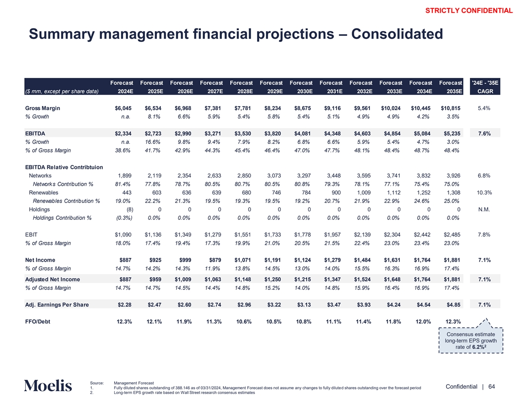 严格保密摘要管理财务预测–合并预测预测预测预测预测预测预测预测预测预测预测预测预测预测预测预测预测预测预测预测预测预测预测预测预测预测预测预测‘24e-’35e($ mm,每股数据除外)2024E 2025E 2026E 2027E 2028E 2029E 2030E 2031E 2032E 2033E 2034E 2035E CAGR毛利率$ 6,045 $ 6,534 $ 6,968 $ 7,381 $ 7,781 $ 8,234 $ 8,675 $ 9,116 $ 9,561 $ 10,024 $ 10,445 $ 10,8155.4%%增长n.a. 8.1% 6.6% 5.9% 5.4% 5.4% 5.4% 5.1% 4.9% 4.2% 3.5% EBITDA 2,334美元2,723美元2,990美元3,271美元3,530美元3,820美元4,081美元4,348美元4,603美元4,854美元5,084美元5,2357.6%%增长n.a. 16.6% 9.8% 9.4% 7.9% 8.2% 6.8% 6.6% 5.9% 5.4% 4.7%3,2973,4483,5953,7413,8323,9266.8%网络贡献% 81.4% 77.8% 78.7% 80.5% 80.7% 80.5% 80.8% 79.3% 78.1% 77.1% 75.4% 75.0%可再生能源4436036366396807467849001,0091,1121,2521,30810.3%可再生能源贡献% 19.0% 22.2% 21.3% 19.5% 19.5% 19.5% 19.2% 20.7% 21.9% 22.9% 24.6% 25.0%控股(8)0000000 NM控股贡献%(0.3%)0.0% 0.0% 0.0% 0.0% 0.0% 0.0% 0.0% 0.0% 0.0% 0.0% 0.0% 0.0% 0.0% 0.0% 0.0% 0.0% 0.0% 0.0% 0.0% 0.0% 0.0% 0.0% 0.0% 0.0% 0.0% 0.0% 0.0% 0.0% 0.0% 0.0% 0.0% 0.0% 0.0% 0.0% 0.0% 0.0% 0.0%17.4% 19.4% 17.3% 19.9% 21.0% 20.5% 21.5% 22.4% 23.0% 23.4% 23.0%净收入$ 887 $ 925 $ 999 $ 879 $ 1,071 $ 1,191 $ 1,124 $ 1,279 $ 1,484 $ 1,631 $ 1,764 $ 1,8817.1%毛利率14.7% 14.2% 14.3% 11.9% 13.8% 14.5% 13.0% 14.0% 15.5% 16.3% 16.9% 17.4%调整后净收入$ 887 $ 959 $ 1,009 $ 1,063 $ 1,148 $ 1,250 $ 1,215 $ 1,347 $ 1,524 $ 1,648 $ 1,764 $ 1,8817.1%毛利率14.7% 14.7% 14.5% 14.5% 14.4% 14.8% 15.2% 14.0% 14.8% 15.9% 16.4% 17.4%调整后每股收益11.1% 11.4% 11.8% 12.0% 12.3%共识估计长期每股盈利增长2率6.2%内容不得低于此线来源:管理层预测机密| 641。截至2024年3月31日,已发行完全稀释股份为388.146股,管理层预测不假设在预测期内已发行完全稀释股份有任何变化2。基于华尔街研究一致预期的长期EPS增长率