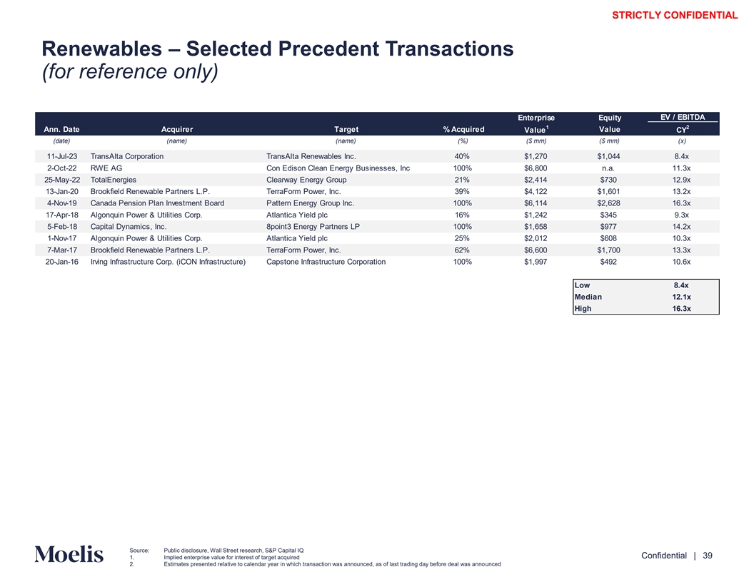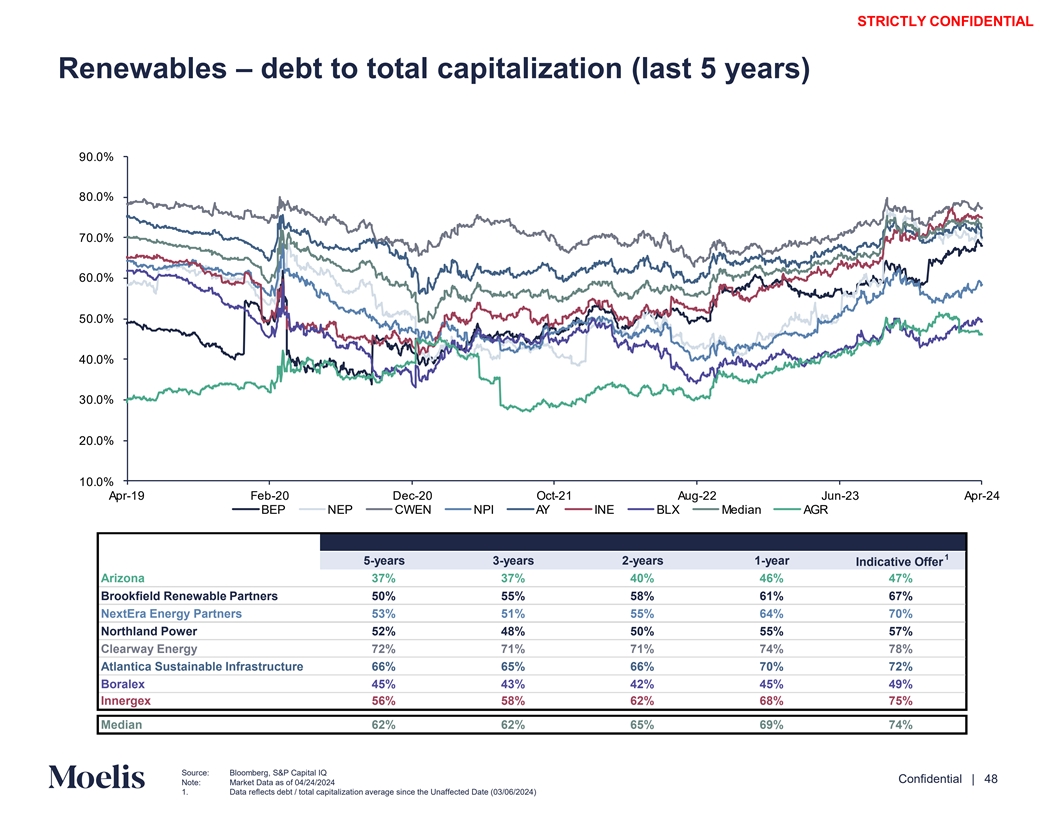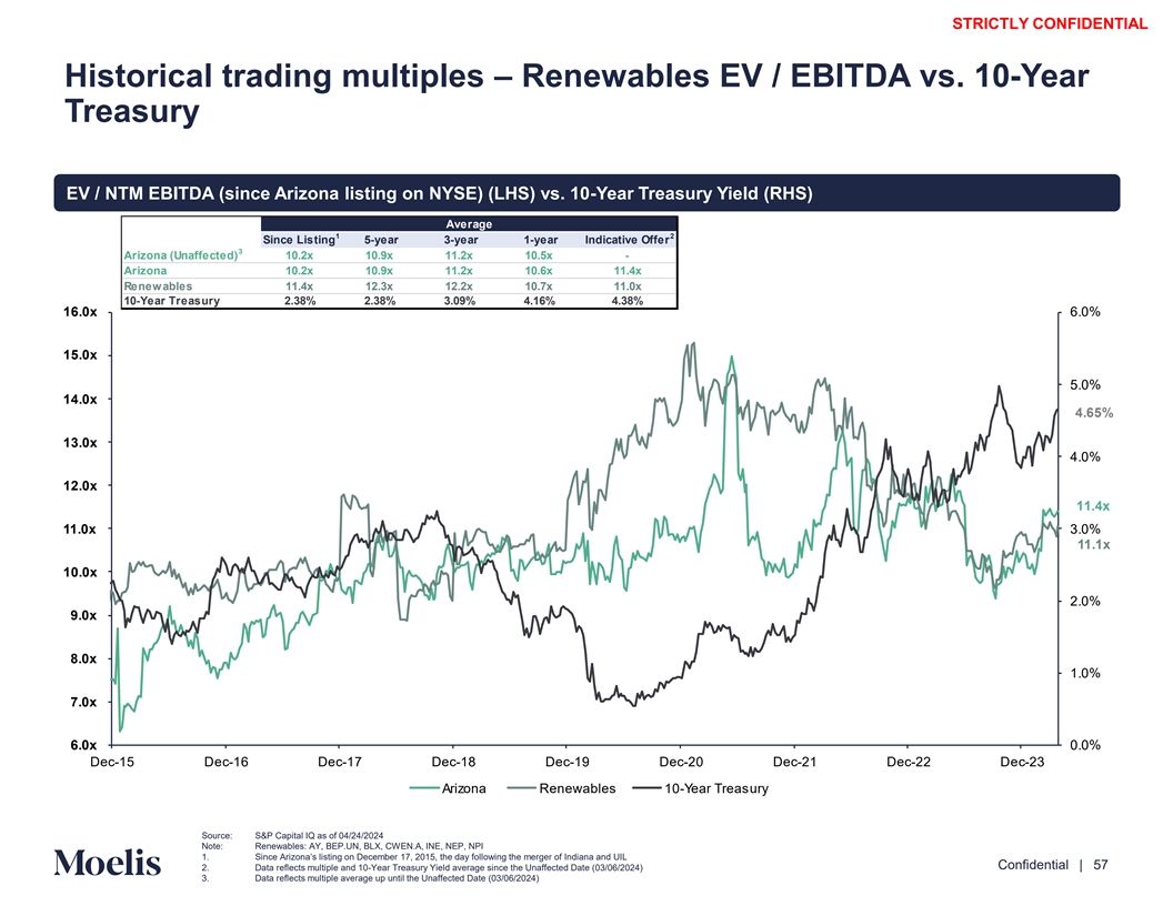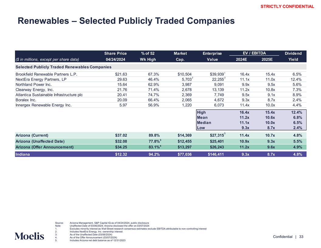 严格保密的可再生能源–选定的公开交易公司股价% 52市场企业EV/EBITDA股息(百万美元,每股数据除外)04/24/2024 WK High Cap。Value 2024E 2025E Yield Selected Publicly Traded Renewables Companies 1 Brookfield Renewable Partners L.P. $ 21.6367.3% $ 10,504 $ 39,939 $ 16.4x 15.4x 6.5% 22 NextEra Energy Partners,LP 29.63 46.4% 5,70322,255 11.1x 11.0x 12.4% Northland Power Inc. 15.6462.9% 3,9879,091 9.9x 9.5x 5.6% Clearway Energy,Inc. 21.76 71.4% 2,67813,13911.2x 10.8x 7.3% 亚特兰大持续基础设施 plc 20.41 74.7% 2,3697,749 9.5x 9.1x 8.9% Boralex Inc. 20.09 66.4% 2,0654,6729.3x 8.7x 2.4% Innergex丨可再生能源Renewable能源 Inc. 5.97 56.9% 1,220,073 11.4x 10.0x 4.4%高16.4x 15.4x 12.4%均值11.2x 10.6x 6.8%中值11.1x 10.0x 6.5%低9.3x 8.7x 2.4% 5 Arizona(current)$ 37.02 89.8% $ 14,369 $ 27,315 11.4x 10.7x 4.8% 3 Arizona(unaffected date)$ 32.08 77.8% $ 12,455 $ 25,401 10.9x 9.3x 5.5% 4标普 Capital IQ截至2024年4月24日,公开披露注:未受影响的日期为2024年3月6日;Arizona于2024年3月7日披露的要约内容不得为1。不包括少数股东权益,因为华尔街研究一致估计不包括归属于非控股权益的EBITDA 2。包括NextEra Energy,Inc.所有权权益低于此行3。截至未受影响日期(03/06/2024)机密| 334。截至要约公告(03/07/2024)5。包括截至2023年12月31日的亚利桑那州净债务余额