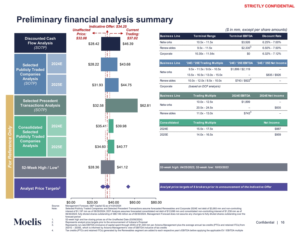 严格保密初步财务分析摘要指示性报价:34.25美元(以mm计,每股金额除外)不受影响当前价格:交易:业务线终端范围终端EBITDA贴现率$ 32.08 $ 37.02贴现现金净额ORK10.5x-11.5x $ 3,9266.25%-7.00%流量分析$ 2.42 $ 4.393(SOTP)Renew ables 9.5x-11.5x $ 2,3356.50%-7.50%公司10.35x-11.54x $ 06.32%-7.12%业务线‘24E/’25E交易倍数‘24E/’25E EBITDA‘24E/’25E净收入2024E $ 2.22 $ 43。Selected 9.5x-11.5x/9.0x-10.5x $ 1,899/$ 2,119 – Publicly Traded NetW orks Companies 13.5x-16.5x/13.0x-15.0x – $ 835/$ 926 Analysis 4 Renew ables 10.0x-12.0x/8.5x-10.0x $ 743/$ 922 –(SOTP)2025E $ 3.93 $ 44.75 Corporate(based on DCF analysis)Business Line Trading Multiple 2024E EBITDA 2024E Net Income Selected Precedent 10.0x-12.5x $ 1,899 – NetW orks Transactions Analysis $ 32.5 $ 2。20.5x-24.5x – $ 835(SOTP)4 Renew ables 11.0x-13.0x $ 743 – Consolidated Trading Multiple Net Income $ 35.4 $ 39.9 2024E Consolidated 2024E 15.5x-17.5x $ 887 Selected 2025E 14.0x-16.5x $ 959 Publicly Traded Companies Analysis 2025E $ 34。0 $ 40.77 152周高位:04/25/2023;52周低位:10/03/2023 $ 2.3 $ 4。2指示性要约公布前8家券商的52周高/低分析师目标价2分析师目标价0.00美元20.00美元40.00美元0.00美元0.00美元资料来源:管理层预测,截至2024年4月24日,标普 Capital IQ注:选定的公开交易公司和选定的先例交易假设截至2024年6月30日,预测的可再生能源和企业2024年净债务为3,993美元,非控股权益为1,197美元;DCF分析假设截至2024年6月30日,预测的合并净债务为12,698美元,合并非控股权益为1,238美元;截至2024年6月30日,完全稀释后的流通股为3.88 146亿股,管理层预测不假设在内容方面完全稀释的已发行股份的任何变化不得低于这一行1。截至未受影响日期(03/06/2024)的52周高低收盘价2。代表印第安纳州提案公布前的分析师价格目标机密| 163。表示每个Arizona Management的运行率EBITDA(包括到2035年所花费的资本)为1,400毫米加上2031年至2035年的平均年度税收抵免(PTC和留存ITC),这是由Arizona Management对包括税收抵免4的EBITDA的看法提供的。可再生能源部门产生的税收抵免(PTC和留存ITC)被添加到每一相应年度的息税前利润PLD yIA ng is thefor ape a plicabl p e EV/EBITDA倍数仅供参考