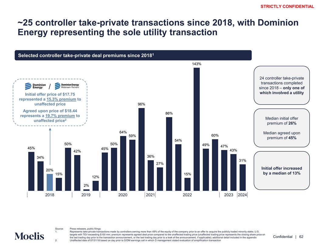 严格保密~2018年以来25起控制人私有化交易,与道明尼能源代表唯一公用事业交易1自2018年起选定的控制人私有化交易溢价143% 24控制人私有化交易完成/自2018年起–其中仅一项涉及公用事业初步发售价$ 17.75较未受影响价格溢价15.3% 96%议定价格$ 18.4486%较中位数初步报价溢价19.7% 2未受影响价格溢价26% 64%中位数议定60% 59%溢价45% 54% 50% 50% 49% 47% 45% 45% 43% 42% 36% 34% 31% 27%初步报价增加20%中位数13% 15% 15% 12% 2% 2018201820182018201820182019201920192019201920192020202020202020202020202020202020202020202120212022202220222022202220222022202220222022202220222022202220222022202220222022202220222022202220222022202220222022202220222022202220222022202220222022202220222022202220222022202220202320242024内容不得来源:新闻稿、公开文件1。代表在要约收购公开交易的少数股权之前,拥有公司49%以上股权的控制人进行的私有化交易;美国低于这一线目标的TEV超过100美元mm;溢价代表与未受影响的交易价格相比的商定交易价格(未受影响的交易价格代表在Confidential上的收盘价| 62交易公告前的最后一个交易日,或公告泄露前的最后一个交易日(如适用);附录2中包含的额外细节。未受影响的日期07/31/18基于D/DM财报电话会议前一天,其中D管理层表示评估简化交易