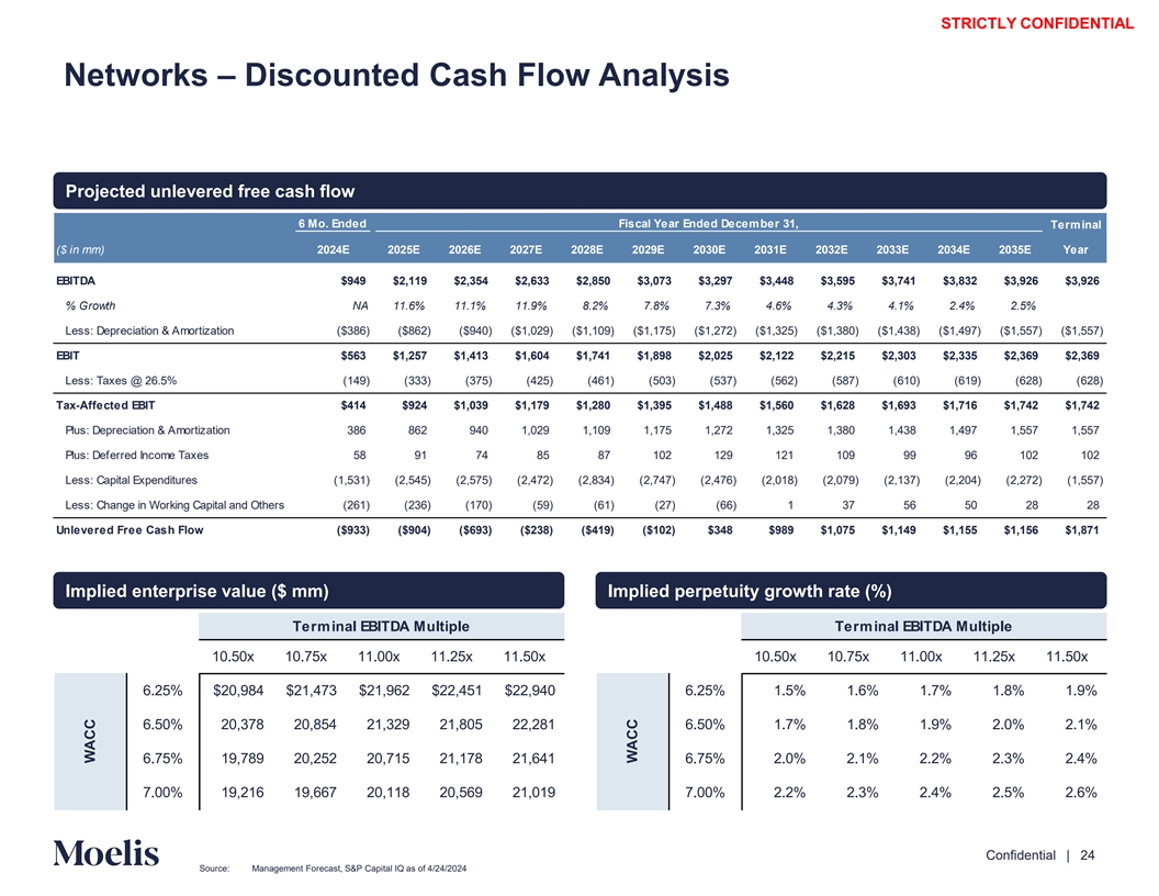 Strictly Confidential Networks –贴现现金流分析预测的无杠杆自由现金流6个月。截至12月31日的财年结束,终端(mm)2024E 2025E 2026E 2027E 2028E 2029E 2030E 2031E 2032E 2033E 2034E 2035E年EBITDA $ 949 $ 2,119 $ 2,354 $ 2,633 $ 2,850 $ 3,073 $ 3,297 $ 3,448 $ 3,595 $ 3,741 $ 3,832 $ 3,926 $ 3,926%增长NA11.6 % 11.1% 11.9% 8.2% 7.8% 7.3% 4.6% 4.3% 4.1% 2.4% 2.5%减:折旧和摊销(386美元)(862美元)(940美元)(1,029美元)(1,109美元)(1,175美元)(1,272美元)(1,325美元)(1,380美元)(1,438美元)(1,497美元)(1,551,395美元1,488美元1,560美元1,628美元1,693美元1,716美元1,742美元1,742美元加:折旧和摊销3868629401,0291,1091,1751,2721,3251,3801,4381,4971,5571,557加:递延所得税5891748587102129121109996102102减:资本支出(1,531)(2,545)(2,575)(2,472)(2,834)(2,747)(2,476)(2,018)(2,079)(2,137)(2,204)(2,272)(1,557)减:营运资金变动和其他(261)(236)(170)(59)(61)(27)(66)13756502828无杠杆自由现金流($ 933)($ 904)($ 693)($ 238)($ 419)($ 102)$ 348 $ 989 $ 1,075 $ 1,149 $ 1,155 $ 1,156 $ 1,871隐含企业价值($ mm)隐含永续增长率(%)终端EBITDA倍数终端EBITDA倍数10.50x 10.75x 11.00x 11.25x 11.50x 10.50x 10.75x 11.00x 11.25x 11.50x 6.25% $ 20,984 $ 21,473 $ 21,962 $ 22,451 $ 22,9406.25% 1.5% 1.6% 1.7% 1.8% 1.9% 6.50% 20,37820,85421,32921,80522,2816.50%7.00% 2.2% 2.3% 2.4% 2.5% 2.6%含量不得低于这一线机密| 24资料来源:管理层预测,标普 Capital IQ截至2024年4月24日WACC WACC
