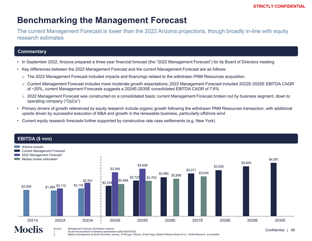 严格保密对标管理层预测目前管理层的预测低于2022年亚利桑那州的预测,但大致符合股票研究估计评论• 2022年9月,亚利桑那州为其董事会编制了一份三年财务预测(“2022年管理层预测”)• 2022年管理层预测与当前管理层预测之间的主要差异如下:o 2022年管理层预测包括与已撤回的PNM电力瓦斯收购相关的影响和融资o当前管理层预测包括更温和的增长预期;2022年管理层预测包括2022E-2025E EBITDA复合年增长率约为20%,目前的管理层预测表明,2024E-2035E年合并EBITDA的复合年增长率为7.6% o 2022年管理层预测是在合并基础上构建的;目前的管理层预测按业务部门细分,下至运营公司(“OPCO”)•股权研究参考的主要增长驱动力包括在撤回PNM电力瓦斯交易后的有机增长,并购的成功执行和可再生能源业务的增长推动了额外的上行空间,尤其是海上风•当前股票研究预测进一步得到建设性利率案例和解(例如纽约)的支持EBITDA($ mm)亚利桑那州实际当前管理层预测12022管理层预测2中位经纪人估计$ 4,0 $ 3,20 $ 3,3 $ 3,530 $ 3,354 $ 3,27 $ 3,045 $ 2,990 $ 2,5 $ 2,723 $ 2,703 $ 2,4 $ 2,55 $ 2,334 $ 2,2 $ 2,00 $,94202 A 2022A 2023A 2024E 2025E 202 E 2027E 202 E 2029E 2030E内容不得低于此线来源:管理层预测,华尔街研究机密| 581。根据亚利桑那州董事会日期为2022年9月20日的介绍2。美国银行证券、Janney、JP Morgan、瑞穗、富国银行、Siebert 威廉姆斯 Shank & Co.、Wolfe Research的预测中值,如有