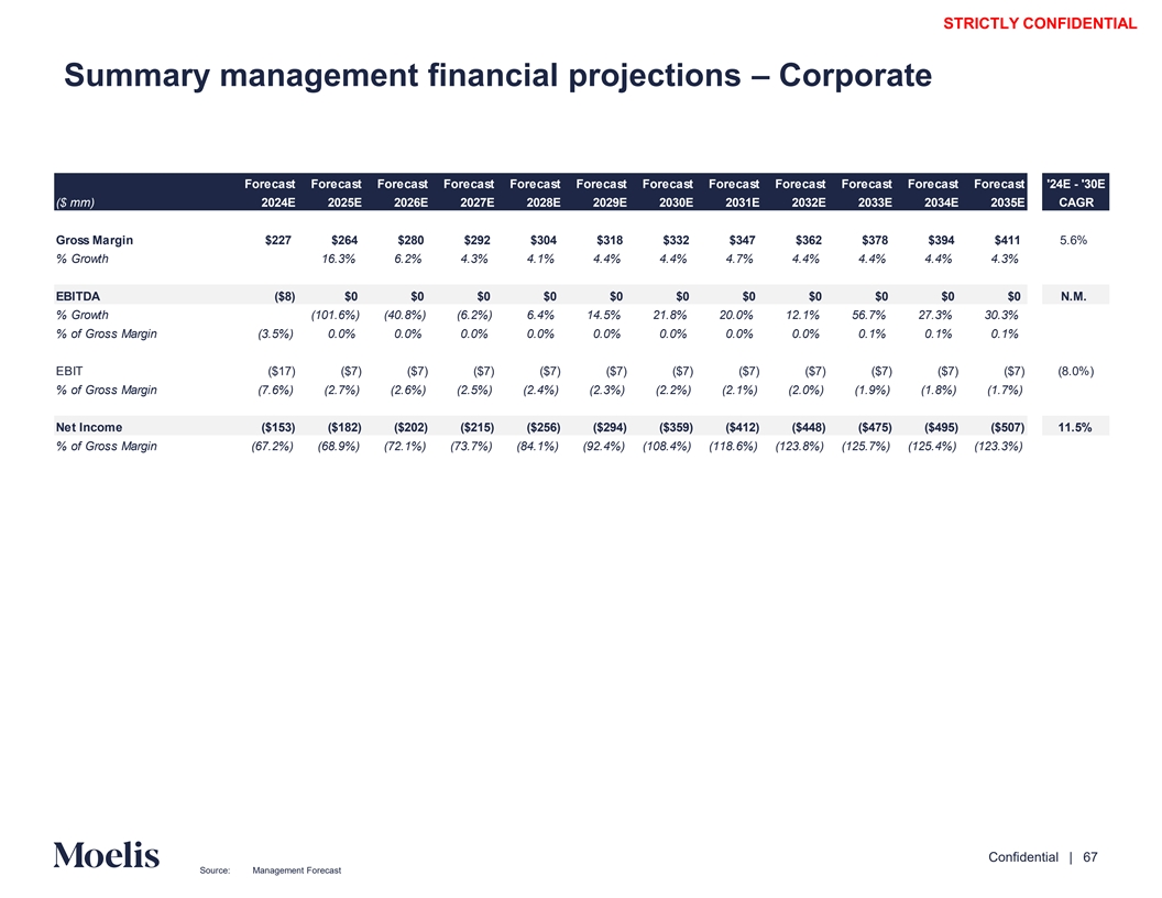 严格保密摘要管理财务预测–公司预测预测预测预测预测预测预测预测预测预测预测预测预测预测预测预测预测‘24e-’30e($ mm)2024e2025e2026e2027e2028e2029e2030e2031e2032e2033e2034e2035eCAGR毛利率$ 227 $ 264 $ 280 $ 292 $ 304 $ 318 $ 332 $ 347 $ 362 $ 378 $ 394 $ 4115.6%增长16.3% 6.2% 4.3% 4.1% 4.4% 4.4% 4.7% 4.4% 4.4% 4.4% 4.3% EBITDA($ 8)$ 0 $ 0 $ 0 $ 0 $ 0 $ 0 $ 0 $ 0 $ 0 $ 0 N.M.增长(101.6%)(40.8%)(6.2%)6.4% 14.5% 21.8% 20.0% 12.10.0% 0.0% 0.0% 0.0% 0.0% 0.0% 0.1% 0.1% 0.1%息税前利润($ 17)($ 7)($ 7)($ 7)($ 7)($ 7)($ 7)($ 7)($ 7)($ 7)($ 7)($ 7)($ 7)($ 7)($ 7)($ 7)($ 7)($ 8.0%)% of gross margin(7.6%)(2.7%)(2.6%)(2.5%)(2.4%)(2.3%)(2.2%)(2.1%)(2.0%)(1.9%)(1.8%)(1.7%)Net Income($ 153)($ 182)($ 202)($ 215)($ 256)($ 294)($ 359)($ 412)($ 448)($ 475)($ 495)($ 507)