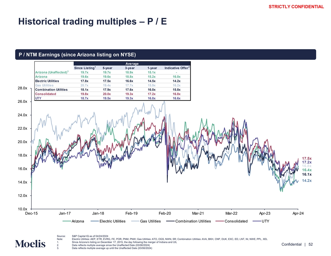 严格保密的历史交易倍数– P/E P/NTM收益(自亚利桑那州在纽交所上市以来)平均12自上市以来5年3年1年指示性要约3亚利桑那州(未受影响)19.7x 19.7x 18.9x 15.1x-亚利桑那州19.6x 19.6x 18.8x 15.2x 16.0x电力公用事业17.8x 17.5x 16.6x 14.5x 14.2x燃气公用事业20.7x 19.4x 17.7x 15.9x 16.2x 2.0x组合公用事业18.1x 17.9x 17.6x 16.0x 15.8x合并19.8x 20.0x 19.3x 17.2x 16.8x UTY 18.7x 19.5x 19.3x 16.8x 16.6x 2。0x 24.0x 22.0x 20.0x.0x x x2月20日、3月2日、3月22日、4月23日、4月24日亚利桑那州电力公司作为公用事业的组合公用事业合并的UT内容不得来源:标普 Capital IQ截至2024年4月24日注:电力公用事业:AEP、ETR、EVRG、FE、POR、PNM、TERMNWPNW;燃气公用事业:ATO、OGS、NWN、SR;组合公用事业:AVA、BKH、CNP、TERM9、DUK、EXC、EDT、LNT、NI、NWE自205年12月7日亚利桑那州上市以来,印第安纳州和UIL合并的第二天机密| 522。数据反映自未受影响日期(03/06/2024)3以来的倍数平均值。数据反映截至未受影响日期的倍数平均值(03/06/2024)