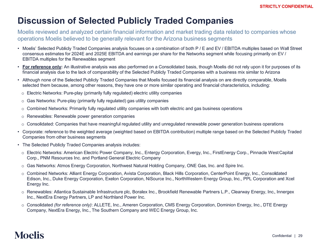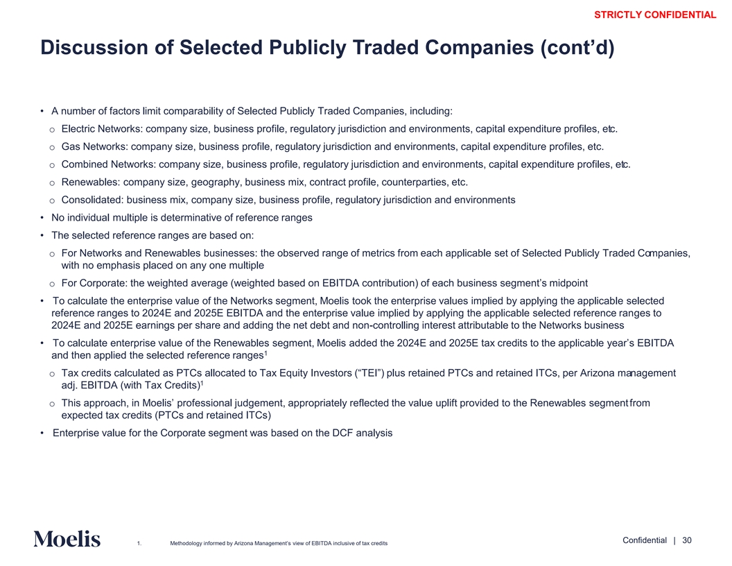 对选定的公开交易公司进行严格保密的讨论Moelis审查并分析了与其运营被认为与亚利桑那州业务部门普遍相关的公司相关的某些财务信息和市场交易数据• Moelis的选定公开交易公司分析侧重于结合P/E和EV/EBITDA mul WTIPL ales l Strba eesed t对2024年和2025年EBITDA的一致估计和网络部门的每股收益,同时主要关注可再生能源部门的EV/EBITDA倍数•仅供参考:也在合并基础上进行了说明性分析,尽管由于业务组合与亚利桑那州相似的选定上市公司缺乏可比性,因此Moelis在进行财务分析时并不依赖它•尽管Moelis将其财务分析重点关注的选定上市公司中没有一家具有直接可比性,但Moelis选择它们是因为,除其他原因外,它们有一个或多个相似的经营和财务特征,包括:o Electric Networks:Pure-play(primarily fully regulated)electric utilities companies o Gas Networks:pure-play(primarily fully regulated)gas utilities companies o Combined Networks:primarily fully regulated utilities companies with both electric and gas business operations o Renewables:Renewable power generation companies o consolidated:companies that have meaningly regulated utilities and unregulated renewable power generation business operations • Corporate:reference to the weighted average(we安特吉公司、Evergy, Inc.、FirstEnergy Corp.、西帕纳卡资本 Corp.、PNM电力瓦斯 Inc.和Portland General Electric Company o Gas Networks:ATMOS能源公司、西北天然气公司 Northwest Natural Holding Company、ONE Gas,Inc.和Spire Inc. o Combined Networks:Alliant Energy Corporation、Avista Corporation、Black Hills Corporation、CenterPoint Energy,Inc.、爱迪生联合电气公司、杜克能源公司、爱克斯龙公司、NiSource Inc.、Northwest Energy Group,Inc.、PPL Corporation和埃克西尔能源TERM13 Inc. o Renewables:丨AtlanticaInc.、Ameren Corporation、Cms Energy Corporation、道明尼能源公司、DTEEnergy Company、NextEra Energy,Inc.、南方电力公司和WEC能源集团 Energy Group,Inc.的内容不得低于此线机密| 29