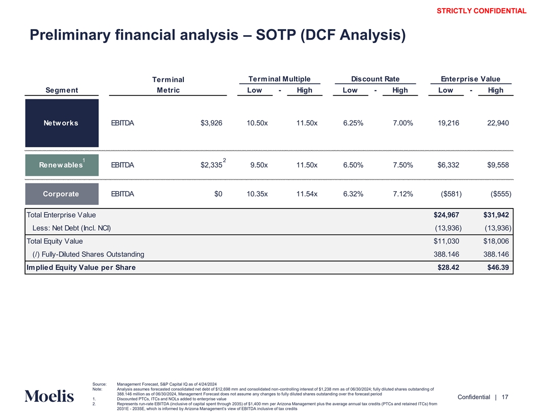 严格保密的初步财务分析– SOTP(DCF分析)终端多重贴现率企业价值终端细分指标低-高-低-高-高网络EBITDA $ 3,926 10.50x 11.50x 6.25% 7.00% 19,21622,94012可再生能源EBITDA $ 2,335 9.50x 11.50x 6.50% 7.50% $ 6,332 $ 9,558企业EBITDA $ 0 10.35x 11.54x 6.32% 7.12%($ 581)($ 555)企业总价值$ 24,967 $ 31,942减:净债务(含NCI)(13,936)(13,936)总股本价值$ 11,030 $ 18,006(/)全面摊薄已发行股份388.146388.146隐含每股权益价值$ 28.42 $ 46.39内容不得为来源:管理层预测,截至2024年4月24日,标普 Capital IQ注:分析假设截至2024年6月30日,预测的综合净债务为12,698美元毫米,综合非控制性权益为1,238美元毫米;截至2024年6月30日,低于这一线的全面摊薄流通股为3.88 146亿股,管理层预测不假设在预测期内全面摊薄流通股有任何变化机密| 17。折价的PTC、ITC和NOL增加了企业价值2。表示运行率EBITDA(包括到2035年所花费的资本)为每份Arizona Management 1400毫米加上2031-2035E的平均年度税收抵免(PTC和留存ITC),这是由Arizona Management对包括税收抵免的EBITDA的看法提供的