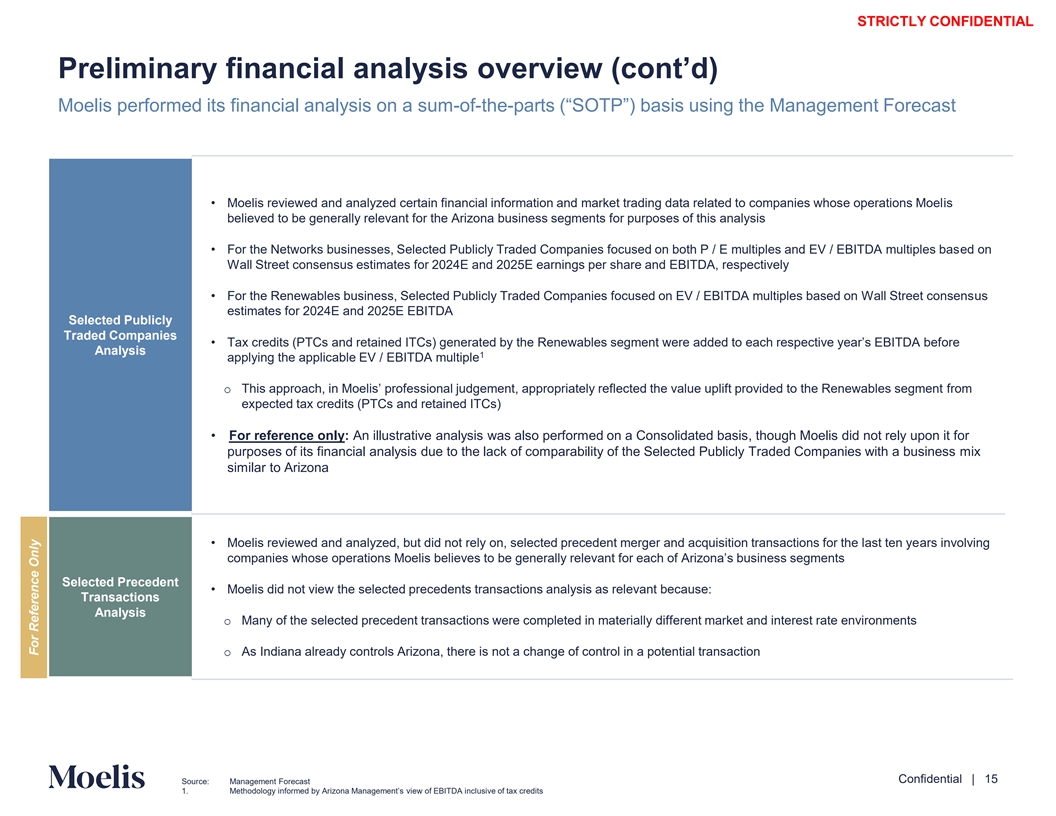 严格保密初步财务分析概览Moelis使用管理层预测以部分加总(“SOTP”)为基础进行财务分析•分析以SOTP为基础进行,以反映亚利桑那州业务部门的不同特征:o(1)网络,其中包括受监管的电力、天然气和组合公用事业业务o(2)可再生能源,其中包括可再生能源发电资产,以及o(3)公司,其中包括公司层面的成本• Moelis在构建其财务分析时运用了专业判断力• DCF分析使用Arizona Management提供的LTO进行• Moelis使用终端倍数法确定终值;终端倍数范围,基于参考适用的选定公开交易公司的当前和历史EV/EBITDA(NTM)倍数,应用于适用的终端年度EBITDA •对于网络和公司部门,终端年度EBITDA代表2035年可再生能源部门的EBITDA •,终端年度调整后EBITDA表示Arizona Management提供的估计运行率EBITDA(反映到2035年的资本支出)加上过去五年在预测期内产生的年度税收抵免(生产税Cred andi ts re ta(“PT inedCs”)1投资税收抵免(“ITCs”))的平均值,这是由公司的会计thvoadology luation me o提供的,根据2024E-2035E预测期内的预测资本支出以及投资与EBITDA生成之间的预期滞后,可再生能源部门在终端年度使用了估计运行率EBITDA •除了在终端价值中包含某些税收抵免外,如上所述,可再生能源部门创造的税收资产通过以下方式被纳入可再生能源DCF分析:o预计在2024年至2035年期间产生的税收抵免(PTC和留存ITC)被纳入无杠杆自由现金流的计算中;贴现现金流(“DCF”)o预计产生的净经营亏损(“NOL”)被单独估值,并被纳入计算o alu f e e nterprise v分析•可再生能源部门的DCF分析需要做出重大判断,因为:o可归属于税收属性的大部分可再生能源价值,受制于未来法定变更或到期,o预测的可再生能源资本支出相对于历史水平显着增加,包括管理层预测中的240亿美元资本支出,导致到2035年的累计自由现金流为负,终值超过可再生能源部门DCF值的100%,o与可再生能源部门项目相关的重大风险,包括但不限于运营风险、财务风险、土地和场地控制风险、与电网互联相关的风险、承购方风险、供应链风险、监管风险、技术风险,环境风险和市场条件的变化o计划中的可再生能源部门资本计划的重大变化可能会对DCF分析所暗示的价值产生重大影响• Moelis运用其专业判断来平衡之前提到的进行分析的考虑因素,包括终值方法和税收抵免的处理•对于企业部门,Moelis使用加权平均(基于EBITDA贡献的加权)倍数范围基于从网络和可再生能源业务分部的选定公开交易公司内容不得低于此线机密| 14来源:管理层预测1。方法由Arizona Management对EBITDA(包括税收抵免)的看法提供