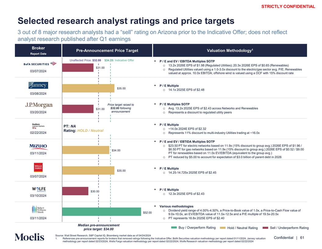 严格保密选定的研究分析师评级和目标价主要研究分析师中有3位在指示性要约之前对亚利桑那州给予“卖出”评级;不反映第一季度收益后发布的分析师研究经纪商1公布前价格目标估值方法报告日期不受影响价格:32.08美元34.25美元:指示性要约▪ P/E和EV/EBITDA倍数SOTP o 13.2x 2026E EPS为1.98美元(受监管公用事业);20.3x 2026E EPS为0.65美元(可再生能源)3.00美元o受监管公用事业估值使用电力/天然气行业平均1.0-3.0x折扣。P/E;Renewables 03/07/2024估值约为10.0倍EBITDA;海上风电采用DCF估值,贴现率为15% ▪ P/E倍数35.00美元o 14.1x 2025E EPS为2.4803/08/2024美元▪ P/E倍数SOTP目标价上调至32.00美元,此前为o平均。13.2x 2025E EPS为2.43美元跨网络和可再生能源3.00美元公告03/20/2024 o较受监管公用事业同行折让▪ P/E倍数PT:NA o~14.0x 2024E EPS为2.32美元评级:持有/中性02/22/2024 o较多行业公用事业交易折让11%~16.0x ▪ P/E和EV/EBTIDA乘数SOTP o 23.50美元PT电力网络基于11.9倍(集团平均折让15%)2026年EPS为1.96美元/6.50美元PT天然气网络基于11.9倍(集团平均折让15%)2026年EPS为0.52美元/9.00美元34.00美元PT可再生能源基于11.0倍EV/EBITDA(相当于集团平均)03/11/2024 o PT减少5.00美元到账对2026年30亿美元母债的预期▪ P/E倍数35.00美元o 14.25-14.725x 2025E EPS为2.4503/07/2024 ▪ P/E倍数30.00美元o 12.3x 2025E EPS为2.4303/10/2024 ▪各种方法o股息收益率区间为4.00%-4.50 %,市净率为1.0x,市净率为52.00美元9.0x-10.0x,EV/EBITDA值为11.5x-12.5x,市盈率为19.5x-20.5x 03/11/2024 o PT代表18.8x 2025E EPS为2.40美元公告前买入/跑赢大市评级持有/中性评级卖出/跑输大市评级目标价:34.00美元内容不得低于这条线资料来源:华尔街研究,标普 Capital IQ,彭博市场数据截至2024年4月24日机密| 611。参考根据指示性要约删除评级的经纪商的公告前报告;日期为0 1/11/2024的每份报告的美国银行证券估值方法、日期为02/23/2024的每份报告的Janney估值方法、日期为02/22/2024的每份报告的富国银行估值方法;日期为02/22/2024的每份报告的Wolfe Research估值方法