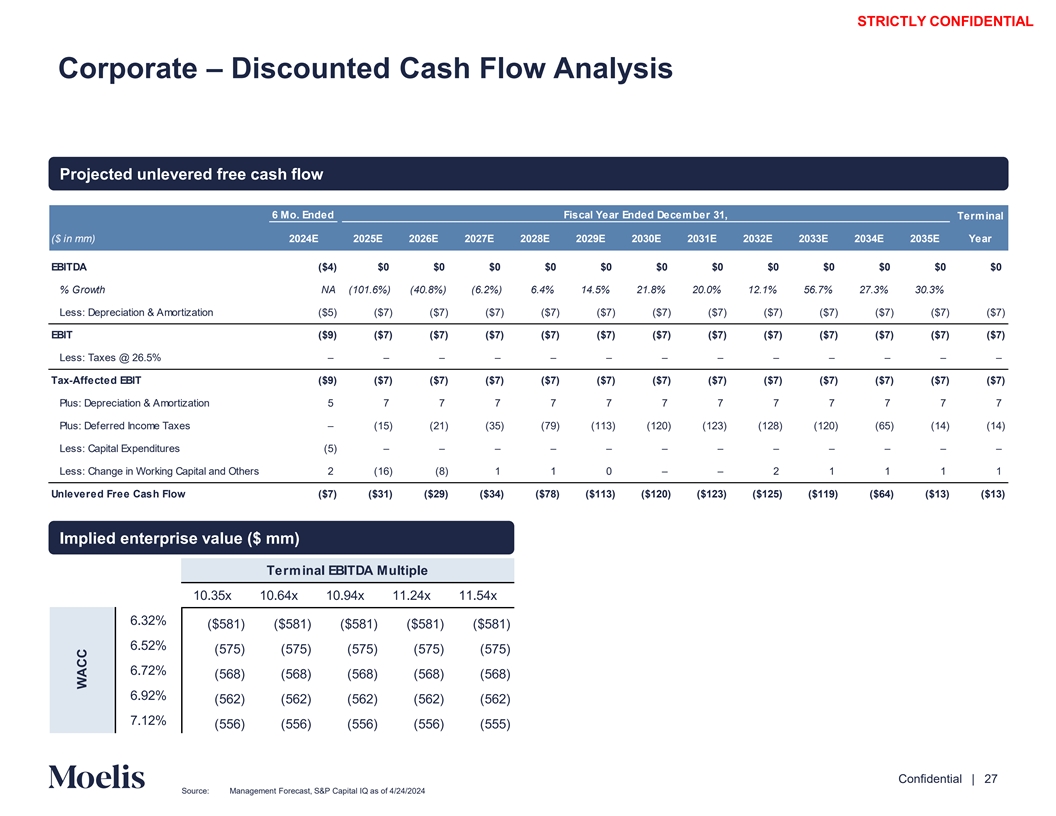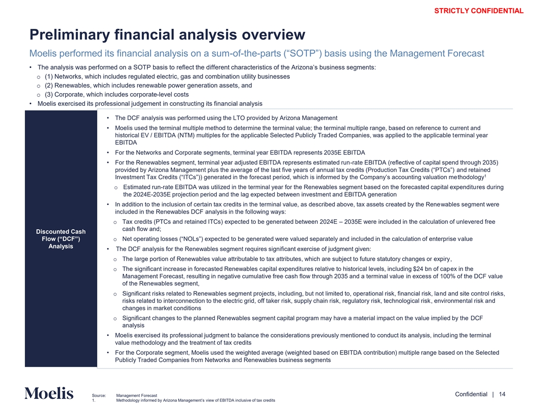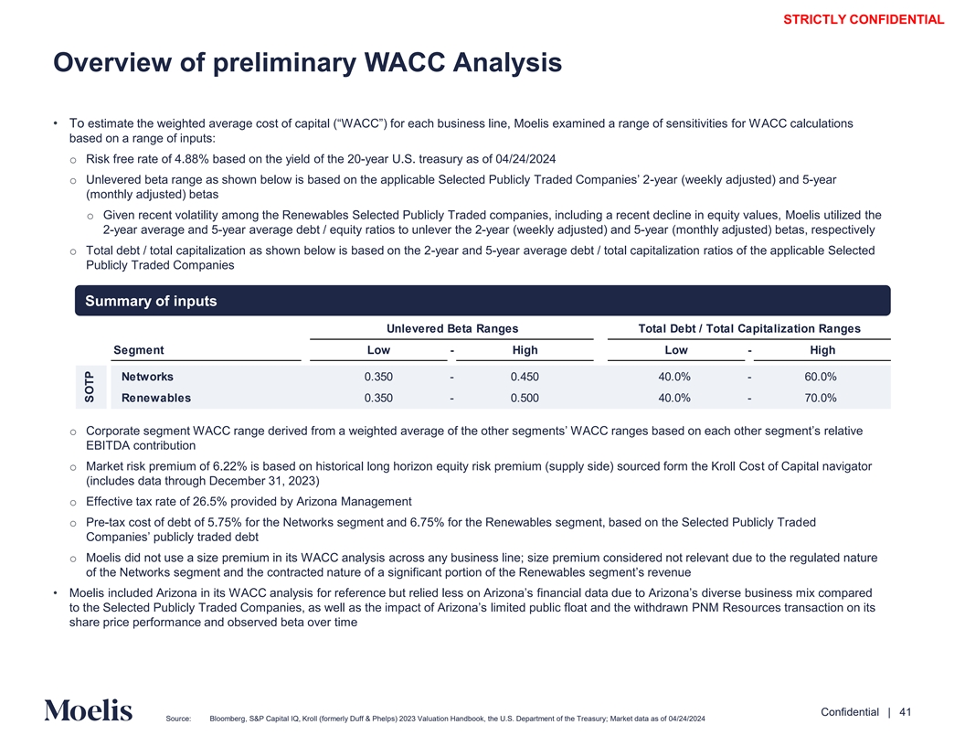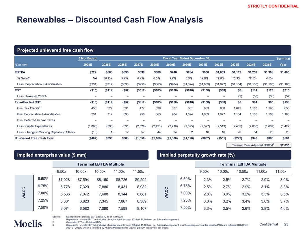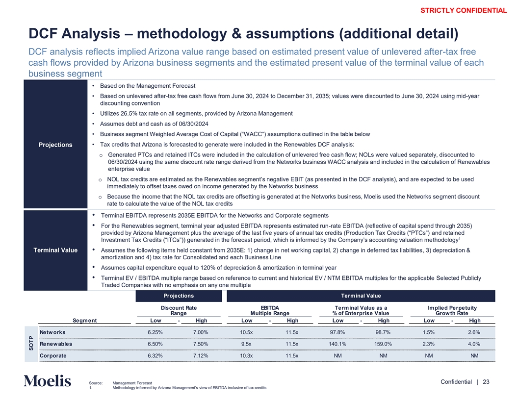 严格保密的DCF分析–方法和假设(更多详细信息)DCF分析反映了基于亚利桑那州业务分部提供的无杠杆税后自由现金流的估计现值和每个业务分部的终值估计现值的隐含亚利桑那州价值范围•基于管理层预测•基于2024年6月30日至2035年12月31日的无杠杆税后自由现金流;价值采用年中贴现惯例贴现至2024年6月30日•对所有分部采用26.5%的税率,由Arizona Management提供•假设截至2024年6月30日的债务和现金•下表中概述的业务部门加权平均资本成本(“WACC”)假设•亚利桑那州预测产生的税收抵免被纳入可再生能源DCF分析:预测o产生的PTC和保留的ITC被纳入无杠杆自由现金流的计算;NOL被单独估值,折现至2024年6月30日,使用由网络业务WACC分析得出并计入可再生能源企业价值计算的相同贴现率范围o NOL税收抵免估计为可再生能源部门的负息税前利润(如DCF分析中所示),并立即向a bre eue sx ep de cted以抵消网络业务产生的收入所欠税款o因为NOL税收抵免正在抵消的收入是在网络业务产生的,Moelis使用网络部门贴现率来计算NOL税收抵免的价值•终端EBITDA代表网络和企业部门2035年EBITDA •对于可再生能源部门,终端年度调整后EBITDA代表由Arizona Management提供的估计运行率EBITDA(反映到2035年的资本支出)加上预测期内产生的过去五年年度税收抵免(生产税Cred andi ts re ta(“PT inedCs”)1投资税收抵免(“ITCs”))的平均值,这是由公司的会计thvoal do ua logtion y me终值•假设从2035年起保持不变的以下项目:1)净营运资本的变化,2)递延所得税负债的变化,3)折旧&摊销及4)合并及各业务线税率•假设资本支出等于终端年度折旧&摊销的120% •终端EV/EBITDA倍数区间基于参考当前和历史EV/NTM EBITDA倍数适用的选定公开交易公司不强调任何一个倍数预测终值贴现率EBITDA终值作为隐含的永续范围倍数范围%企业价值增长率段低-高-低-高-低-高-网络6.25% 7.00% 10.5x 11.5x 97.8% 98.7% 1.5% 2.6%可再生能源6.50% 7.50% 9.5x 11.5x 140.1% 159.0% 2.3% 4.0%公司6.32% 7.12% 10.3x 11.5x NM NM NM含量不得低于此线机密| 23资料来源:管理层预测1。方法由Arizona Management对EBITDA包括税收抵免SOTP的看法提供