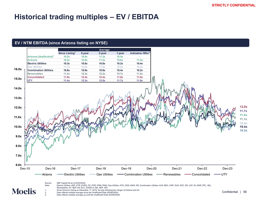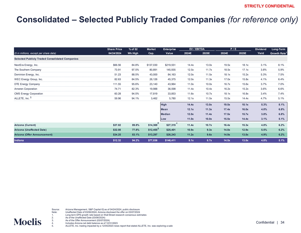 严格保密合并–精选公开交易公司(仅供参考)EV/EBITDA P/E股价% 52市场企业股息长期1(百万美元,每股数据除外)04/24/2024 WK High Cap。Value 2024E 2025E 2024E 2025E Yield Growth Rate Selected Publicly Traded Consolidated Companies NextEra Energy,Inc. $ 66.56 84.8% $ 137,030 $ 219,551 14.4x 13.0x 19.5x 18.1x 3.1% 8.1% 南方电力公司 73.9 197.5% 80,891145,935 12.5x 11.7x 18.5x 17.1x 3.8% 5.9%丨道明能源公司道明尼能源公司 51.2388.5% 43,00084,16312.0x 11.5x 18.1x 15.2x 5.3% 7.5% WEC能源集团,Inc. 82.6384.5% 26,12645,37512.0x 11.3x 17.0x 15.8x 4.1% 6.4% DTEEnergy Company 111.5595.6% 23,14043,96411.0x 10.0x 16.7x 15.6x 3.7% 7.0% Ameren Corporation 74.7 18 2.3% 19,98836,59811.4x 10.4x 16.2x 15.2x 3.6% 6.6% Cms Energy Corporation 60.2894.5% 17,81933,85311.6x 10.7x 18.1x 16.8x 3.4% 7.4% 5 ALLETE,Inc. 59.96 94.1% 3,4625,780 12.1x 11.5x 15.5x 14.4x 4.7% 5.1%高14.4x 13.0x 19.5x 18.1x 5.3% 8.1%均值12.1x 11.3x 17.4x 16.0x 4.0% 6.8%中值12.0x 11.4x 17.5x 15.7x 3.8% 6.8%低11.0x 10.0x 15.5x 14.4x 3.1% 5.1% 24 Arizona(current)$ 37.02 89.8% $ 14,369 $ 27,315 11.4x 10.7x 16.4x 15.3x 4.8% 6.2% 3 Arizona(unaffected date)$ 32.08 77.8% $ 12,455 $ 25,401 10.9x 9.3x 14.0x 12.9x 5.5% 6.2% Arizona(offer announcement)$ 34.2583.1% $ 13,297 $ 26,24311.2x 9.6x标普 Capital IQ截至2024年4月24日,公开披露注:未受影响的日期为2024年3月6日;Arizona于2024年3月7日披露的要约内容不得为1。基于华尔街研究一致预期的长期EPS增长率2。截至不受影响的日期(03/06/2024)低于本线3。截至要约公告(03/07/2024)机密| 344。包括截至2023年12月31日的亚利桑那州净债务余额5。ALLETE,Inc.的交易受到12/05/2023新闻报道的影响,该报道称ALLETE,Inc.正在探索出售