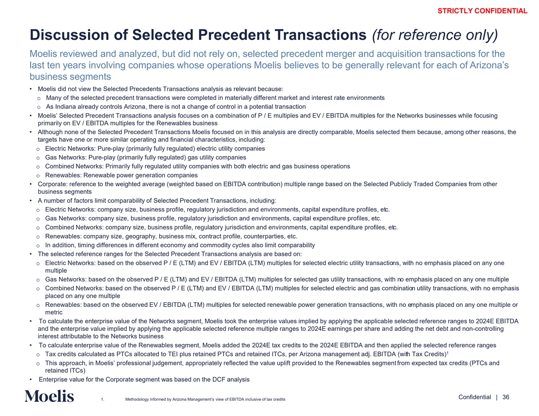 对选定先例交易的严格保密讨论(仅供参考)Moelis审查和分析了但不依赖于过去十年的选定先例并购交易,涉及的公司的运营被Moelis认为与亚利桑那州的每个业务部门大体相关• Moelis不认为选定先例交易分析具有相关性,因为:o许多选定先例交易是在截然不同的市场和利率环境中完成的o由于印第安纳州已经控制亚利桑那州,潜在交易中不存在控制权变更• Moelis的Selected Precedent Transactions分析侧重于P/E倍数和EV/EBITDA e m Nult etw iples ork的FBU或stine h sses,同时主要关注可再生能源业务的EV/EBITDA倍数•尽管本分析中重点关注的Selected Precedent Transactions中没有任何一项具有直接可比性,但是Moelis之所以选择它们,是因为,除其他原因外,目标具有一项或多项相似的经营和财务特征,包括:o Electric Networks:纯业务(主要是完全监管的)电力公用事业公司o Gas Networks:纯业务(主要是完全监管的)燃气公用事业公司o Combined Networks:主要是完全监管的同时拥有电力和燃气业务运营的公用事业公司o Renewables:可再生能源发电公司• Corporate:参考基于其他业务部门的选定公开交易公司的加权平均(根据EBITDA贡献加权)倍数范围•一些因素限制了选定先例交易的可比性,包括:o Electric Networks:公司规模、业务概况、监管管辖范围和环境、资本支出概况等o Gas Networks:公司规模,业务概况、监管管辖和环境、资本支出概况等o组合网络:公司规模、业务概况、监管管辖和环境、资本支出概况等o可再生能源:公司规模、地域、业务组合、合同概况、交易对手等o此外,不同经济和商品周期的时间差异也限制了可比性•选定先例交易分析的选定参考范围基于:o Electric Networks:基于观察到的选定电力公用事业交易的P/E(LTM)和EV/EBITDA(LTM)倍数,不强调任何一个多o燃气网络:基于观察到的选定燃气公用事业交易的P/E(LTM)和EV/EBITDA(LTM)倍数,不强调任何一个多o组合网络:基于观察到的选定电力和燃气组合公用事业交易的P/E(LTM)和EV/EBITDA(LTM)倍数,不强调任何一个多o可再生能源:基于观察到的选定可再生能源发电交易的EV/EBITDA(LTM)倍数,没有强调任何一个倍数或指标•为了计算网络业务部门的企业价值,Moelis采用了将适用的选定参考范围应用于2024年EBITDA所隐含的企业价值,以及将适用的选定参考倍数范围应用于2024年每股收益并加上归属于网络业务的净债务和非控股权益所隐含的企业价值•计算可再生能源业务部门的企业价值,Moelis将2024年税收抵免添加到2024年EBITDA中,然后应用选定的参考范围1 o按照亚利桑那州管理层调整后的EBITDA(含税收抵免)计算的税收抵免,计算方式为分配给TEI的PTC加上保留的PTC和保留的ITC o这种方法,根据Moelis的专业判断,适当地反映了从s ex egpe me cn ted t税收抵免(PTC和保留ITC)中为Renewab le提供的价值提升•企业部门的企业价值基于DCF分析内容不得低于此行机密| 361。方法由Arizona Management对EBITDA包括税收抵免的看法提供
