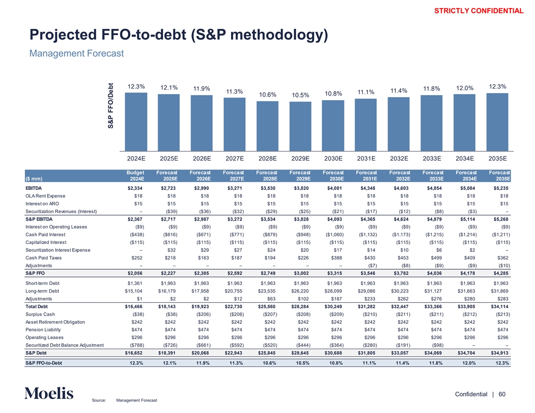 严格保密预计FFO比债务(标普方法)管理层预测2.3 2.32。2.0 .9 ..4 .3 .0.0.0.52024e2025e202 e2027e202 e2029e2030e203 e2032e2033e2034e2035eBudget forecast forecast forecast forecast forecast forecast forecast forecast forecast forecast forecast forecast forecast forecast forecast forecast($ mm)2024e2025e2026e2027e2028e2029e2030e2031e2032e2033e2034e2035eEBITDA $ 2,334 $ 2,723 $ 2,990 $ 3,271 $ 3,530 $ 3,820 $ 4,081 $ 4,348 $ 4,603 $ 4,854 $ 5,235 OLA租金费用$ 18 $ 18 $ 18 $ 18 $ 18 $ 18 $ 18– 标普 EBITDA 2,367美元2,717美元2,987美元3,272美元3,534美元3,828美元4,093美元4,365美元4,624美元4,879美元5,114美元5,268美元经营租赁利息(9美元)(9美元)(9美元)(9美元)(9美元)(9美元)(9美元)(9美元)(9美元)(9美元)(9美元)(9美元)(9美元)(9美元)(9美元)现金支付利息(438美元)(616美元)(671美元)(771美元)(879美元)(948美元)(1060美元)(1132美元)(1173美元)(1215美元)(1214美元)(1211美元)资本化利息(115美元)(115美元)(($ 8)($ 9)($ 9)($ 10)标普 FFO 2,056美元2,227美元2,385美元2,592美元2,749美元3,002美元3,315美元3,546美元3,782美元4,036美元4,178美元4,285美元短期债务1,361美元1,963美元1,963美元1,963美元1,963美元1,963美元1,963美元1,963美元1,963美元1,963美元1,963美元长期债务15,104美元16,179美元17,958美元20,755美元23,535美元26,220美元28,099美元29,086美元30,223美元31,127美元31,663美元31,869美元调整1美元2美元12美元63$ 242 $ 242 $ 242养恤金负债$ 474 $ 474 $ 474 $ 474 $ 474 $ 474 $ 474 $ 474 $ 474 $ 474 $ 474 $ 474 $ 474 $ 474经营租赁$ 296 $ 296 $ 296 $ 296 $ 296 $ 296 $ 296 $ 296 $ 296 $ 296 $ 296 $ 296 $ 296 $ 296 $ 296证券化债务余额调整($ 788)($ 726)($ 661)($ 592)($ 520)($ 444)($ 364)($ 280)($ 191)($ 98)– – 标普债$ 16,652 $ 18,391 $ 20,068 $ 22,943 $ 25,845 $ 28,645 $ 30,688 $ 31,805 $ 33,0