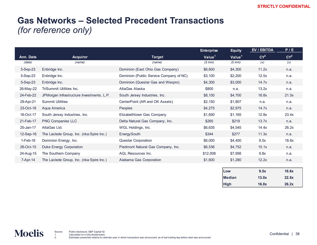 严格保密燃气网络–选定的先例交易(仅供参考)EV/EBITDA P/E企业股权1122 Ann。日期收购目标价值CY CY(date)(name)(name)($ mm)($ mm)(x)(x)5-Sep-23 Enbridge Inc. Dominion(East Ohio Gas Company)$ 6,600 $ 4,300 11.2x n.a. 5-Sep-23 南新州煤气TERM3,JPMorgan Infrastructure Investments,L.P. South Jersey Industries,JPMorgan Infrastructure Investments,L.P. 3,100美元2,200美元12.5x n.a. 5-Sep-23,4,300美元3,000美元14.7x n.a. 26-May-22 TriSummit Utilities Inc. AltaGas Alaska $ 800 n.a. 13.2x n.a. 24-Feb-22,Inc. $ 8,100 $ 4,700 16.8x 21.5x 29-Apr-21 Summit Utilities CenterPoint(AR和OK Assets)$ 2,150 $ 1,807 n.a. n.a. 23-Oct-18 Aqua America Peoples $ 4,275 $ 2,975 14.7x n.a. 16-Oct-17 South Jersey Industries, Inc. Elizabethtown Gas Company $ 1,690 $ 1,165 12.8x 23.4x 21-Feb-17 PNG Companies LLC丨Delta Natural Gas Company,Inc.丨$ 260 $ 219 13.7x n.a. 25-Jan-17 AltaGas Ltd. WGL控股,Inc. $ 6,635 $ 4,545 14.4x 26.2x 12-Sep-16 The Laclede Group,Inc.(NKA:Inc. $ 6,536 $ 4,752 15.1x n.a. 24-Aug-15 南方电力公司尼科 Inc. $ 12,008 $ 7,956 9.8x n.a. 7-Apr-14 The Laclede Group,Inc.(nka:Spire Inc.)Alabama Gas Corporation $ 1,600 $ 1,280 12.2x n.a. low 9.5x 18.6x Median 13.0x 22.5x High 16.8x 26.2x Content must not go below this line Source:public disclosure,TERM0标普 Capital IQ Confidential | 381。按全面摊薄计算2。截至交易宣布前最后一个交易日,相对于宣布交易的日历年提出的估计