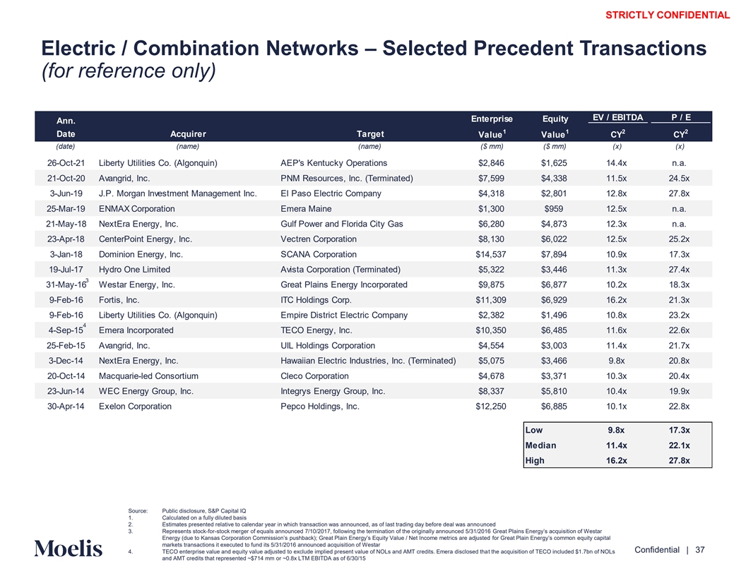 严格保密电气/组合网络–选定的先例交易(仅供参考)EV/EBITDA P/E企业股权Ann。1122日期收购方目标价值CY CY(date)(name)(name)($ mm)($ mm)(x)(x)26-Oct-21 Liberty Utilities Co.(Algonquin)AEP在肯塔基州的业务$ 2,846 $ 1,625 14.4x n.a. 21-Oct-20 TERM0PNM电力瓦斯,Inc.(terminated)$ 7,599 $ 4,338 11.5x 24.5x 3-Jun-19 J.P. Morgan Investment Management Inc. TERM0 Electric Company El Paso Electric CompanyTERM3 $ 4,318 $ 2,801 12.8x 27.8x 25-Mar-19 ENMAX Corporation Emera Maine $ 1,300 $ 959 12.5x n.a. 21-May-18 NextEra Energy,Inc. Gulf Power and Florida City GasInc. SCANA Corporation $ 14,537 $ 7,894 10.9x 17.3x 19-Jul-17 Hydro One Limited Avista Corporation(已终止)$ 5,322 $ 3,446 11.3x 27.4x 3 31-May-16丨Westar Energy,Inc. 丨Great Plains Energy Incorporated $ 9,875 $ 6,877 10.2x 18.3x 9-Feb-16 Fortis,Inc. ITC控股 Corp. $ 11,309 $ 6,929 16.2x 21.3x 9-Feb-16 Liberty Utilities Co.(Algonquin)Empire District Electric Company $ 2,382 $ 1,496 10.8x 23.2x 4 4-Sep-15 Emera Incorporated TECO Energy,Inc. $ 10,350 $ 6,48511.6x 22.6x 25-Feb-15Inc.(已终止)$ 5,075 $ 3,466 9.8x 20.8x 14年10月20日Macquarie牵头的财团Cleco Corporation $ 4,678 $ 3,371 10.3x 20.4x 14年6月23日丨WEC能源集团,Inc. 英迪斯能源集团 $ 8,337 $ 5,810 10.4x 19.9x 14年4月30日爱克斯龙公司波托马克控股公司 $ 12,250 $ 6,885 10.1x 22.8x低9.8x 17.3x中值11.4x 22.1x高16.2x 27.8x资料来源:公开披露,标普 Capital IQ 1。按全面摊薄计算2。相对于宣布交易的日历年提出的估计,截至宣布交易前的最后一个交易日内容不得3。代表2017年7月10日宣布的股票换股票合并,此前终止了最初宣布的2016年5月31日reat Plains Energy对西星能源的收购(由于ansas Corporation Commission的反对);reat Plain Energy的股权价值/净收入衡量a forre a redajut ste Pldain Energy的普通股资本低于其为资助其2016年5月31日宣布的对Westar的收购而执行的市场交易机密| 374。东元企业价值和股权价值调整,以排除NOL和AMT信用的隐含现值。Emera披露,收购TECO包括17亿美元的NOL和AMT信贷,截至2015年6月30日,这代表约714美元毫米或约0.8倍LTM EBITDA
