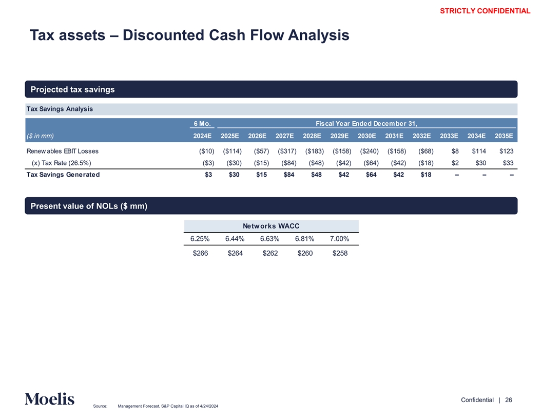 严格保密的税收资产–贴现现金流分析预计税收节省税收节省分析6个月。截至12月31日的财政年度,($ in mm)2024e 2025e 2026e 2027e 2028e 2029e 2030e 2031e 2032e 2033e 2034e 2035e Renew ables EBIT亏损($ 10)($ 114)($ 57)($ 317)($ 183)($ 158)($ 240)($ 158)($ 68)$ 8 $ 114 $ 123(x)税率(26.5%)($ 3)($ 30)($ 15)($ 84)($ 48)($ 42)($ 42)($ 18)$ 2 $ 30 $ 33产生的节税额$ 3 $ 30 $ 15 $ 84 $ 48 $ 42 $ 42 $ 18 – –– NOLs现值($ mm)Networks WACC 6.25% 6.44%截至2024年4月24日的标普 Capital IQ