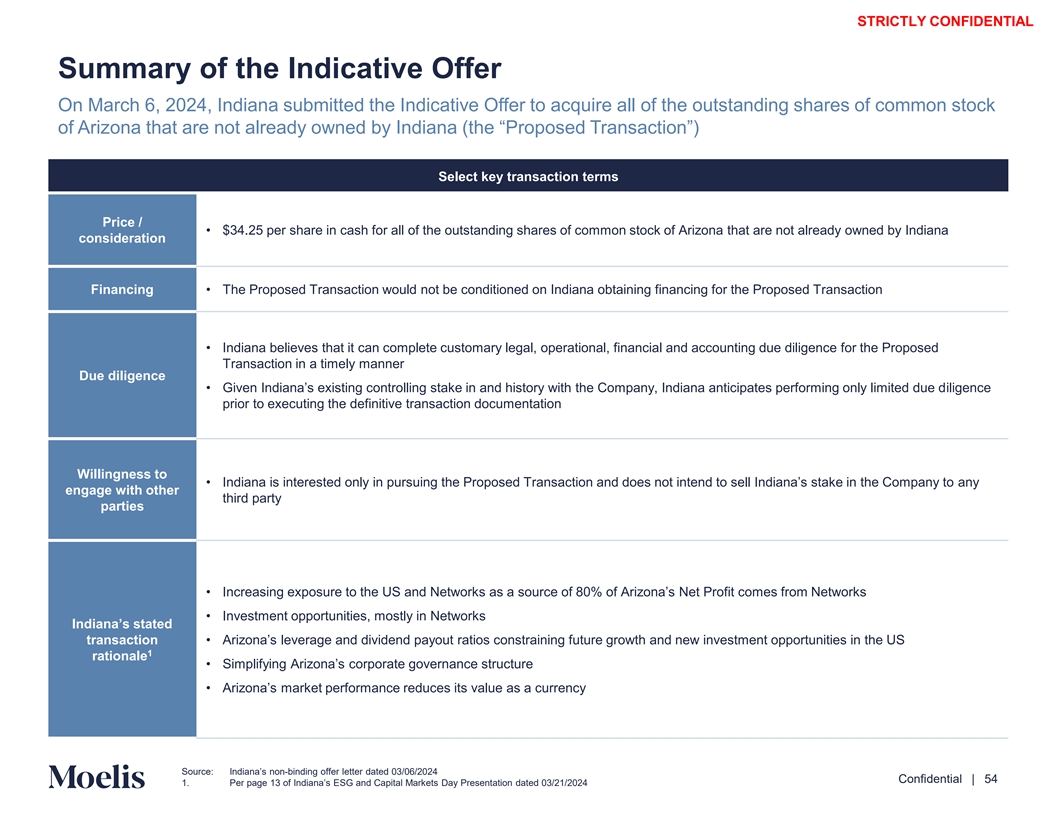 严格保密的指示性要约摘要2024年3月6日,印第安纳州提交了指示性要约,以收购尚未由印第安纳州拥有的亚利桑那州所有已发行普通股(“拟议交易”)选择关键交易条款价格/•以每股34.25美元现金收购尚未由印第安纳州对价融资拥有的亚利桑那州所有已发行普通股•拟议交易将不以印第安纳州为拟议交易获得融资为条件•印第安纳州认为其能够完成习惯法律、运营、及时对拟议交易进行财务和会计尽职调查尽职调查• iven Indiana对公司的现有控股权和与公司的历史,Indiana预计在执行最终交易文件之前仅履行ililim geited nce due d意愿• Indiana仅对进行拟议交易感兴趣,不打算出售Indiana在an y公司的股份以与其他第三方接洽•增加对美国和Networks的敞口,因为亚利桑那州净利润的0来源来自Networks •投资机会,主要在Networks Indiana的声明交易•亚利桑那州的杠杆和股息支付率限制了美国未来的增长和新的投资机会1理由•简化亚利桑那州的公司治理结构•亚利桑那州的市场表现降低了其作为货币的价值内容不得低于此线来源:Indiana日期为03/06/2024的非约束性要约函机密| 541。根据2024年2月3日印第安纳州ES和资本市场日演讲的第3页