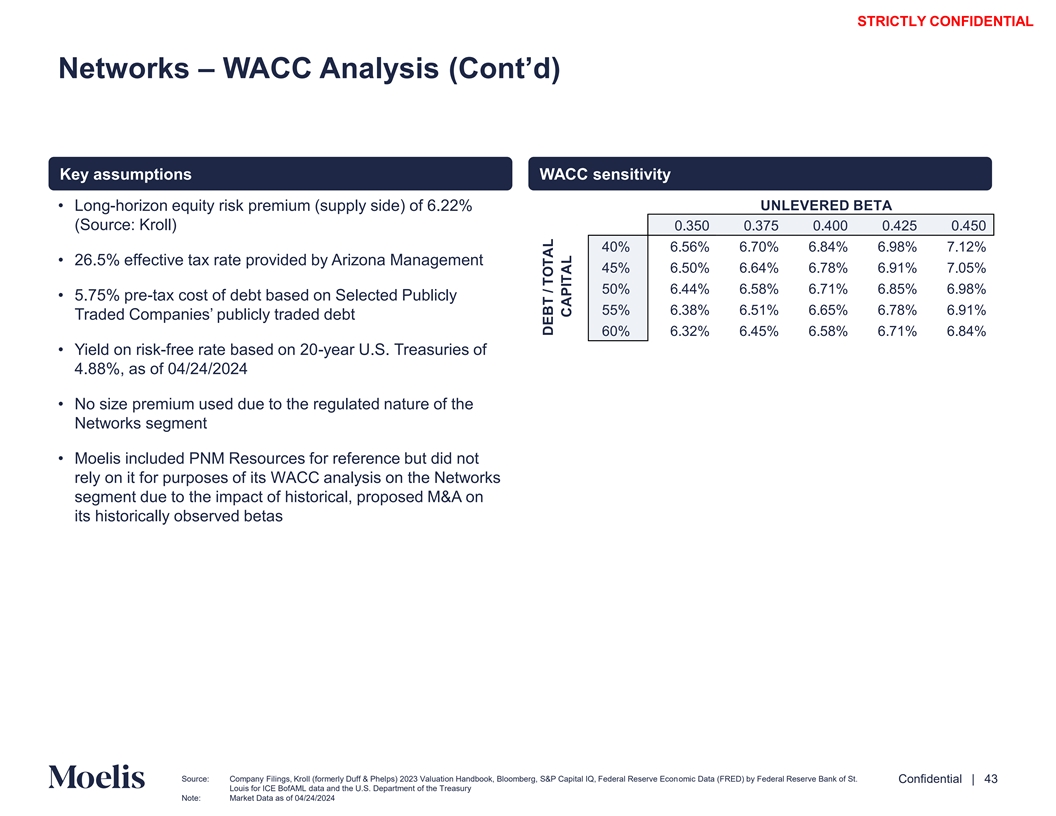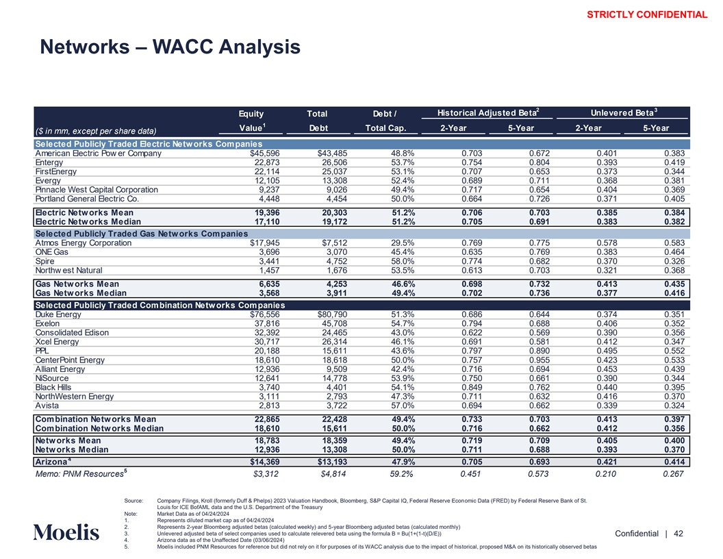 严格保密网络– WACC分析23历史调整Beta无杠杆Beta股权总债务/1价值债务总上限。2年5年2年5年($ in mm,除每股数据外)选定公开交易的电力网络公司American Electric POW ER Company $ 45,596 $ 43,48548.8% 0.70 30.67 20.40 10.383 安特吉 22,87326,50653.7% 0.75 40.80 40.39 30.4 19 FirstEnergy 22,11425,03753.1% 0.70 70.65 30.37 30.34 4 Evergy 12,10513,30852.4% 0.68 90.71 10.368 0.381 波特兰通用电气 Co. 4,4484,45450.0% 0.66 40.72 60.37 10.405 Electric Networks mean 19,39620,30351.2% 0.70 60.70 30.38 50.384 Electric Networks Median 17,11019,1720.76 90.77 50.57 80.583 ONE Gas 3,6963,07045.4% 0.63 50.76 90.38 30.464 Spire 3,4414,75258.0% 0.77 40.68 20.3700.326 NorthW est Natural 1,4571,6765 3.5% 0.61 30.70 30.32 10.368 Gas Networks mean 6,6354,25346.6% 0.69 80.73 20.41 30.43 5 Gas Networks Median 3,5683,91149.4% 0.70 20.73 60.37 40.41 6 Selected publicly traded combination networks companies 杜克能源 $ 76,556 $ 80,79051.3% 0.68 60.64 40.37 40.351 爱克斯龙 37,81645,70854.7% 0.79 40.68 80.40 60.352 爱迪生联合电气 320.552 CenterPoint Energy 18,61018,61850.0% 0.75 70.95 50.42 30.53 3 美国联合能源 12,9369,50942.4% 0.71 60.69 40.45 30.43 9 NiSource 12,64114,77853.9% 0.7500.66 10.3900.34 4 Black Hills 3,7404,40154.1% 0.84 90.76 20.4400.395 Northwestern Energy 3,1112,79347.3% 0.71 10.63 20.41 60.370 丨阿维斯塔 2,8133,72257.0% 0.69 40.66 20.33 90.324组合网络均值22,86522,42849.4% 0.73 30.70 30.41 30.397组合网络中值18,61015,61150.0% 0.71 60.66 20.41 20.356网络均值18,78318,35949.4% 0.71 90.70 90.40 50.4000.41 45备忘:PNM电力瓦斯 3,312美元4,81459.2% 0.45 10.57 30.2 100.267资料来源:公司备案,Kroll(前身为达夫菲尔普斯)2023估值手册,彭博,标普 Capital IQ,Federal Reserve Economic Data(FRED)by Federal Reserve Bank of St. Louis for ICE BoFAML data and US Department of the Treasury Note:Market Data as of 04/24/2024 content must not 1。表示截至2024年4月24日的稀释后市值低于这条线2。代表2年期彭博调整后beta(按周计算)和5年期彭博调整后beta(按月计算)3。使用公式B = Bu(1 +(1-t)(D/E))计算相关beta的精选公司的无杠杆调整beta机密| 424。截至未受影响日期(03/06/2024)的亚利桑那州数据5。Moelis将PNM电力瓦斯纳入参考,但由于历史、拟议并购对其历史观察到的贝塔系数的影响,其WACC分析并不依赖它