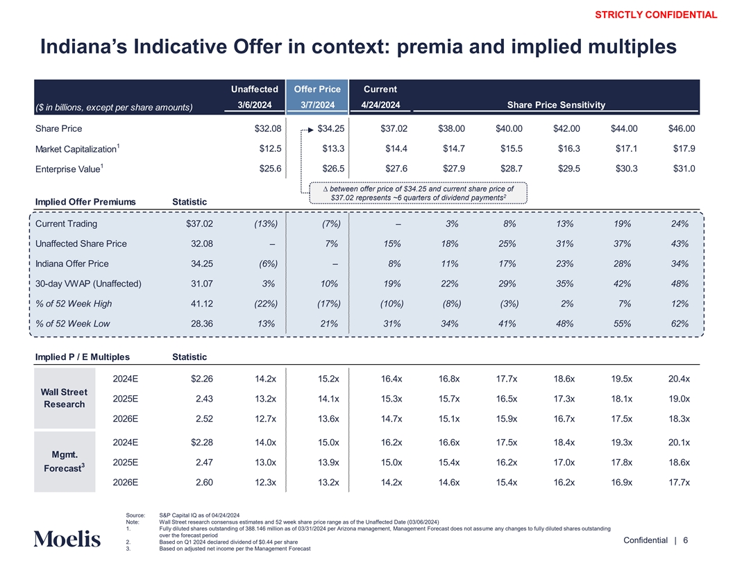 严格保密Indiana在上下文中的指示性要约:溢价和隐含倍数未受影响的要约价格当前3/6/20243/7/20244/24/2024股价敏感性(十亿美元,每股金额除外)股价$ 32.08 $ 34.25 $ 37.02 $ 38.00 $ 40.00 $ 42.00 $ 44.00 $ 46.00 1 $ 12.5 $ 13.3 $ 14.4 $ 14.7 $ 15.5 $ 16.3 $ 17.1 $ 17.9市值1企业价值$ 25.6 $ 26.5 $ 27.6 $ 27.9 $ 28.7 $ 29.5 $ 30.3 $ 31.0丨介乎招股价$ 34.25当前股价2 $ 37.02代表约6个季度的股息支付隐含要约溢价统计当前交易$ 37.02(13%)(7%)– 3% 8% 13% 19% 24%未受影响股价32.08 – 7% 15% 18% 25% 31% 37% 43%印第安纳州发售价34.25(6%)– 8% 11% 17% 23% 28% 34% 30天VWAP(未受影响)31.07% 10% 19% 22% 29% 35% 42% 42% 48% 48% 52周高点41.12(22%)(17%)(10%)(8%)(3%)2% 7% 12% % 52周低点28.36 13% 21% 31% 34% 41% 48% 55% 62%隐含市盈率统计2024E $ 2.2614.2x 15.2x 16.4x 16.8x 17.7x 18.6x 19.5x 20.4x华尔街2025E 2.43 13.2x 14.1x 15.3x 15.7x 16.5x 17.3x 18.1x 19.0x研究2026E 2.52 12.7x 13.6x 14.7x 15.1x 15.9x 16.7x 17.5x 18.3x 2024E $ 2.28 14.0x 15.0x 16.2x 16.6x 17.5x 18.4x 19.3x 20.1x MGMT。2025E 2.47 13.0x 13.9x 15.0x 15.4x 16.2x 17.0x 17.8x 18.6x 3预测2026E 2.60 12.3x 13.2x 14.2x 14.6x 15.4x 16.2x 16.9x 17.7x资料来源:截至2024年4月24日的标普 Capital IQ内容不得注明:截至未受影响日期(03/06/2024)的华尔街研究一致估计和52周股价区间1。根据亚利桑那州管理层的说法,截至2024年3月31日,完全稀释后的流通股为3.88 146亿股,管理层预测不假设在预测期内完全稀释后的流通股有任何变化低于这一线机密| 62。基于2024年第一季度宣布的每股股息0.44美元3。基于管理层预测的调整后净收入