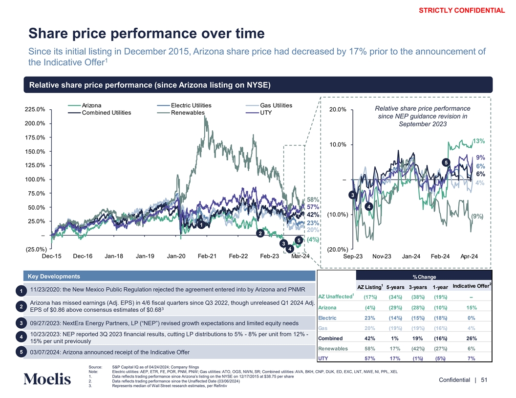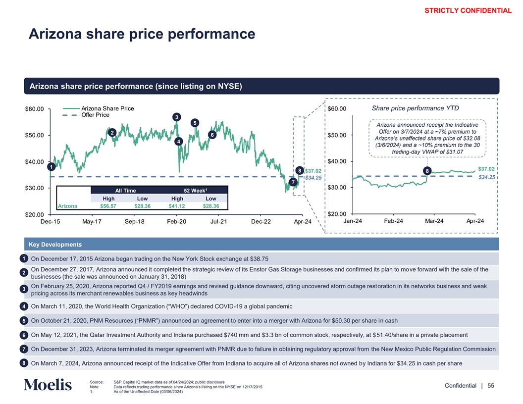 严格保密Arizona股价表现Arizona股价表现(自纽交所上市以来)年初至今股价表现$ 0.00 Arizona股价$ 0.00发售价35Arizona宣布于2024年3月7日收到指示性要约,溢价约7%至26 $ 50.00 $ 50.00 Arizona未受影响股价$ 32.084(3/6/2024)较30个交易日的VWAP溢价约10%,报31.07美元40.00美元40.00美元1887美元30.00美元30.00美元1全时52周高低位亚利桑那州56.57美元28.36美元41.12美元28.36美元20.00美元20.00美元2月24日、3月24日、4月24日、12月5日、5月7日、9月20日、12月2日、4月24日、关键发展1于2015年12月17日在纽约证券交易所开始交易,价格为38.75美元,亚利桑那州宣布完成对其Enstor储气库业务的战略审查,并确认计划推进出售这2项业务(出售于2018年1月31日宣布)2020年2月25日,亚利桑那州报告了Q4/FY2019的收益并向下修正了指引,称其网络业务中未发现的风暴中断恢复和其商业可再生能源业务中疲软的3定价是关键的逆风4。2020年3月,世界卫生组织(“WHO”)于2020年10月2日宣布-19CO为VID全球大流行5,PNM电力瓦斯(“PNMR”)宣布与Arizona达成合并协议,每股价格为5n0美元。3 CA0s HPS share i 6 2021年5月12日,卡塔尔投资局和印第安纳州分别以51.40美元/股的私募配售7购买了740毫米和33亿美元的普通股2023年12月31日,Arizona因未能在2024年3月7日获得新墨西哥州公共监管委员会的监管批准而终止了与PNMR的合并协议8,Arizona宣布收到Indiana的指示性要约,以每股34.25美元现金收购Indiana非拥有的所有Arizona股份内容不得低于此线来源:标普 Capital IQ截至2024年4月24日的市场数据;公开披露机密| 55注:数据反映了Arizona于2/7/2051在N SE上市以来的交易表现。截至未受影响日期(03/06/2024)
