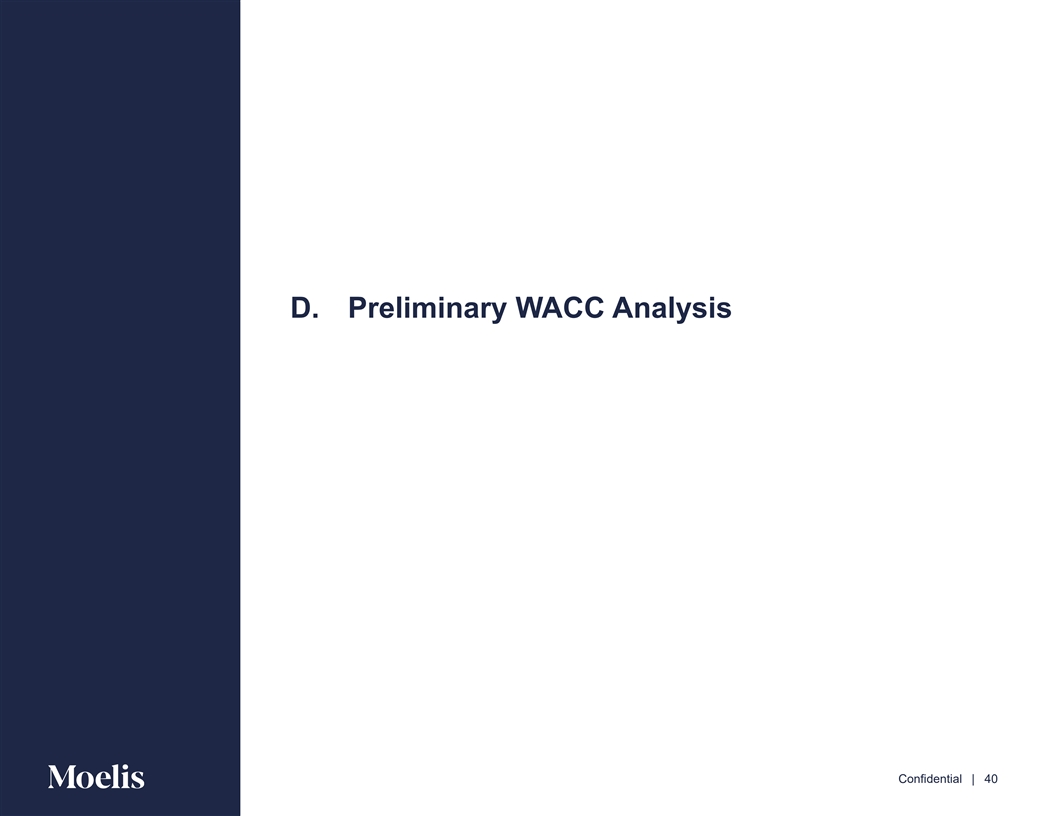 WACC初步分析的严格保密概述•为了估计每个业务线的加权平均资本成本(“WACC”),Moelis根据一系列输入检查了一系列sen ASCC itivi ti ces alc ulfor ation Ws:o无风险利率为4.88%,基于截至2024年4月24日的20年期美国国债收益率o如下所示的无杠杆贝塔范围是基于适用的Selected Publicly Traded Com-yeapa r ni(wes ee’kl2 y adjusted)和5年(按月调整)贝塔o鉴于近期Renewables Selected Publicly Traded Companies之间的波动,包括最近股权价值下降,Moelis利用2年平均和5年平均债务/股权比率来解锁2年期(每周调整后)和5年期(每月调整后)贝塔,分别o如下所示的总债务/总资本是基于2年和适用的选定公开交易公司的5年平均债务/总资本化比率输入汇总无杠杆Beta范围总债务/总资本化范围Segment Low-High Low-High Networks 0.350-0.45040.0%-60.0% Renewables 0.350-0.50040.0%-70.0% o公司部门WACC范围来自其他部门WACC范围的加权平均值,基于每个其他相关部门的EBITDA贡献o 6.22%的市场风险溢价是基于历史长期股权风险溢价(供应方),来源为KROL Cost of Capital Navigator(including截至2023年12月31日的数据)o Arizona Management提供的26.5%的有效税率o网络部门的税前债务成本为5.75%,可再生能源部门为6.75%,基于选定的公开交易公司的公开交易债务o Moelis在其任何业务线的WACC分析中均未使用规模溢价;由于网络部门的监管性质以及可再生能源部门收入的很大一部分的承包性质,规模溢价被认为不相关• Moelis将亚利桑那州纳入其WACC分析中以供参考,但由于与选定的公开交易公司相比存在较大波动,因此较少依赖亚利桑那州的财务数据,以及亚利桑那州有限的公众持股量和撤回urcn es P trNM ansacRes tiono对其股价表现的影响以及随着时间的推移观察到的beta内容不得低于这一线机密| 41资料来源:彭博、标普 Capital IQ、Kroll(前身为达夫菲尔普斯)2023年估值手册,美国财政部;截至04/24/2024 SOTP的市场数据